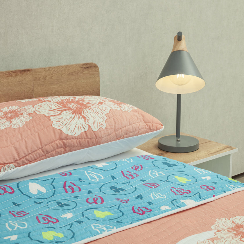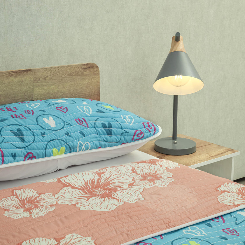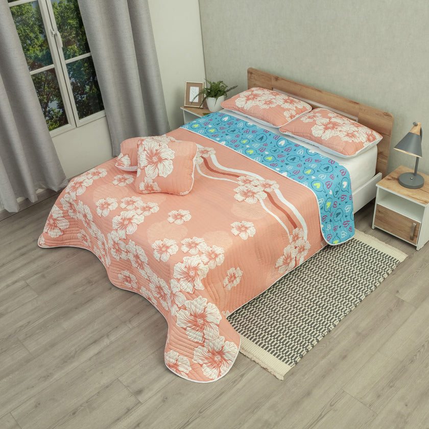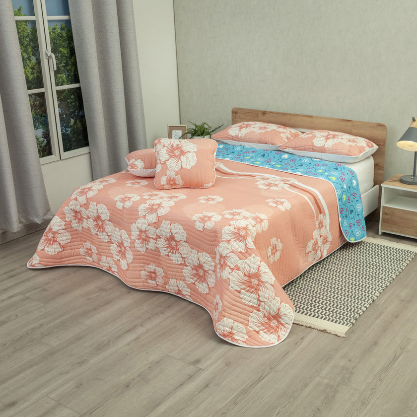 Cubrelecho Estampado Prensado Doble Faz Salmón Azul Patrón Floral