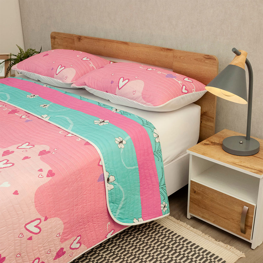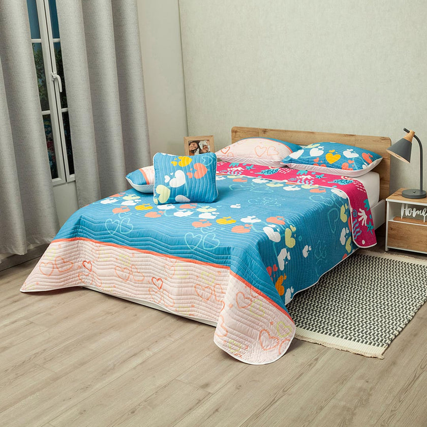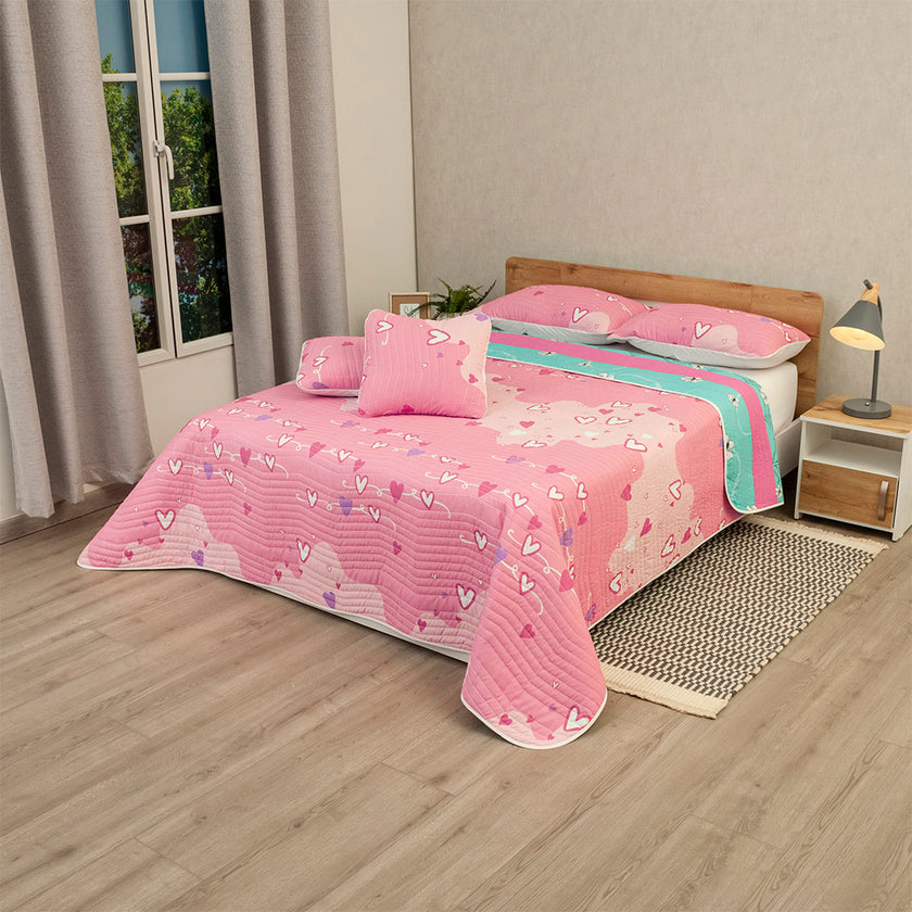 Cubrelecho Tipo Español Doble Faz Corazones Azules Amarillos Blancos Fondo Salmon Confortable