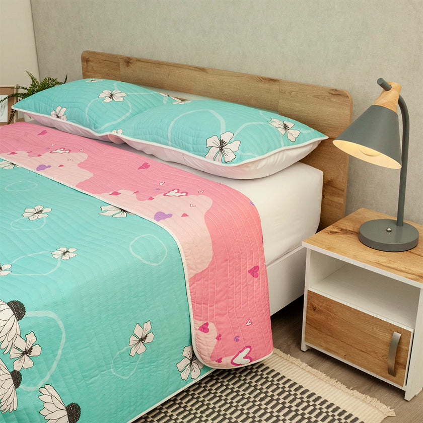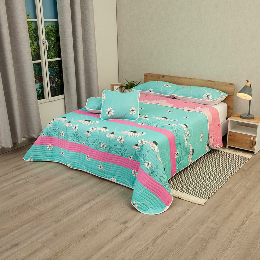 Cubrelecho Estampado Prensado Doble Faz Luz De Margarita Aguamarina