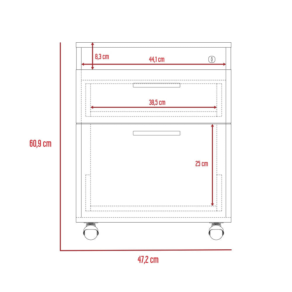 Cerradura tipo trampa, Cajón inferior con tubos para carpetas, rodachinas. Posee unas medidas en CM de: Alto: 60,9 Ancho:47,2 Fondo: 45,6 y un peso en KG de: 21,6 NO INCLUYE ARMADO, Hecho de madera aglomerada, limpiar en seco, no productos abrasivos, ni humedad alta , La foto de este producto ha sido ambientada, por lo cual no incluye ningún adorno, ni accesorios, ni piezas adicionales ni ningún otro elemento que lo acompañan. El color presentado en la fotografía es una aproximación al color real.
