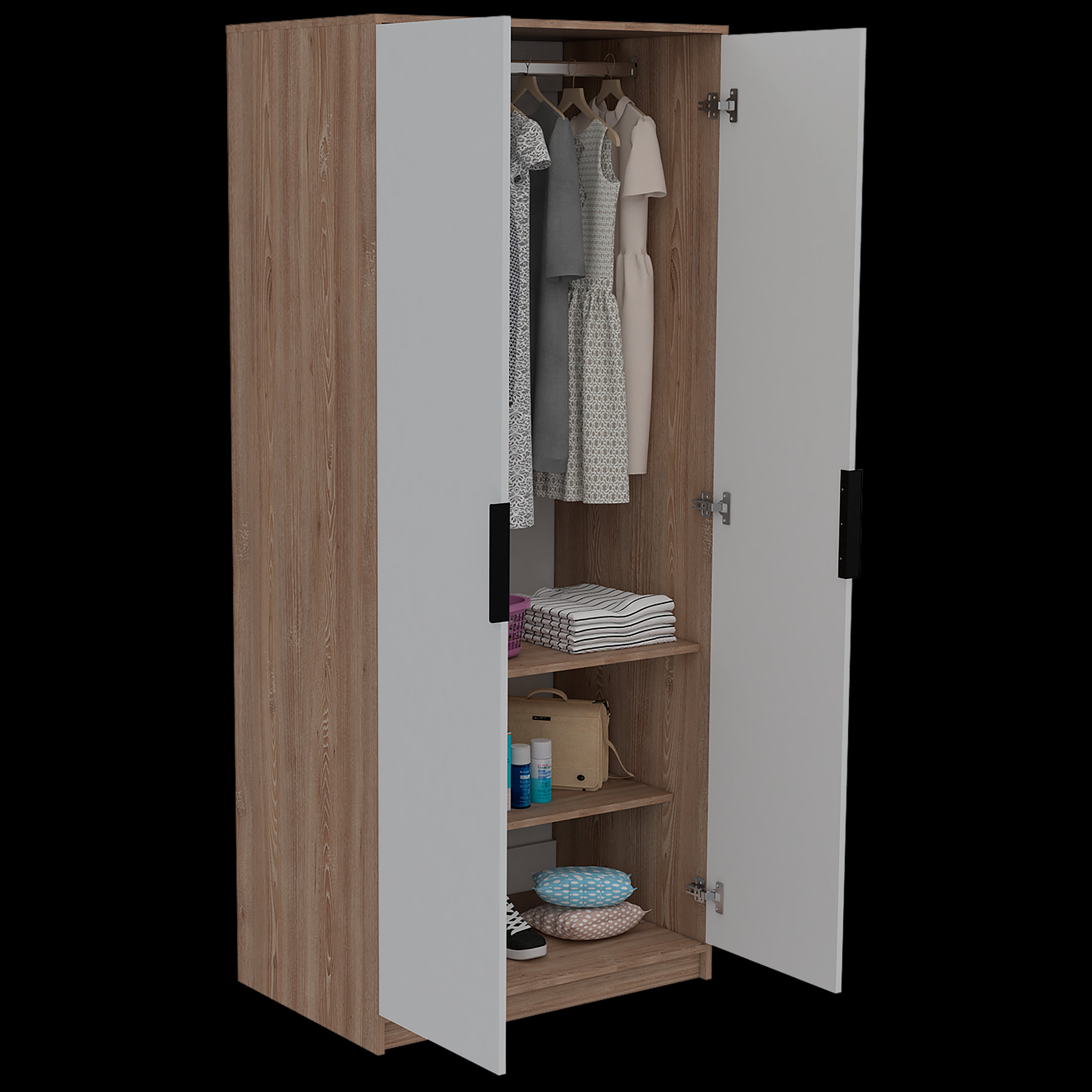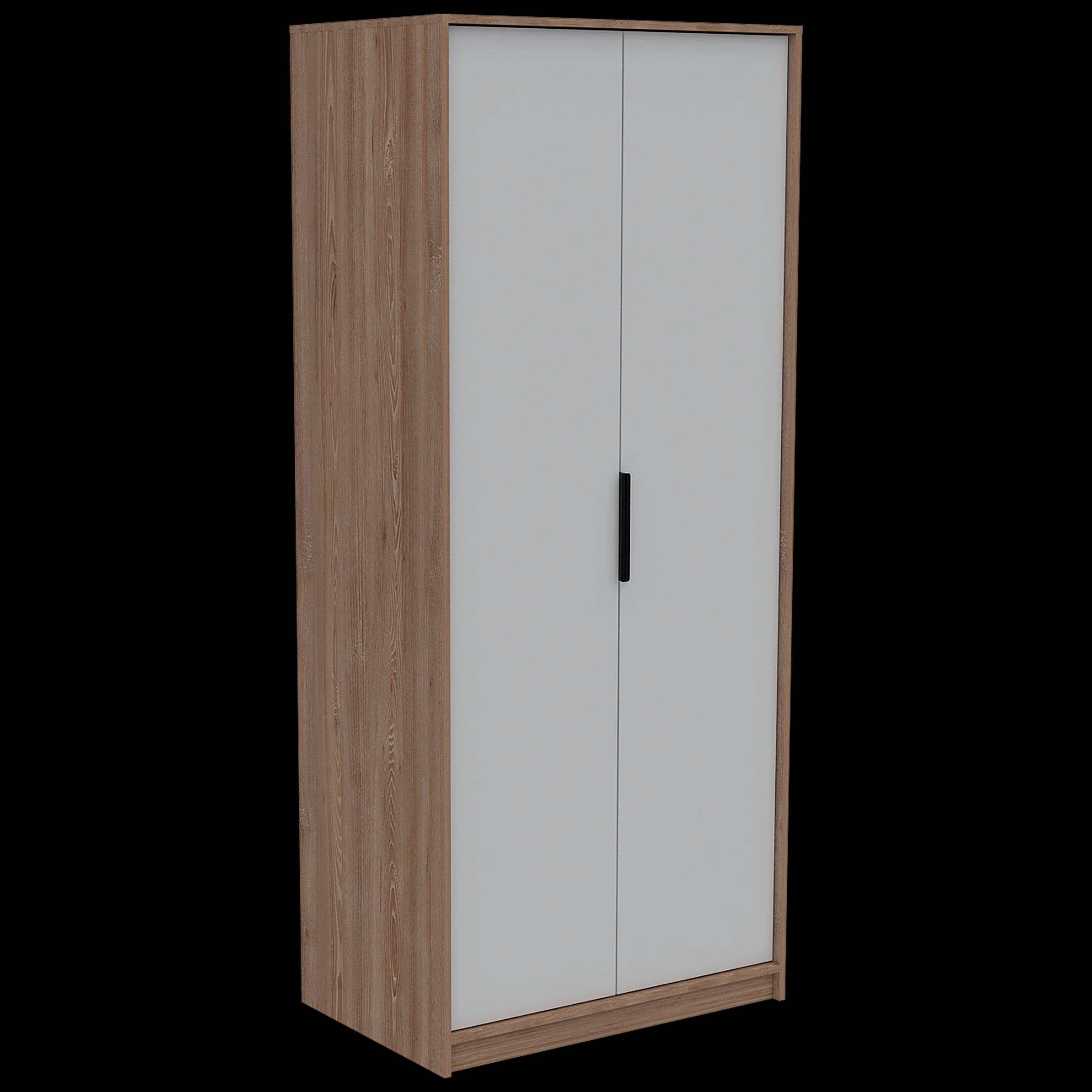 Armario con diseño moderno con combinacion de colores, dos puertas con manija de aluminio y un tubo para colgar ropa, dos entrepaños para ubicar objetos con medidas de: ANCHO 80 ALTO 189 PROFUNDO 52,3