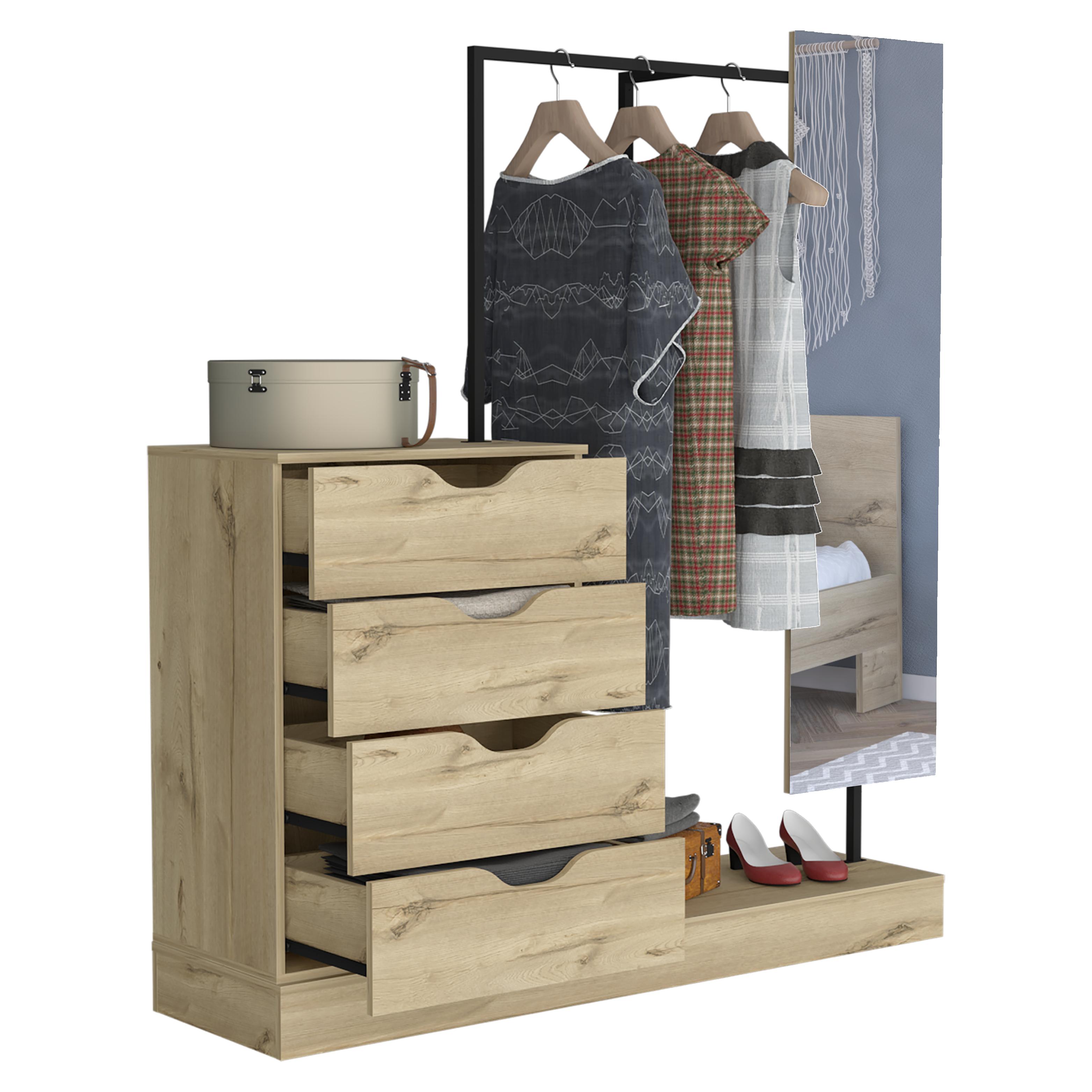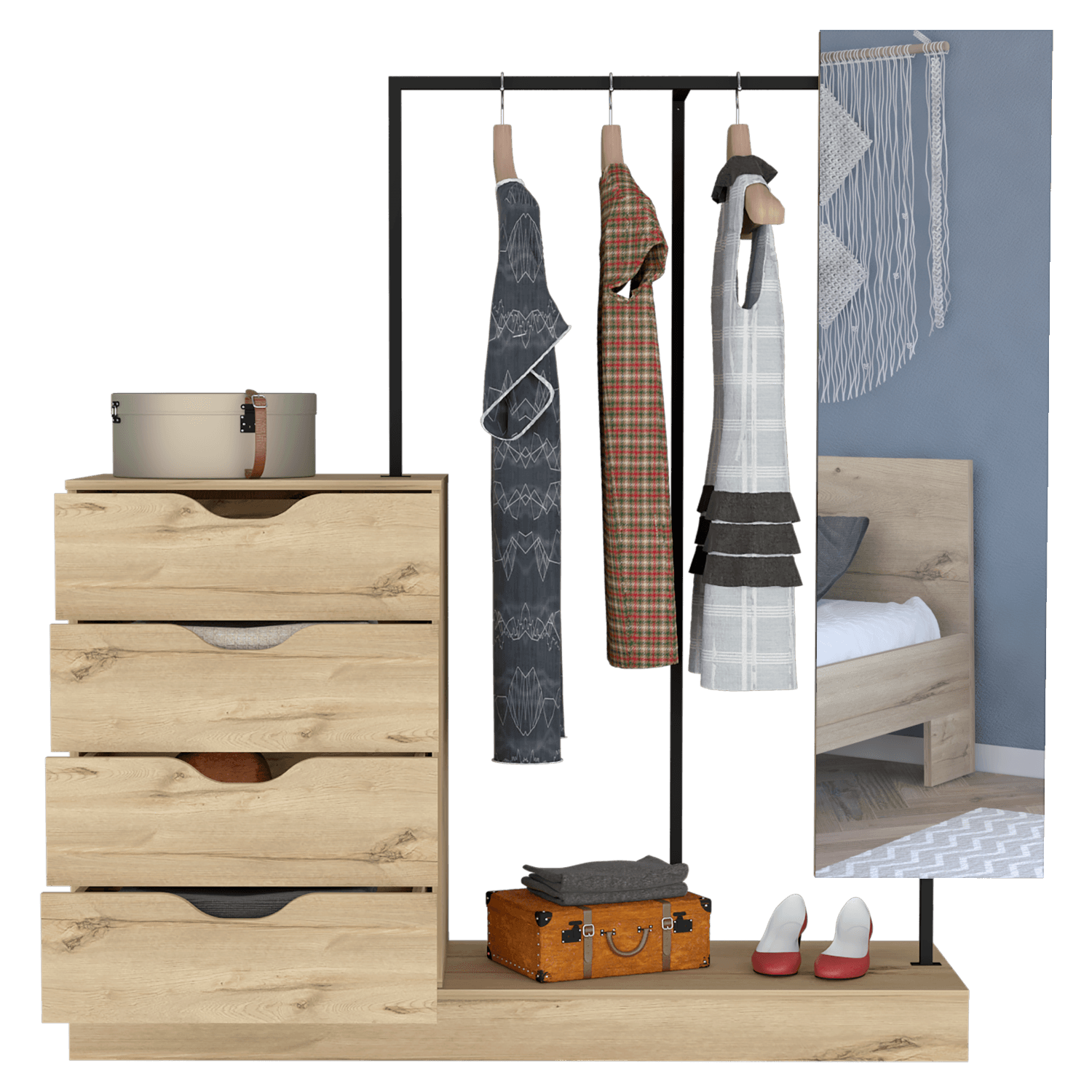 Armario abierto con estructura metalica para colgar ropa, cuatro cajones, facil armado, diseño moderno con medidas de: ANCHO 145 ALTO 160 PROFUNDO 40