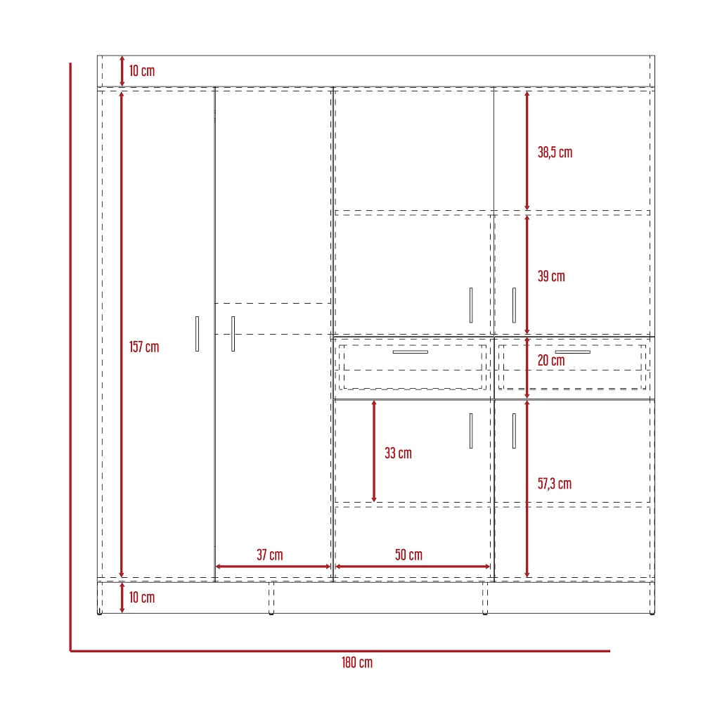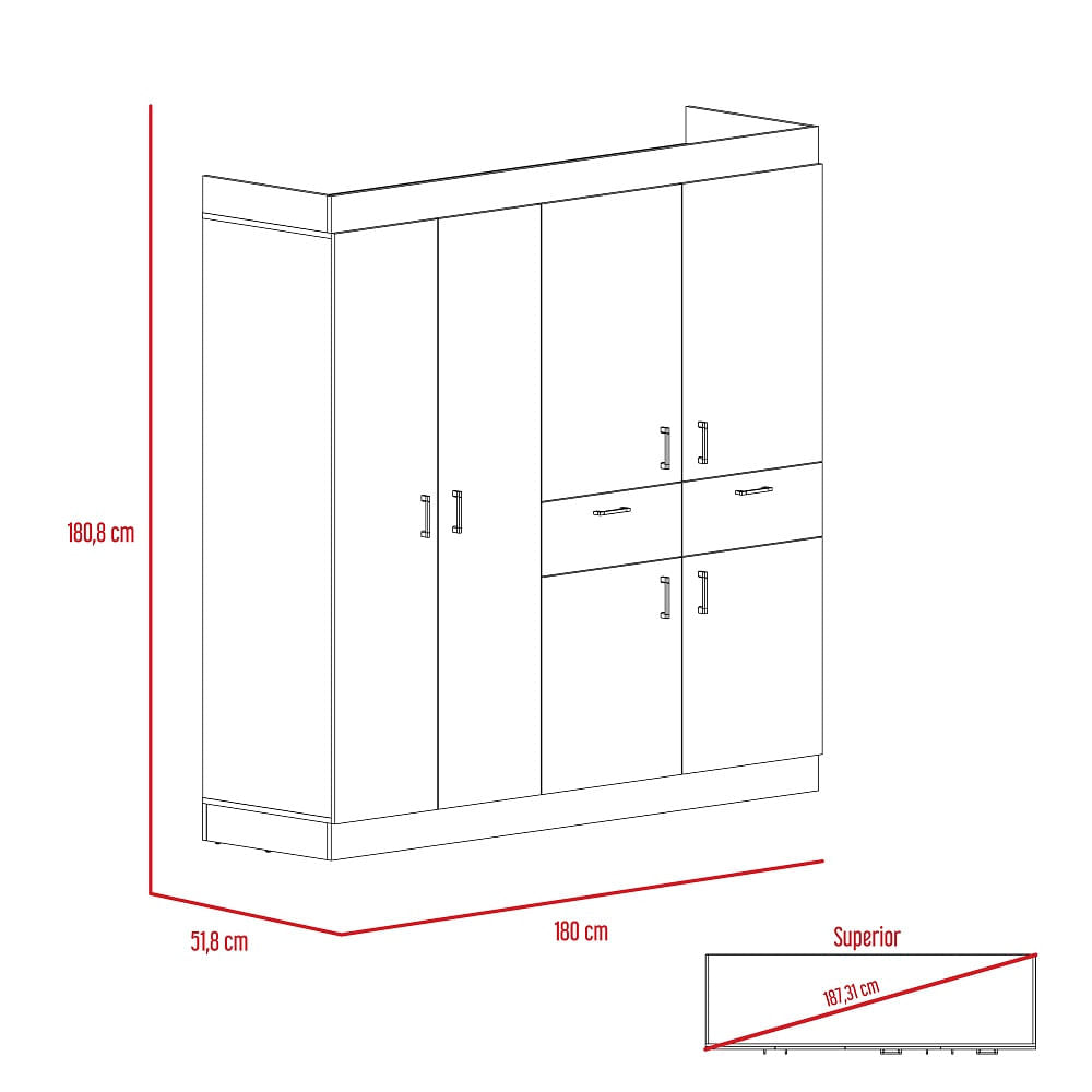 Dos tubos cromados para colgar ropa, dos cajones, amplios espacios para guardar y organizar. Posee unas medidas en Cm de: Alto: 180,8, Ancho: 180 cm , Fondo: 51,8, Peso en KG: 111 NO INCLUYE ARMADO, Hecho de madera aglomerada, limpiar en seco, no productos abrasivos, ni humedad alta , La foto de este producto ha sido ambientada, por lo cual no incluye ningún adorno, ni accesorios, ni piezas adicionales ni ningún otro elemento que lo acompañan. El color presentado en la fotografía es una aproximación al color real.