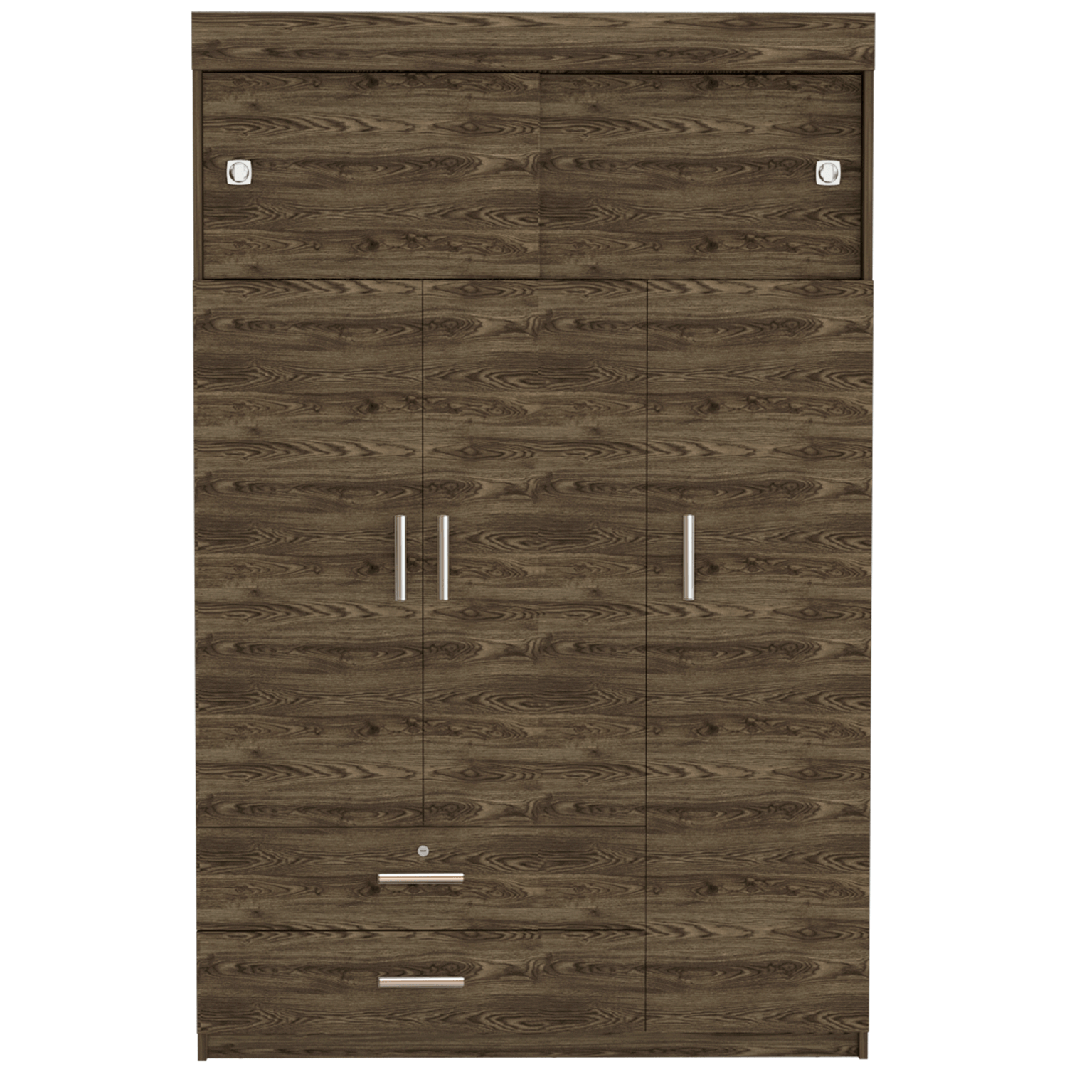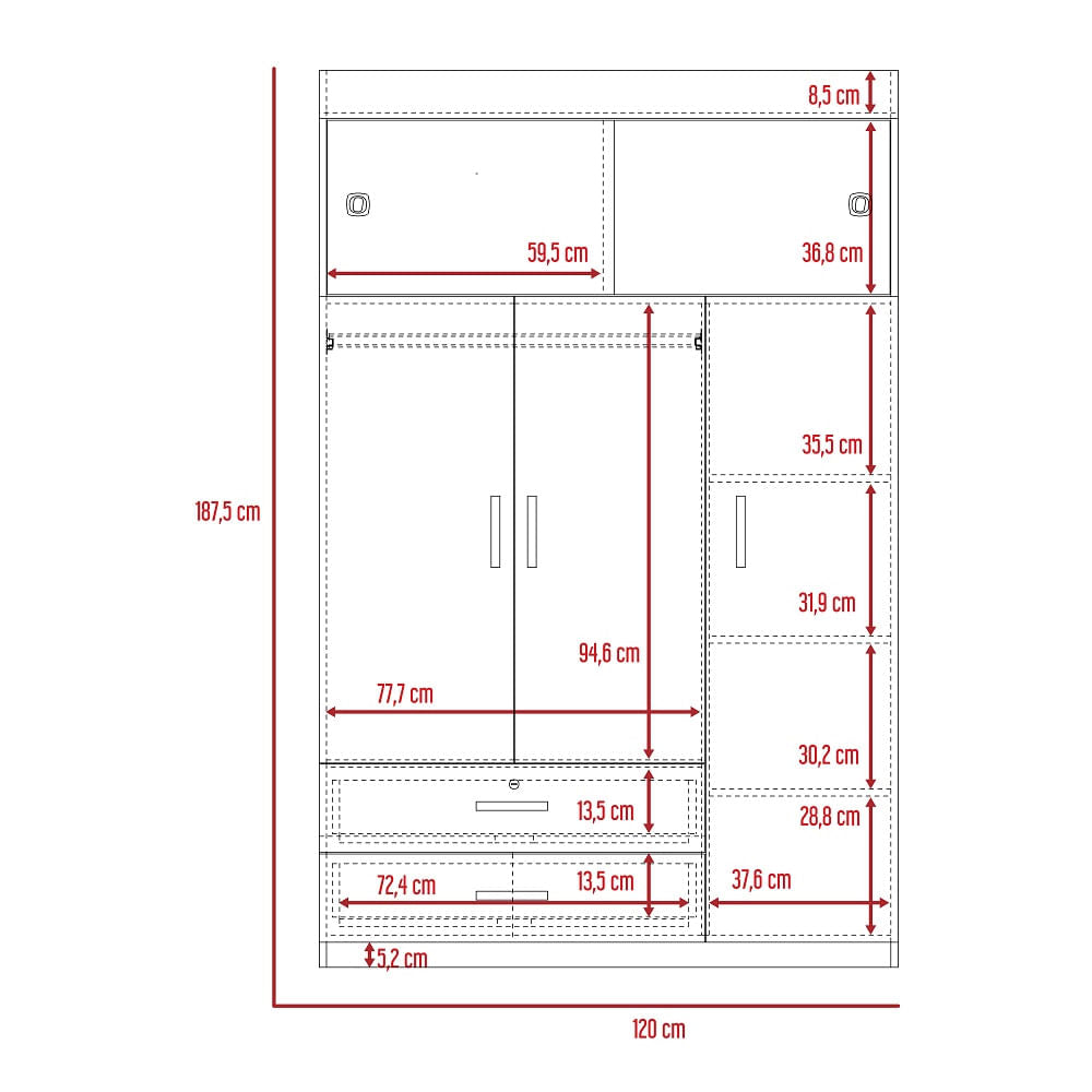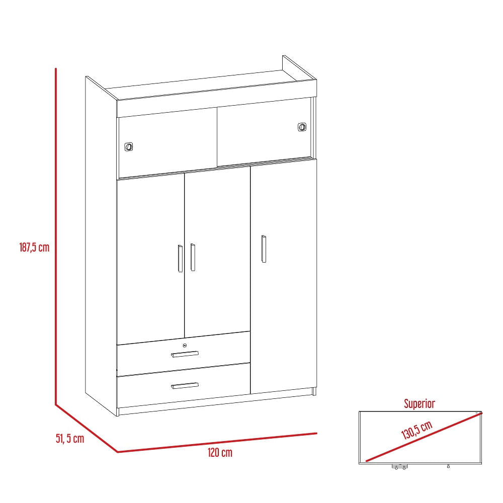Tres puertas abatibles y dos puertas superiores deslizables, Dos cajones, uno de ellos con cerradura, tubo crómado para colgar ropa y manijas metálicas. Posee unas medidas en Cm de: Alto: 187,5, Ancho: 120 , Fondo: 51,5, Peso en KG de: 80,52 NO INCLUYE ARMADO, Hecho de madera aglomerada, limpiar en seco, no productos abrasivos, ni humedad alta , La foto de este producto ha sido ambientada, por lo cual no incluye ningún adorno, ni accesorios, ni piezas adicionales ni ningún otro elemento que lo acompañan. El color presentado en la fotografía es una aproximación al color real.