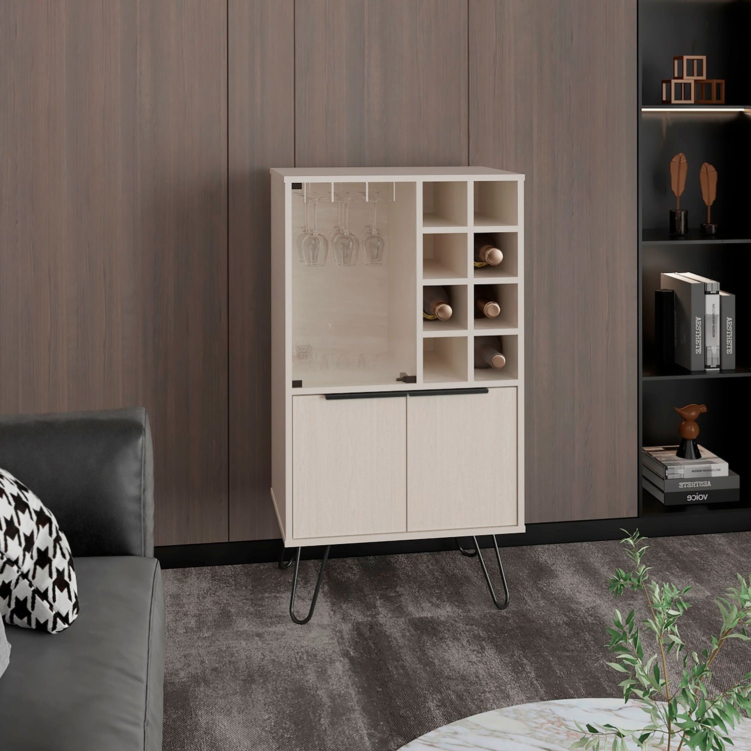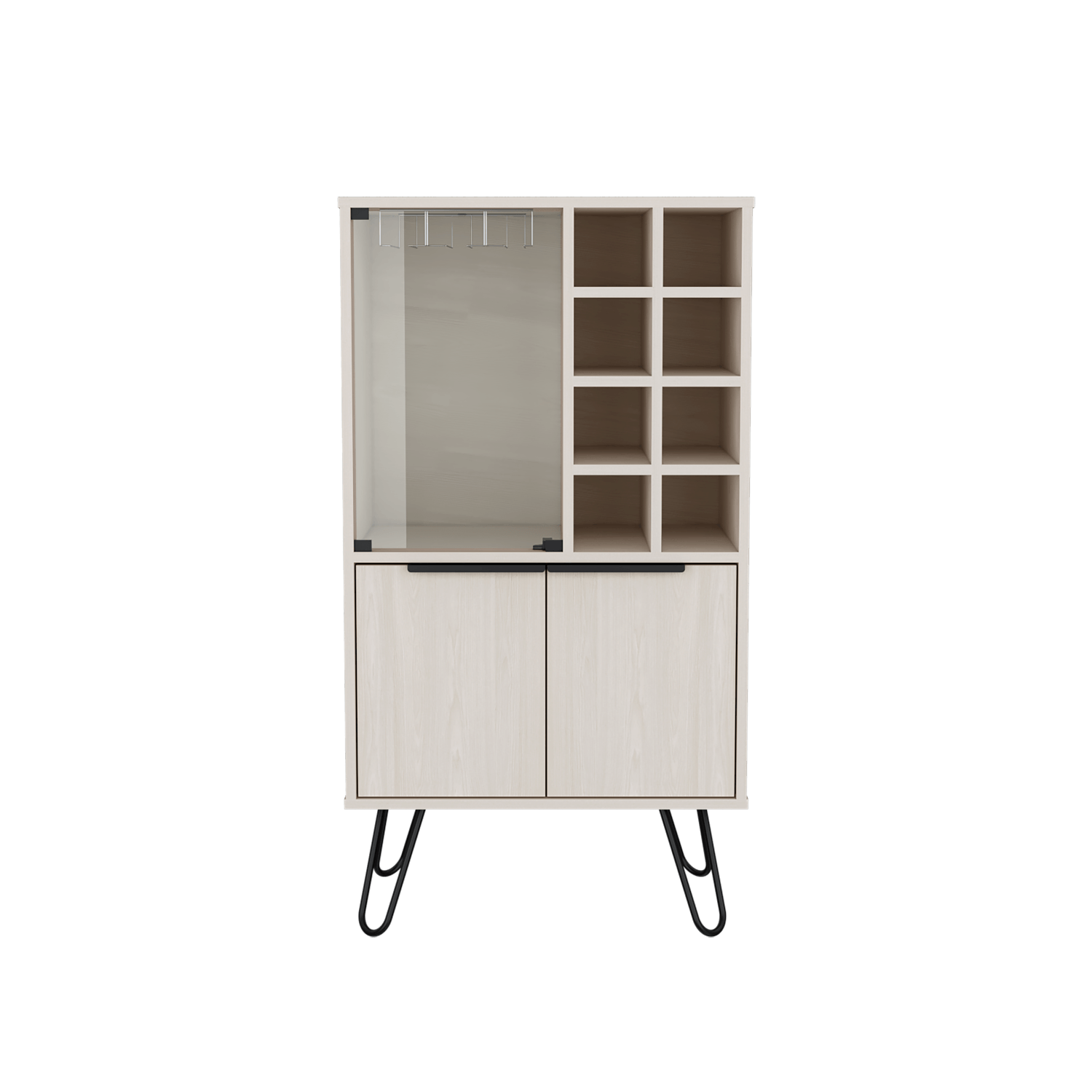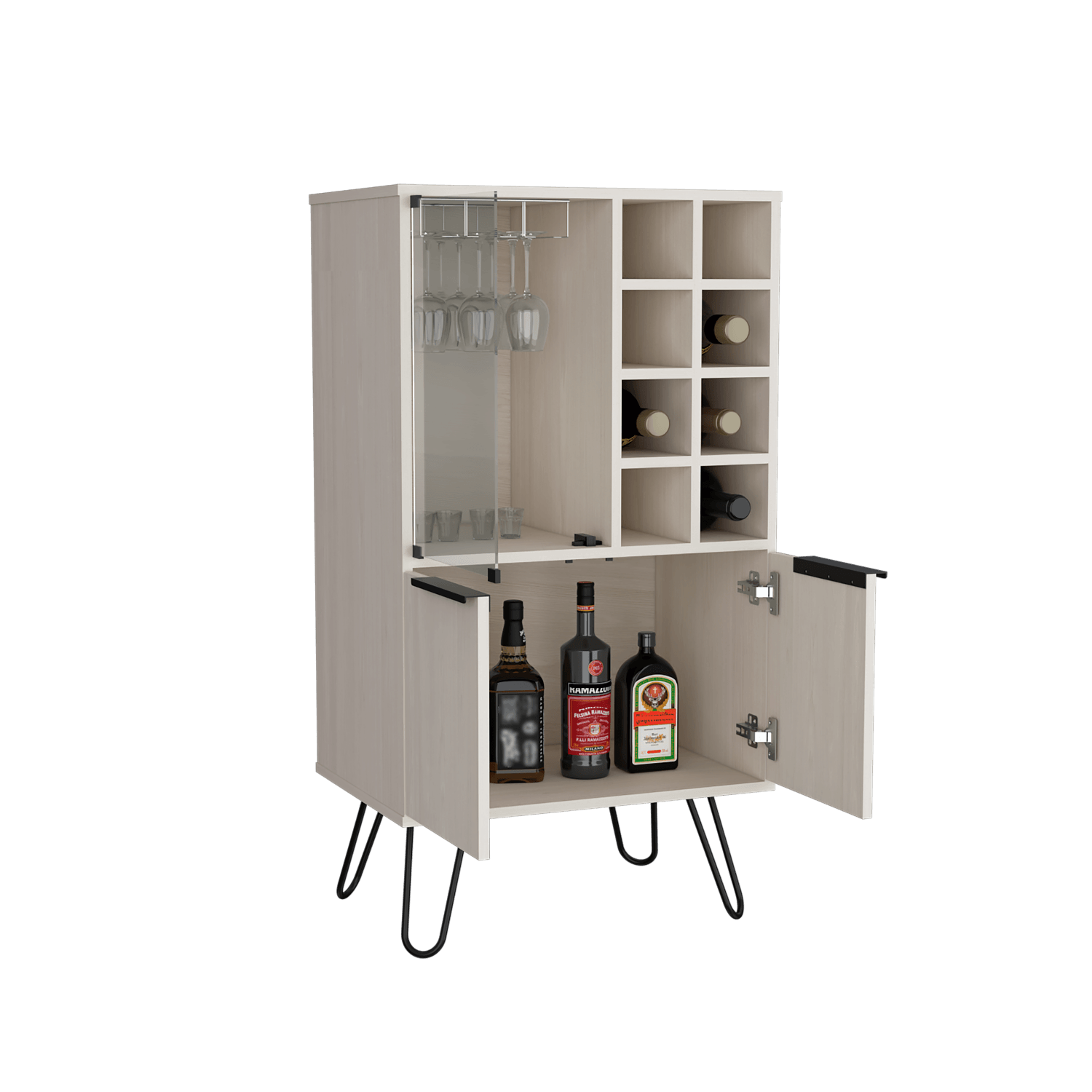 Mueble bar con espacio para botellas de vino y portacopas, una puerta de vidrio, manijas metalicas con medidas de: ALTO 109,4 ANCHO 59,6 FONDO 40
