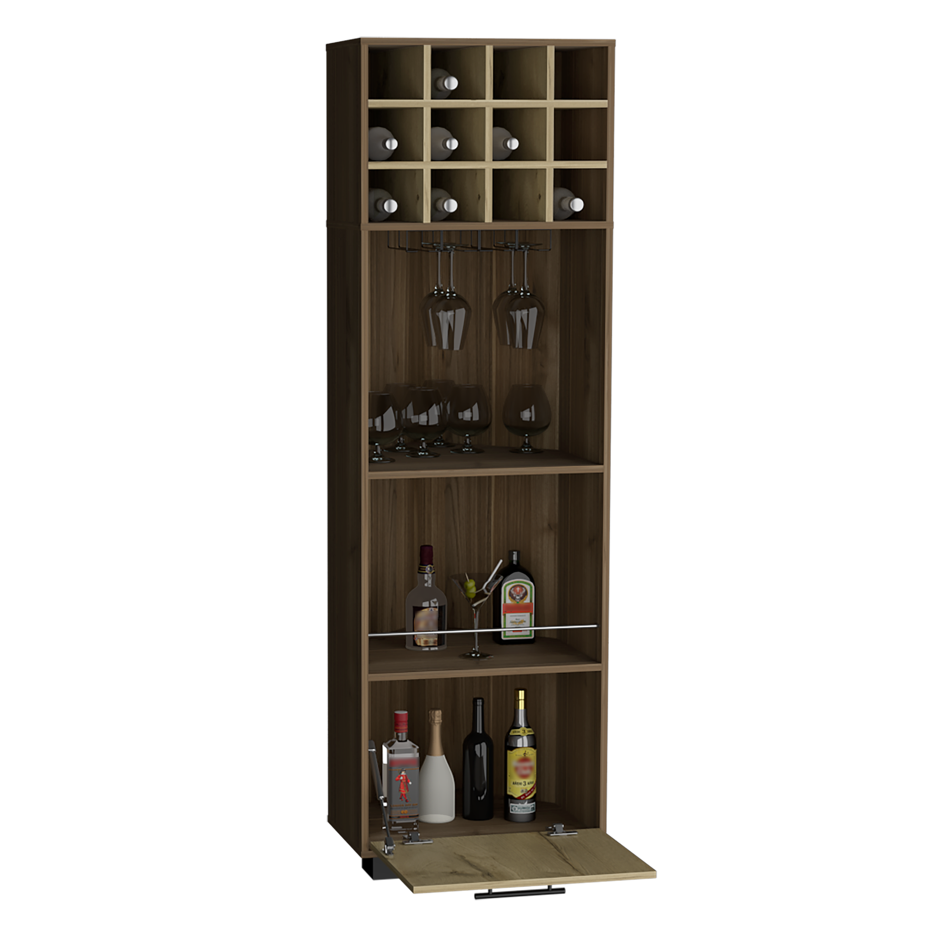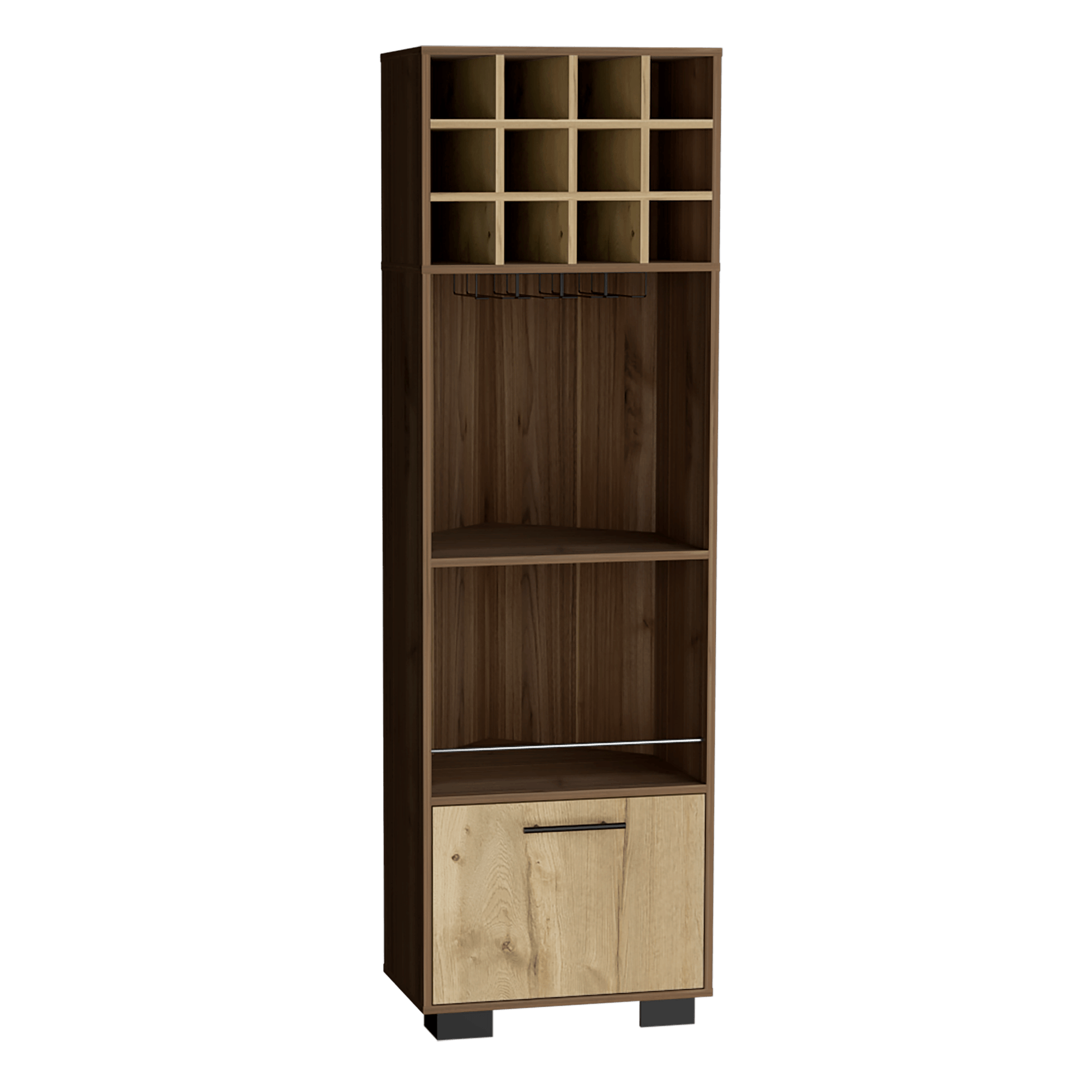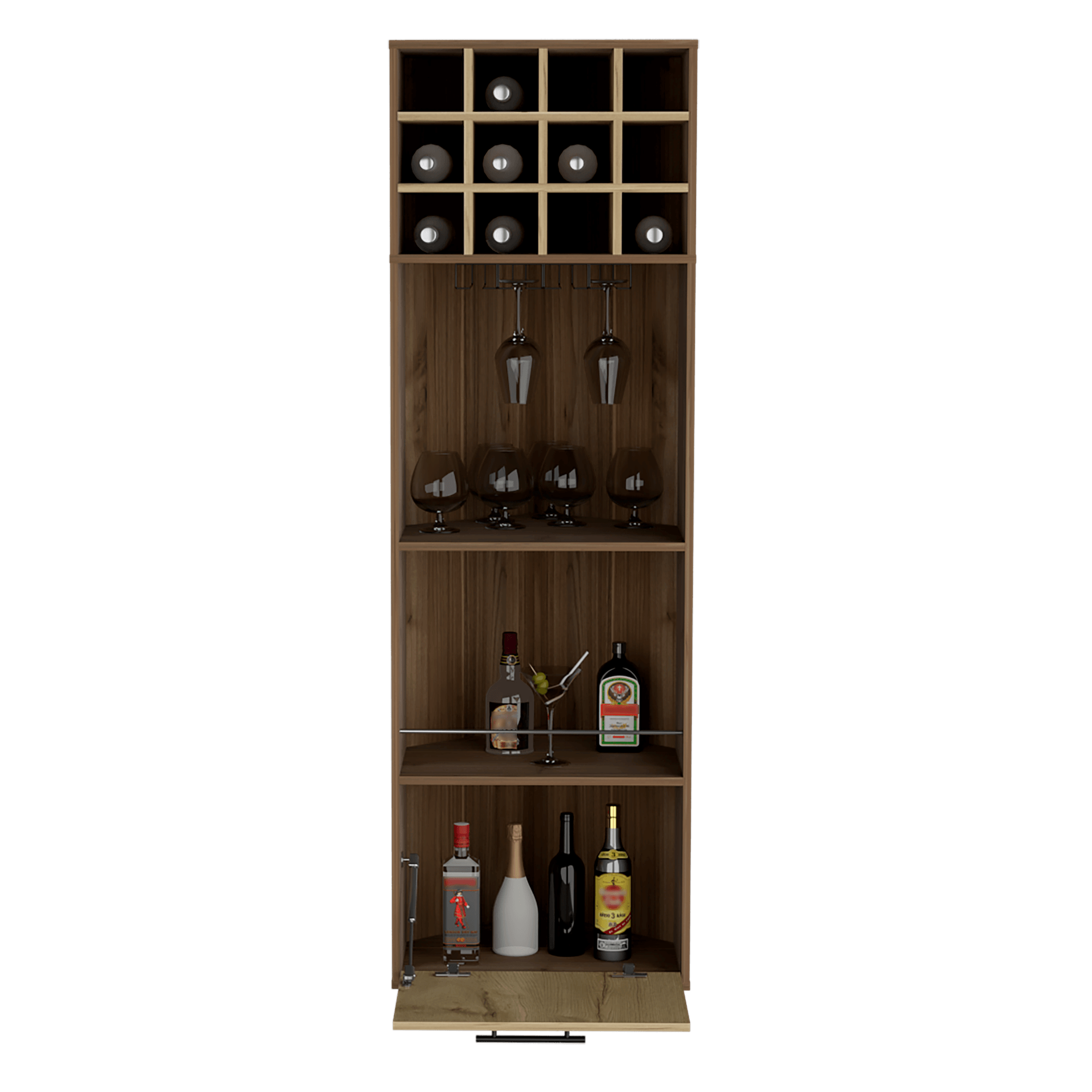 Bar esquinero con espacios para organizar licores, incluye un colgador de copas, patas metalicas, manija metalica, una puerta con medidas de: ALTO 180 ANCHO 55,5 FONDO 60,3