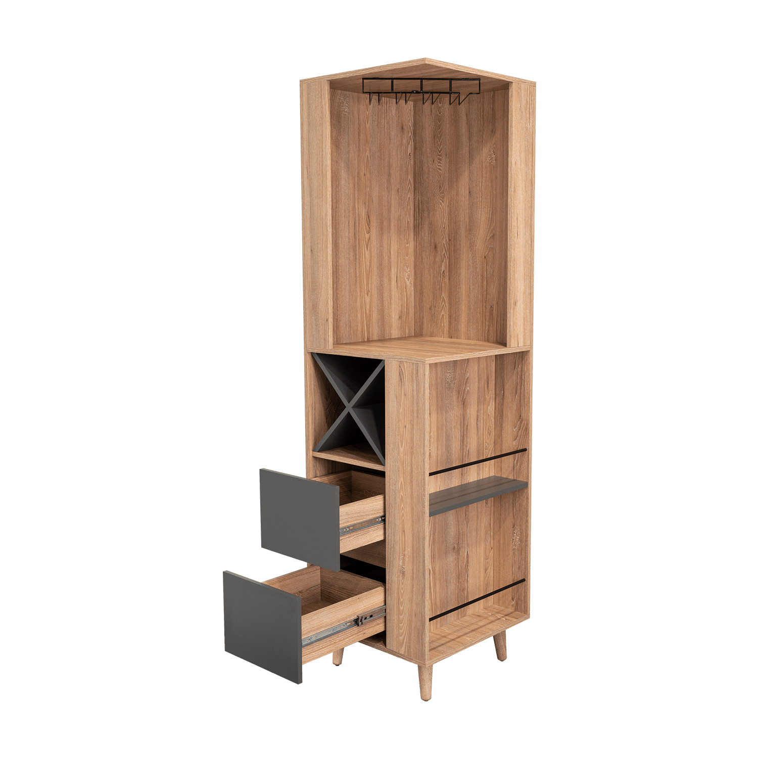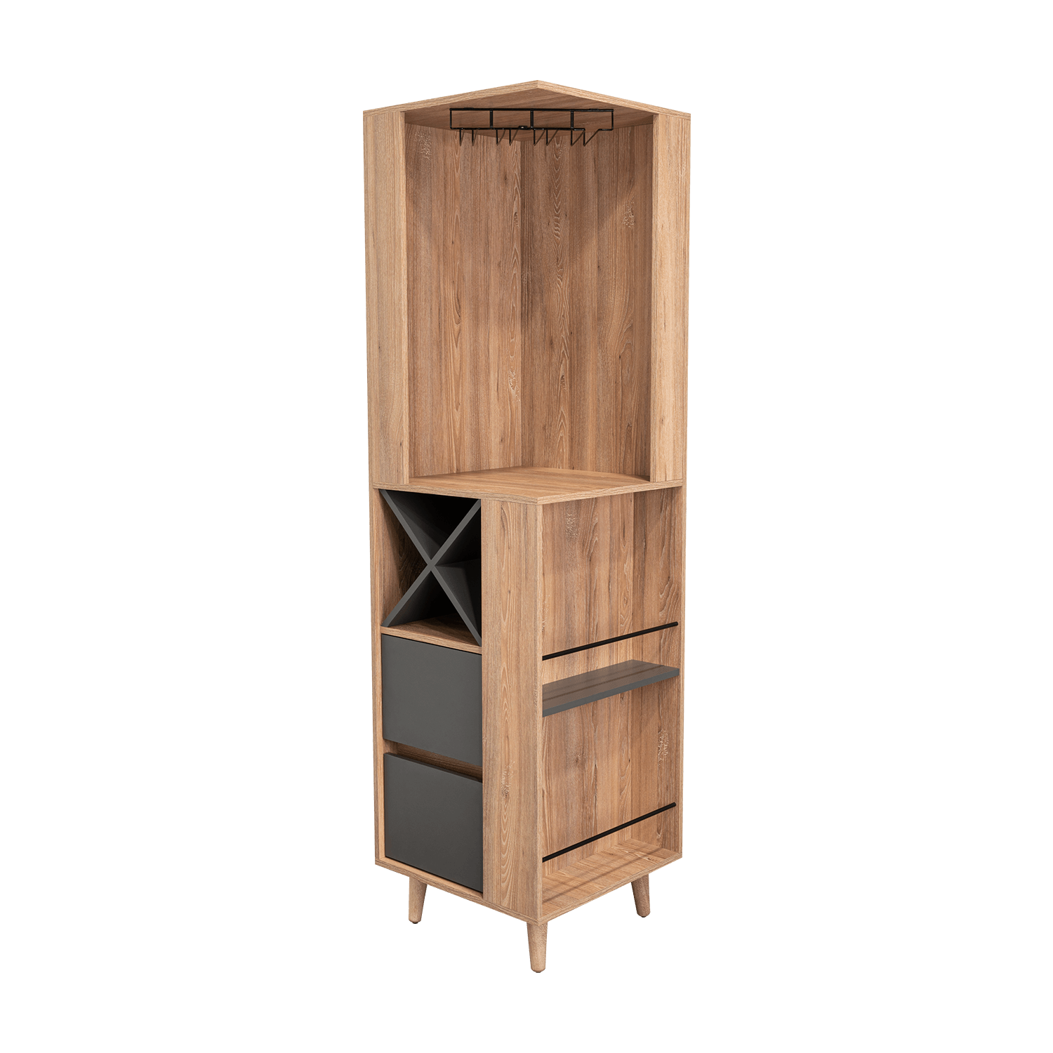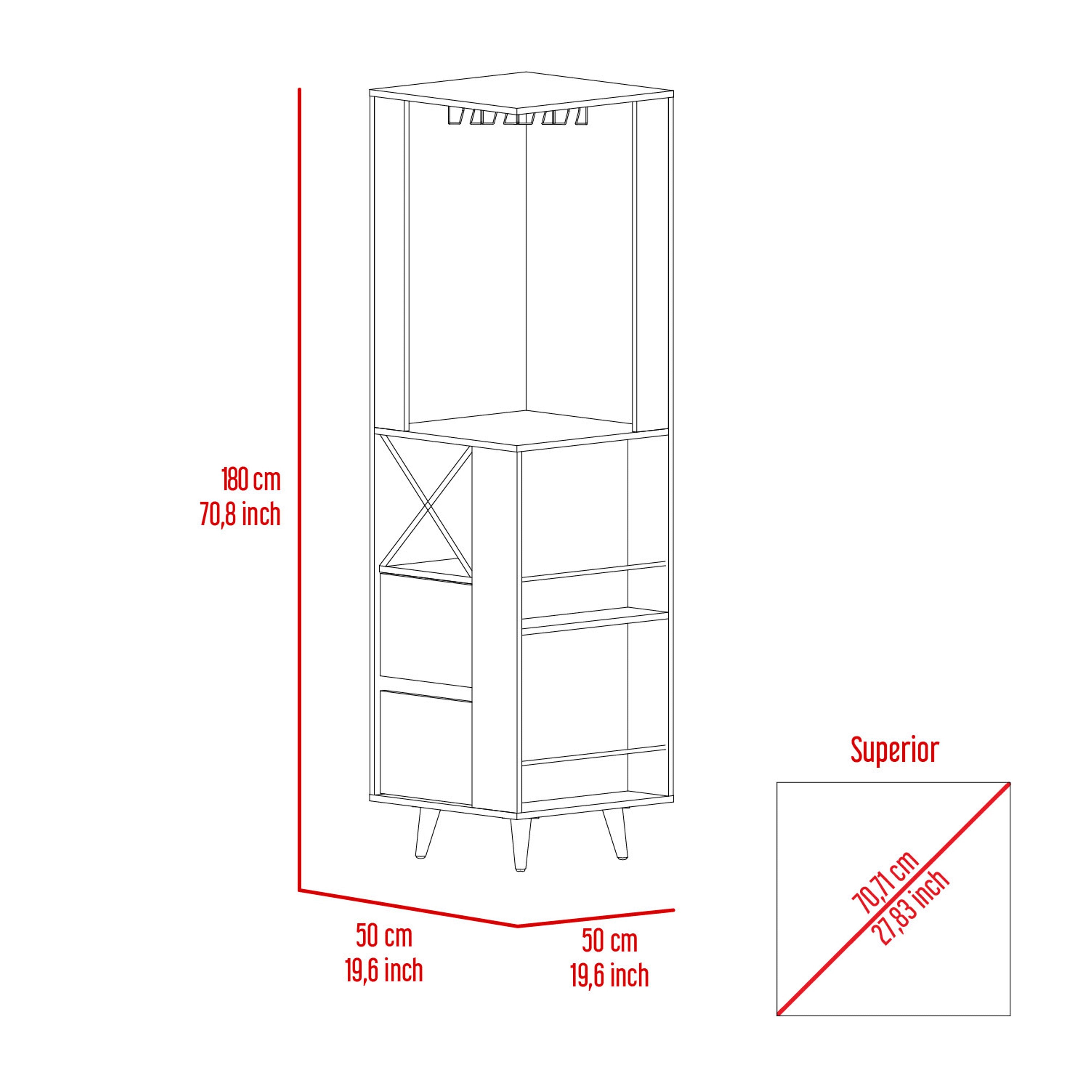 Bar esquinero con espacios para organizar licores, incluye colgador de copas, dos cajones, patas de madera, y de diseño moderno con medidas de: ANCHO 50 ALTO 180 PROFUNDO 50