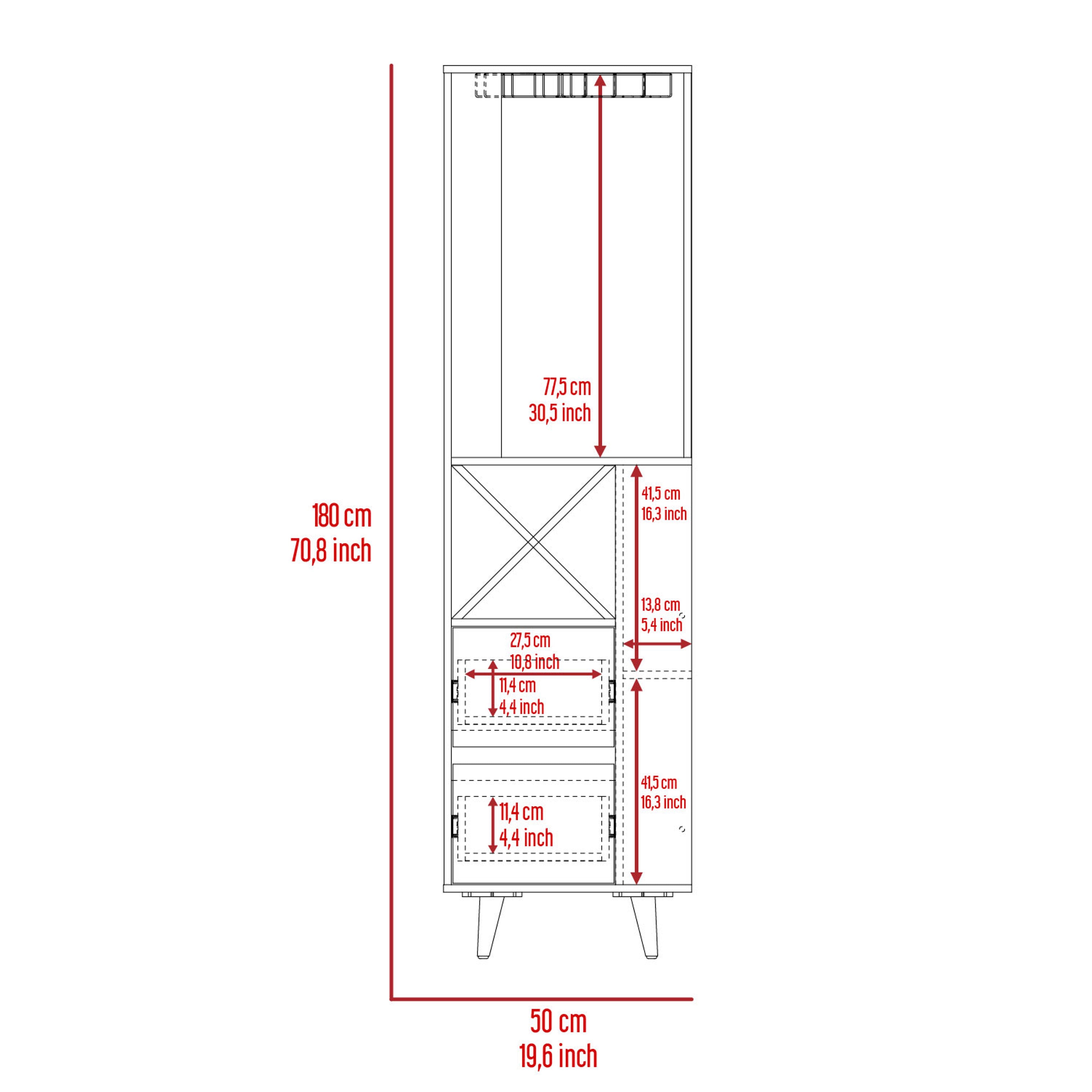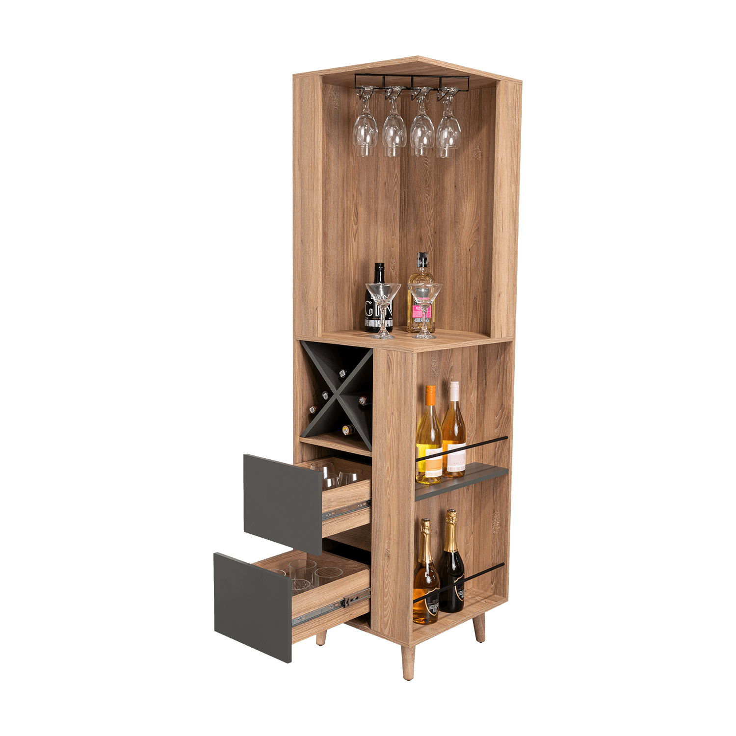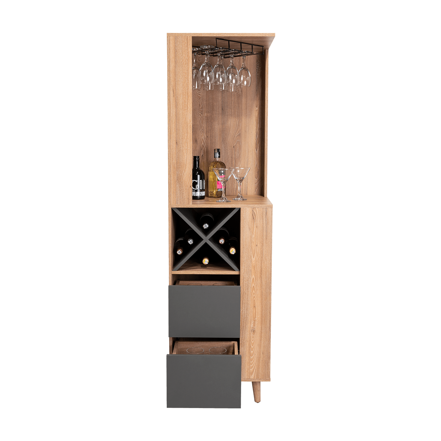 Bar esquinero con espacios para organizar licores, incluye colgador de copas, dos cajones, patas de madera, y de diseño moderno con medidas de: ANCHO 50 ALTO 180 PROFUNDO 50
