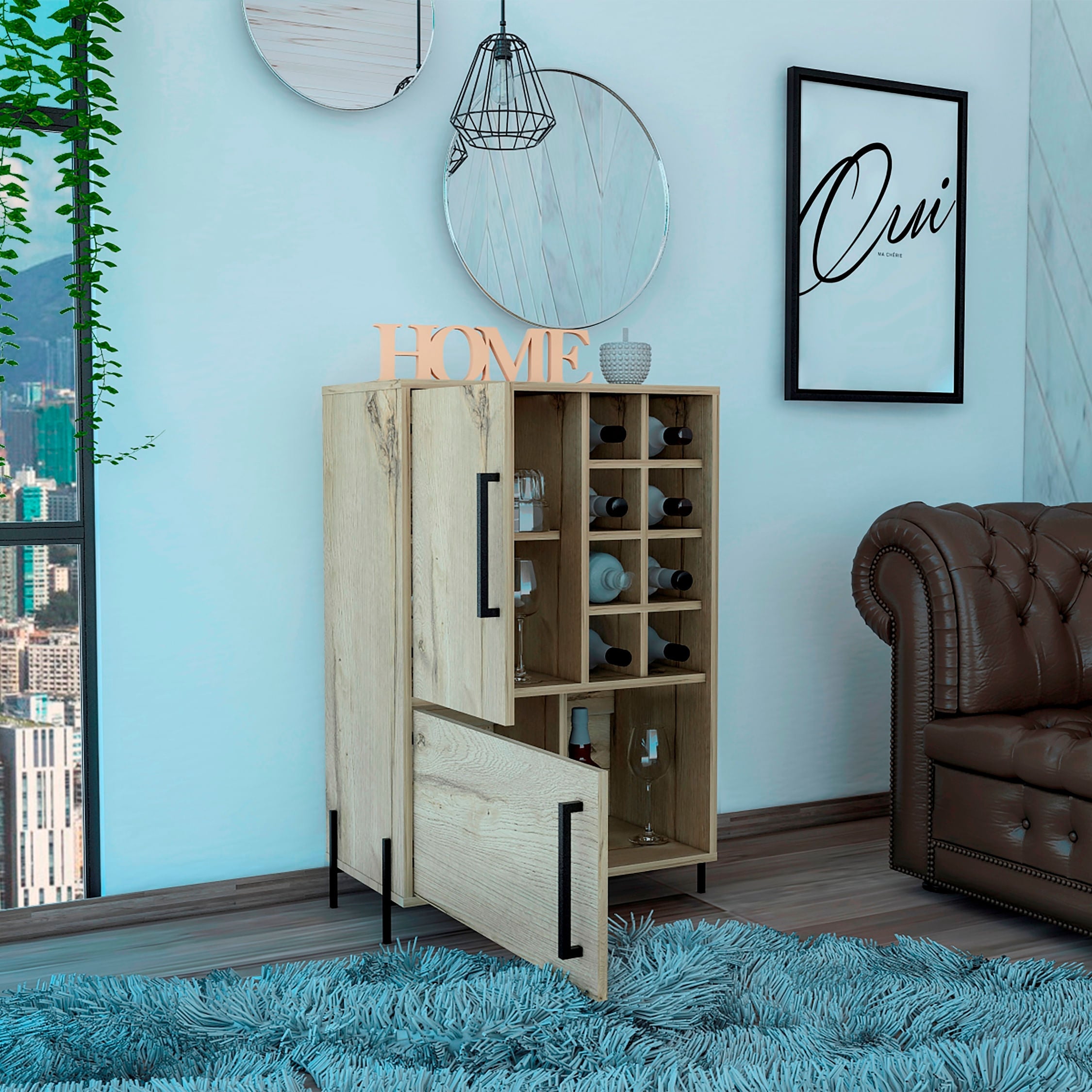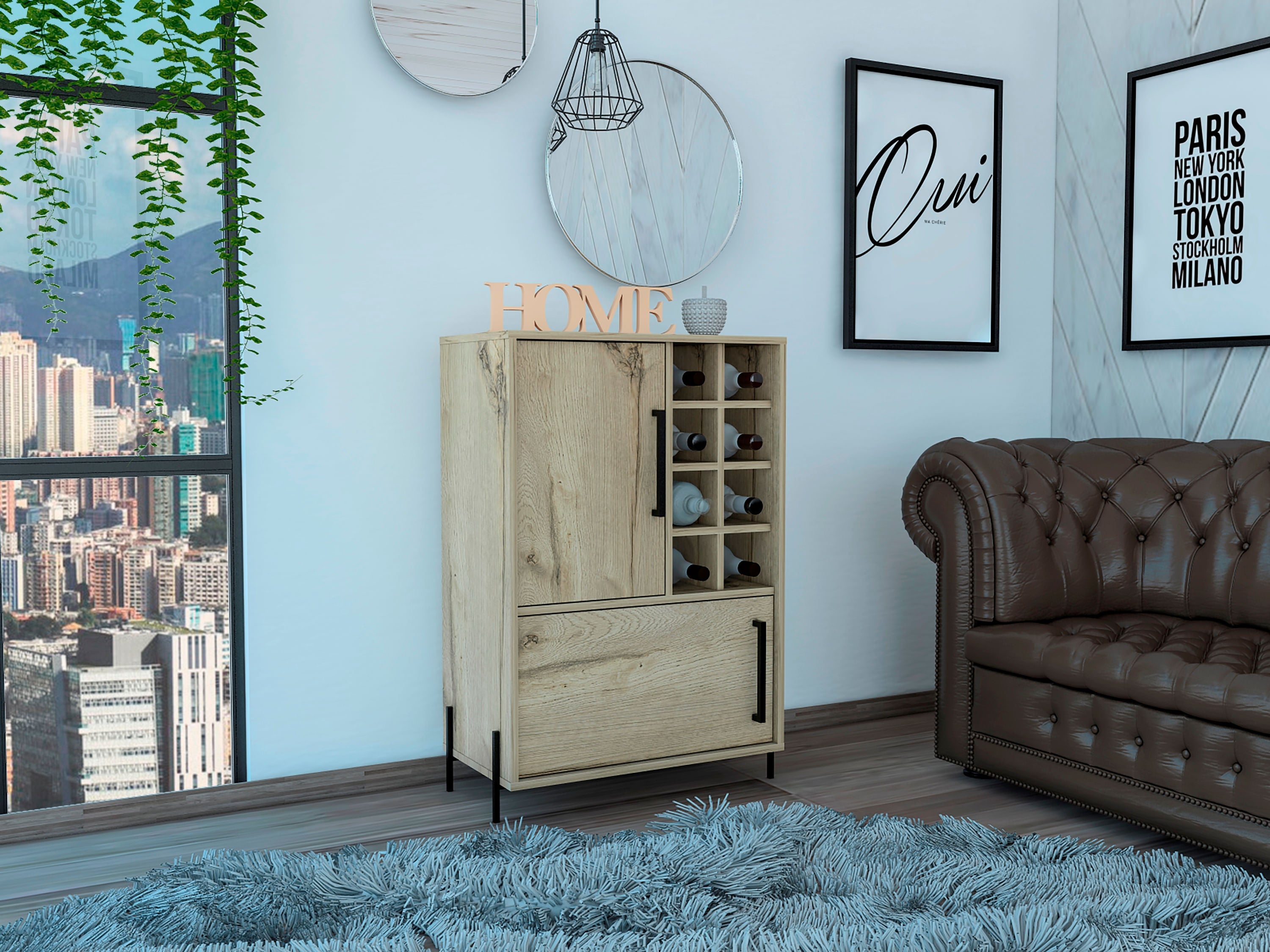 Bar con espacio para almacenar botellas y objetos de bar, entrepaños internos, puerta abatible para almacenamiento, patas metalicas con medidas de: ALTO 94,1 ANCHO 63,4 FONDO 34,6