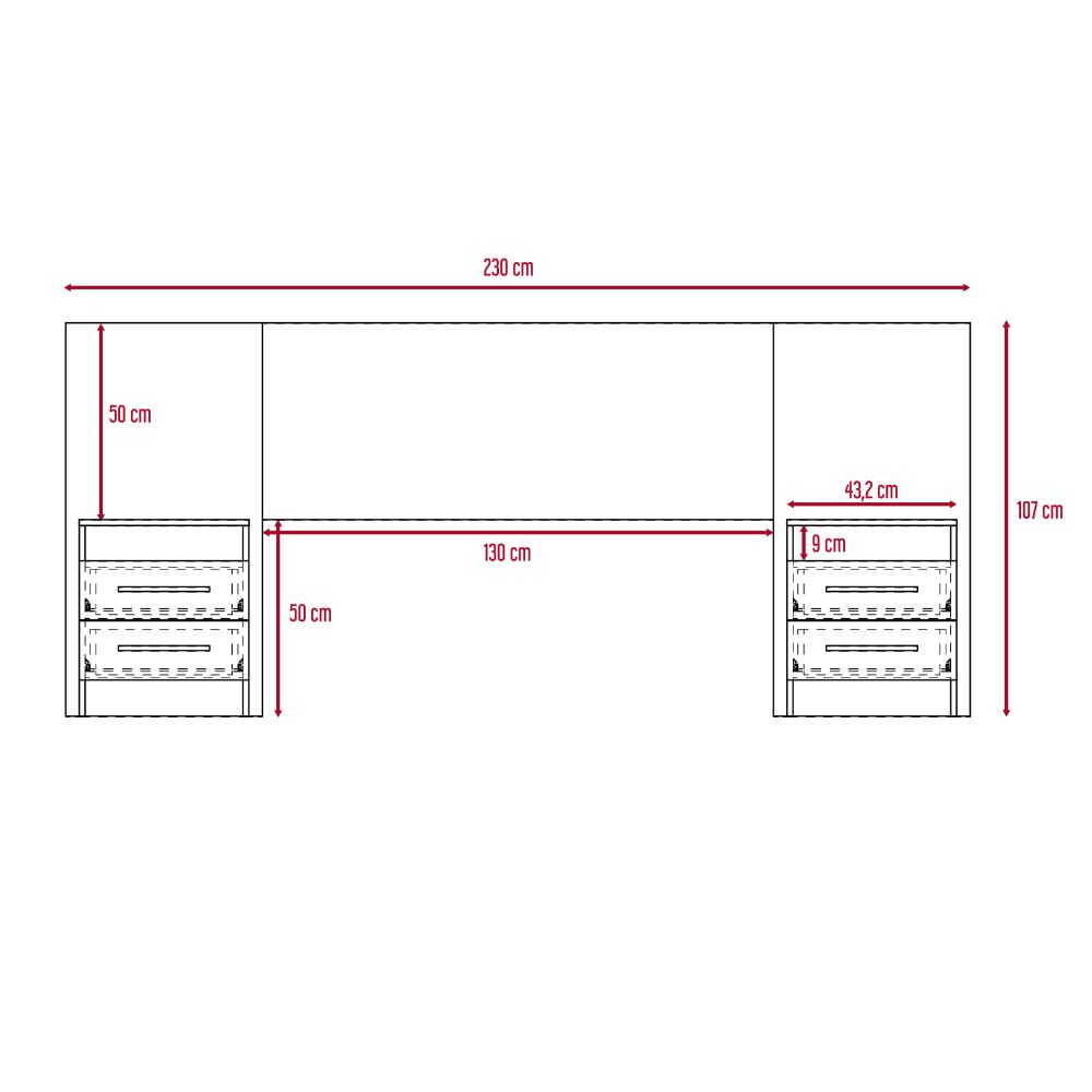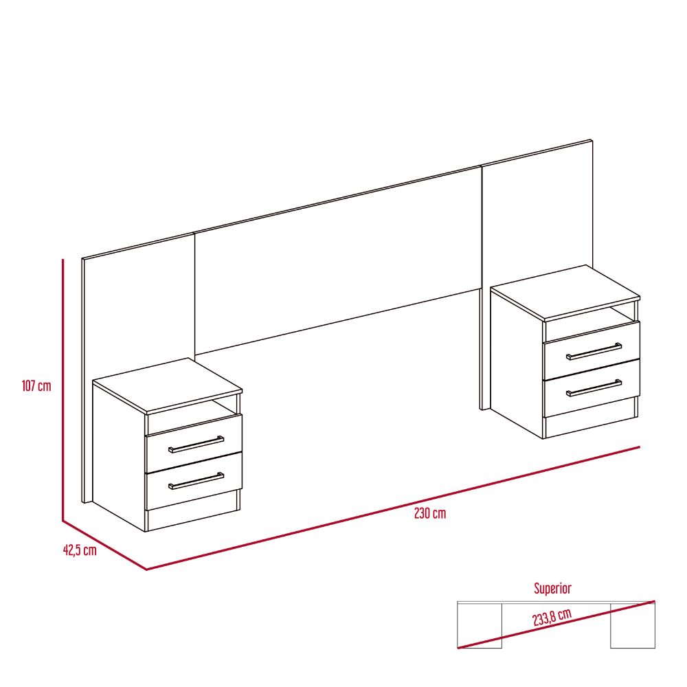 Dos nocheros, cada nochero tiene dos cajones, manijas en aluminio, espacio para objetos decorativos. Posee unas medidas en CM de: Alto:100,5 Ancho: 230 Fondo: 42,5 y un peso en KG de: 51,8 NO INCLUYE ARMADO, Hecho de madera aglomerada, limpiar en seco, no productos abrasivos, ni humedad alta , La foto de este producto ha sido ambientada, por lo cual no incluye ningún adorno, ni accesorios, ni piezas adicionales ni ningún otro elemento que lo acompañan. El color presentado en la fotografía es una aproximación al color real.