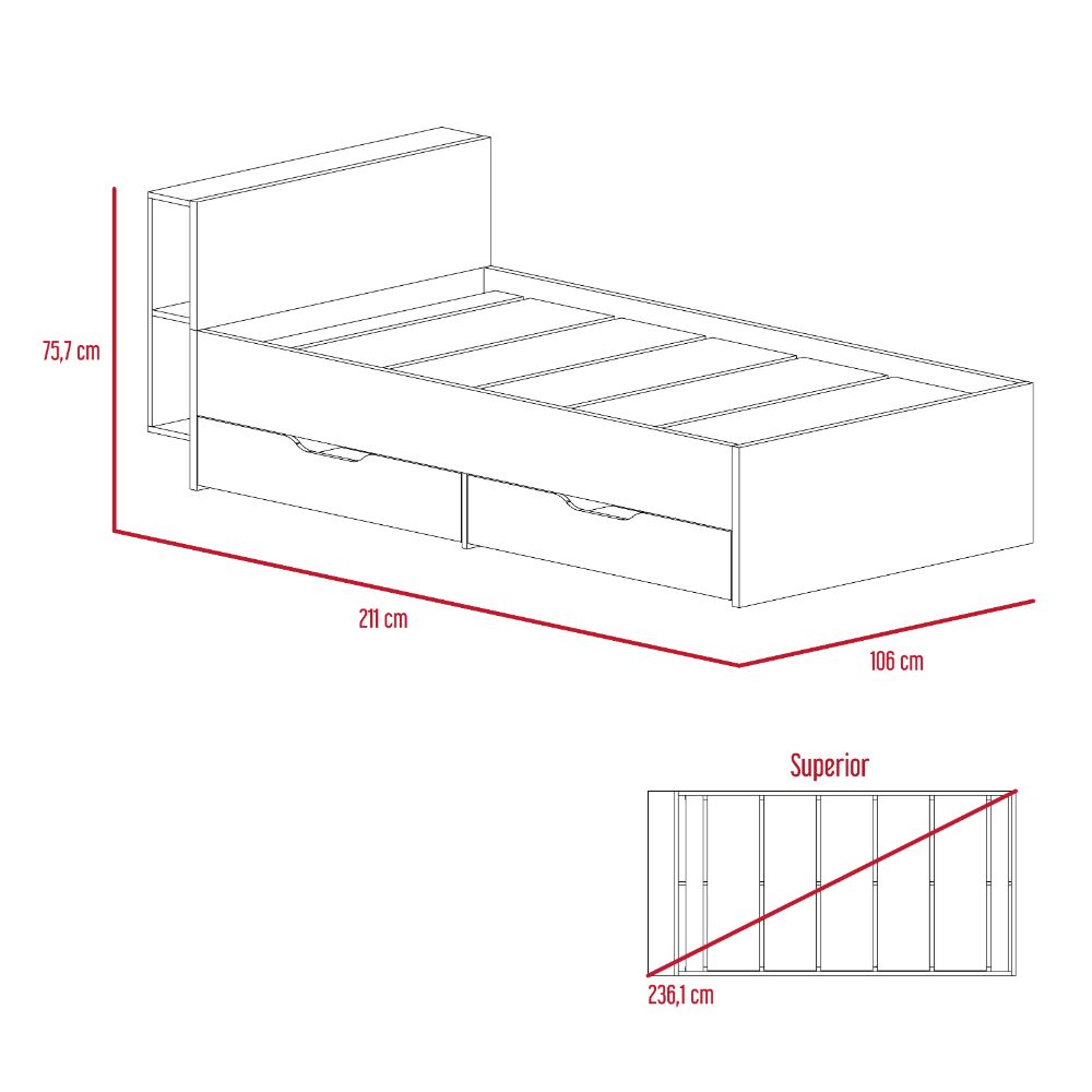 Cama sencilla, colchón de 100 x 190, detalle fncional en la cabecera para libros y objetos personales. Posee unas medidas en CM de: Alto: 75,7 Ancho:106 Fondo: 211 y un peso en KG de: 94,9 NO INCLUYE ARMADO, Hecho de madera aglomerada, limpiar en seco, no productos abrasivos, ni humedad alta , La foto de este producto ha sido ambientada, por lo cual no incluye ningún adorno, ni accesorios, ni piezas adicionales ni ningún otro elemento que lo acompañan. El color presentado en la fotografía es una aproximación al color real.