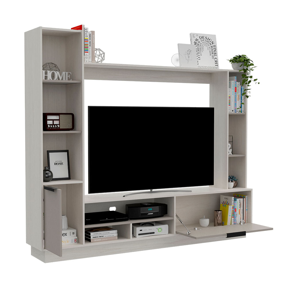 Tiene espacio para televisor de hasta 60. Su diseño es moderno con una bellísima combinación de colores. Cuenta con múltiples compartimentos y superficies para ubicar objetos. Posee unas medidas de Alto: 176,8 cm. Ancho: 202 cm. Fondo: 35 cm Y peso: 85,8 Kg"