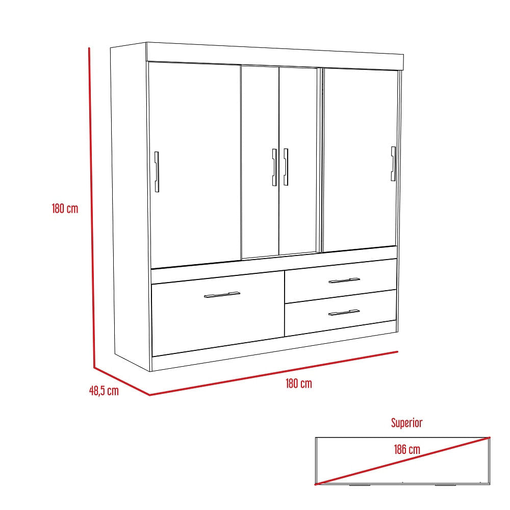 Closet Allegro 180 x 180 RTA Duna con dos puertas corredizas y tres abatibles. Tubos cromados para colgar ropa y dos cajones Medidas en Centimetros de : Alto: 180 Ancho:180 Largo: 48,5 NO INCLUYE ARMADO, Hecho de madera aglomerada, limpiar en seco, no productos abrasivos, ni humedad alta , La foto de este producto ha sido ambientada, por lo cual no incluye ningún adorno, ni accesorios, ni piezas adicionales ni ningún otro elemento que lo acompañan. El color presentado en la fotografía es una aproximación al color real.