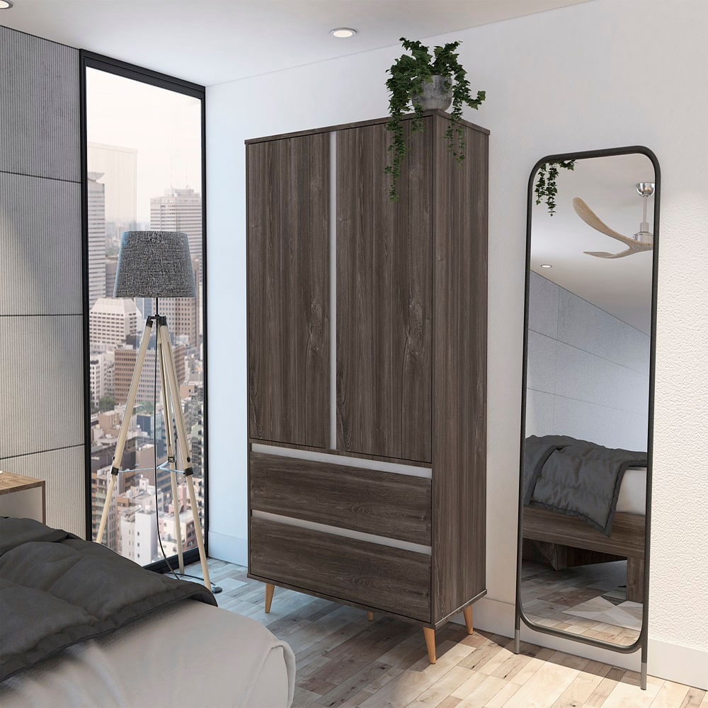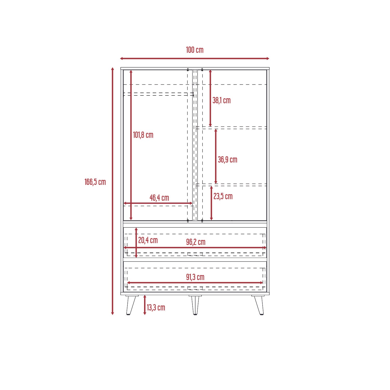Amplio Closet para almacenamiento. Cuenta con: dos cajones de apertura sin manija, dos puertas, un tubo para colgar prendas, y entrepaños para ubicar objetos. Posee unas medidas en centimetros de : Alto:166,5 , Ancho:100 , Fondo:46,8 y un Peso en KG de:63,6 NO INCLUYE ARMADO, Hecho de madera aglomerada, limpiar en seco, no productos abrasivos, ni humedad alta , La foto de este producto ha sido ambientada, por lo cual no incluye ningún adorno, ni accesorios, ni piezas adicionales ni ningún otro elemento que lo acompañan. El color presentado en la fotografía es una aproximación al color real.