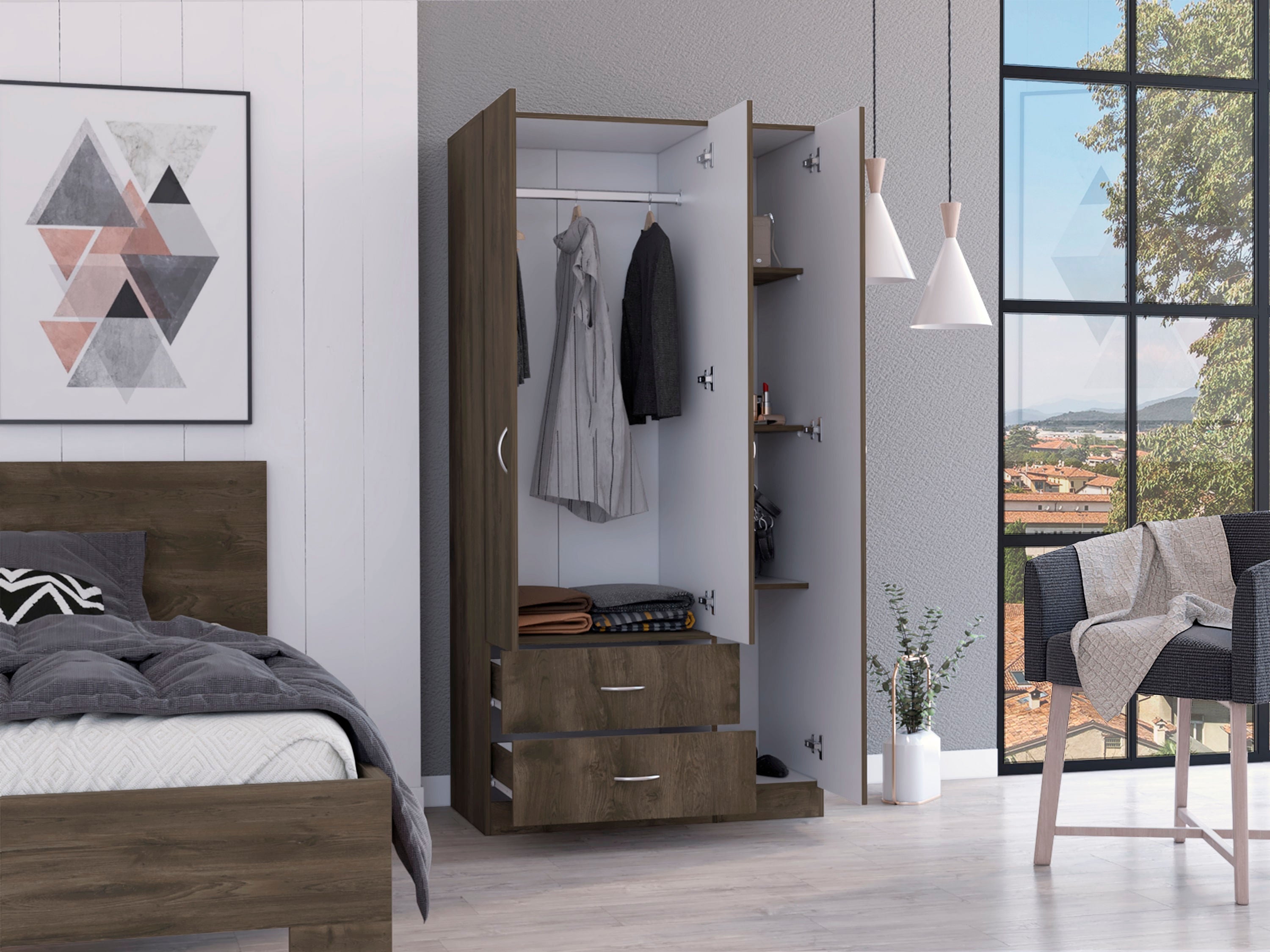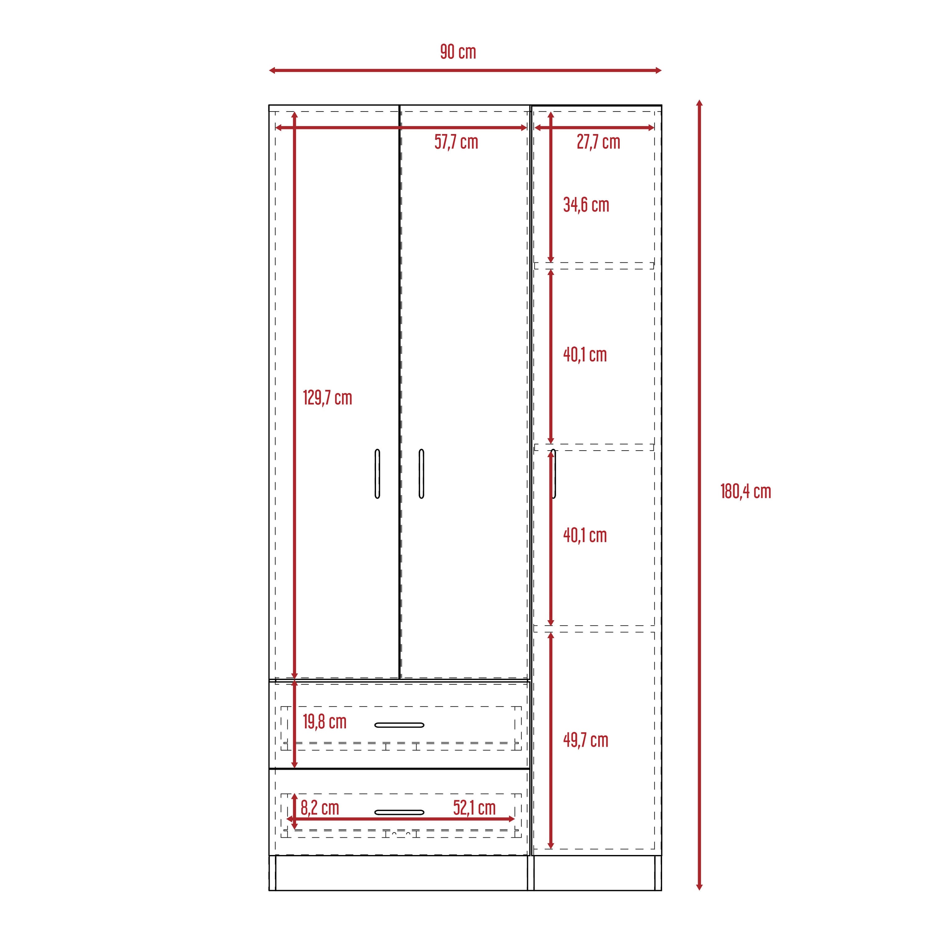Closet con espacio para colgar ropa. Entrepaños para ubicar ropa, zapatos, accesorios y otros. Cajones con gran capacidad de almacenamiento con medidas de: ANCHO 90 ALTO 180 PROFUNDO 47,35