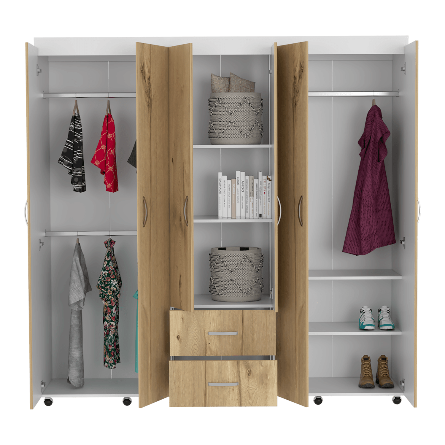 Closet con amplios espacios y entrepaños para organizar, seies pertas abatibles, tres tubos cromados para colgar ropa, dos cajones organizadores multiusos, manijas metalicas, 10 rodachinas con medidas de: 200X 200X 50