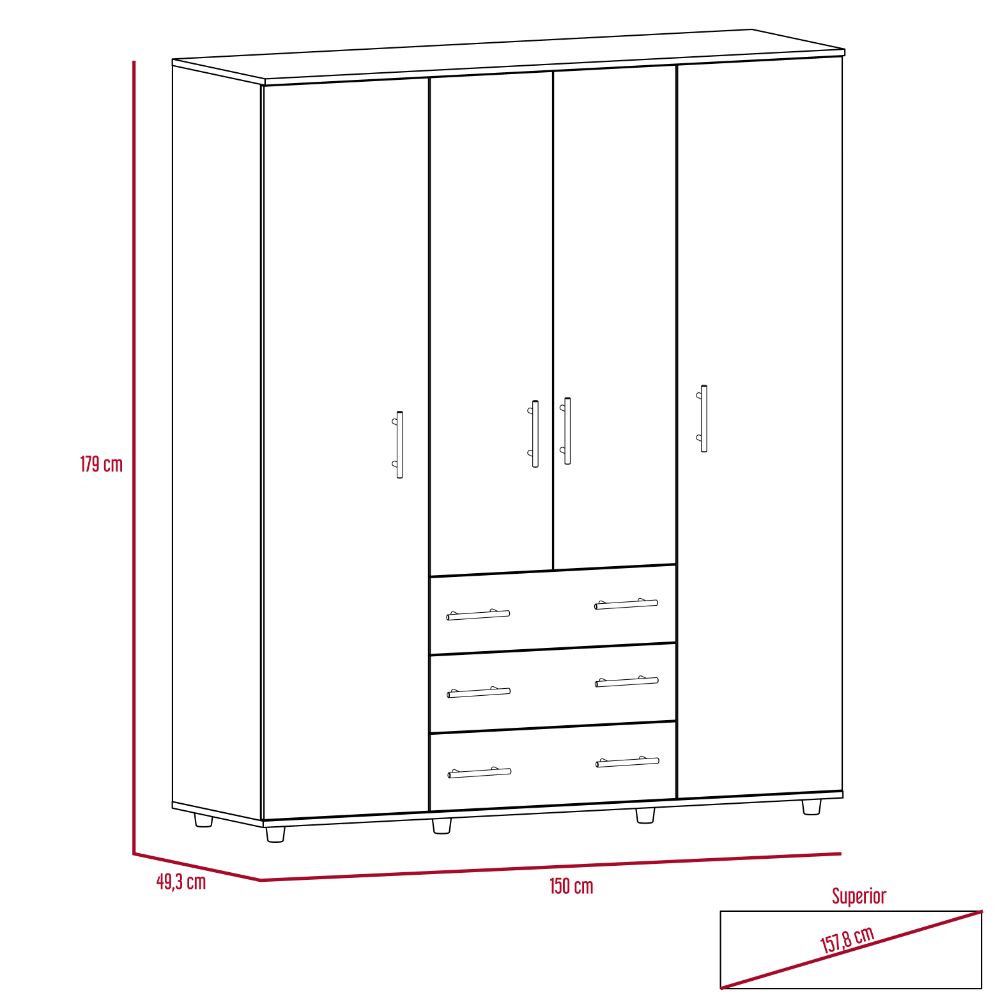 Diseño funcional con 4 puertas abátientes y 3 cajones organizadores, amplios espacios para guardar ropa, zapatos y/o accesorios. 4 tubos cromados para colgar ropa. Posee unas medidas en CM de: Alto: 179 Ancho: 150 Fondo: 49,3 y un peso en KG de: 104,5 NO INCLUYE ARMADO, Hecho de madera aglomerada, limpiar en seco, no productos abrasivos, ni humedad alta , La foto de este producto ha sido ambientada, por lo cual no incluye ningún adorno, ni accesorios, ni piezas adicionales ni ningún otro elemento que lo acompañan. El color presentado en la fotografía es una aproximación al color real.