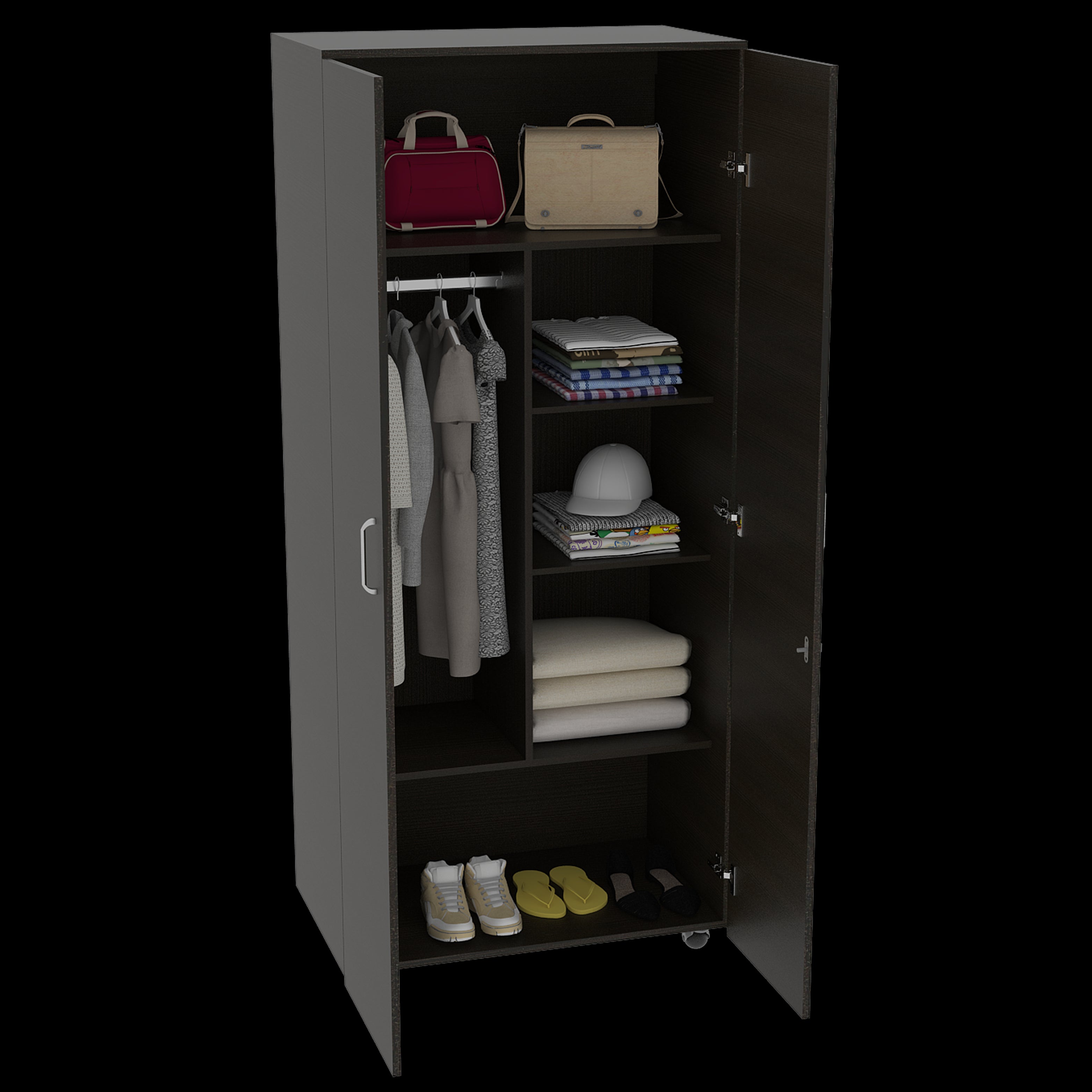 Closet con dos puertas batientes, con maletero, tubo cromado para colgar ropa, compartimiento inferior y superior para organizar ropa, zapatos u accesorios, rodachinas para su facil desplazamiento, incluye cerradura para puerta y pasador. con medidas de: ANCHO 80 ALTO 182,5 PROFUNDO 48,5