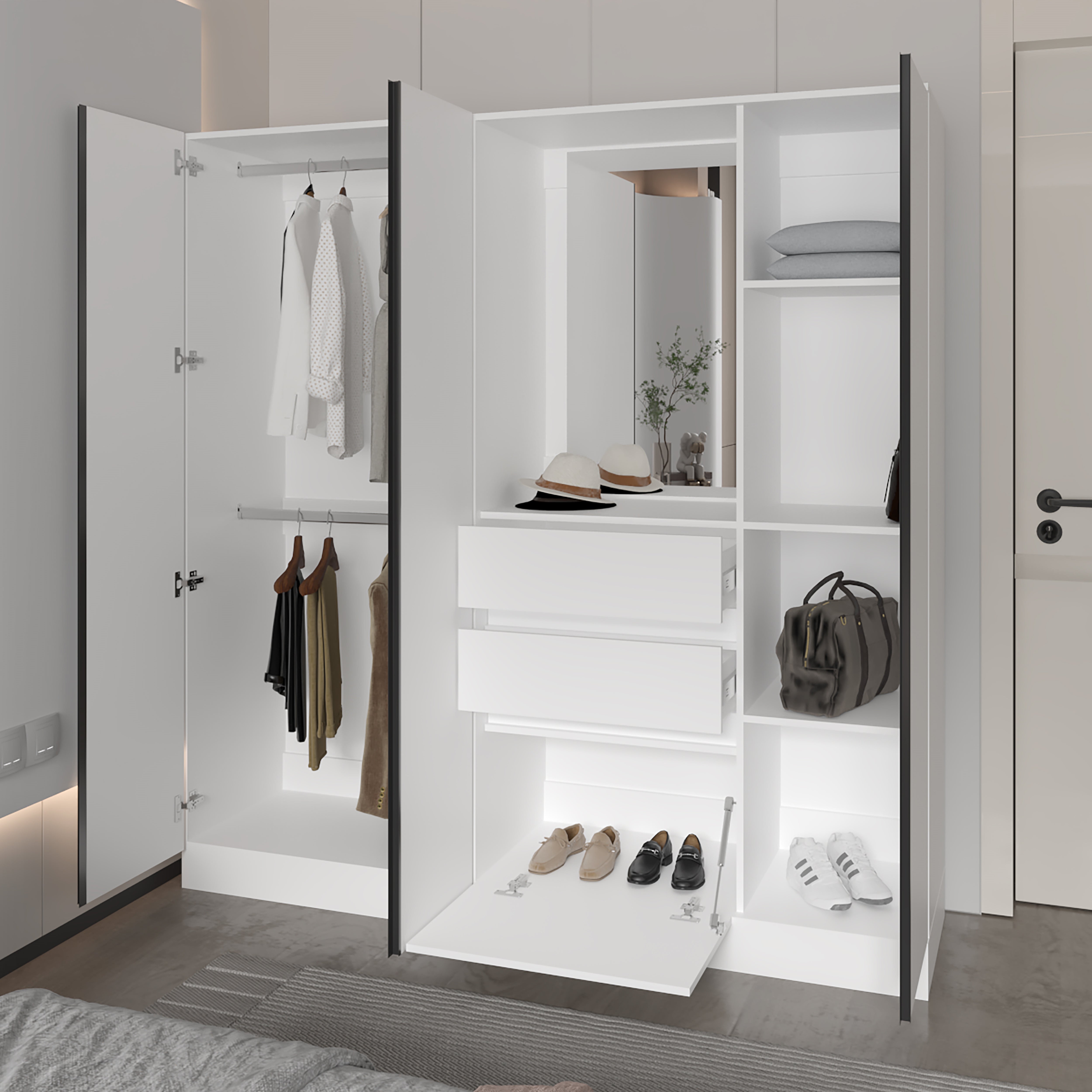 Closet funcional con tres puertas abatibles, tubos cromados para colgar ropa, tres cajones multiusos, zapaterio inferior con puerta abatible, con medidas de ALTO 186 ANCHO 177 FONDO 48