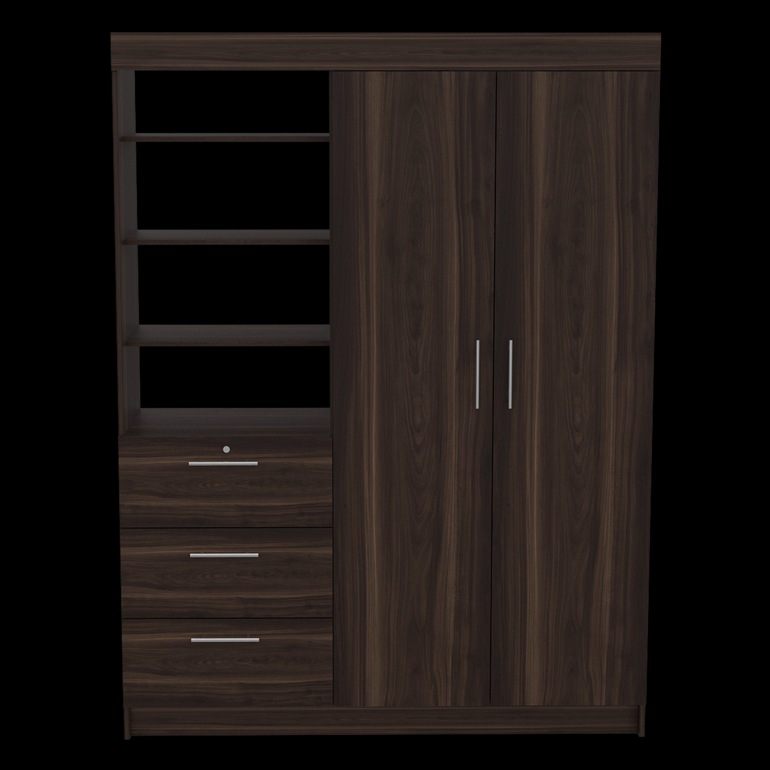 Closet con amplios espacios para guardar ropa, dos tubos, dos puertas abatibles, tres cajones y una cerradura con medidas de: ANCHO 150 ALTO 200,75 PROFUNDO 51,85
