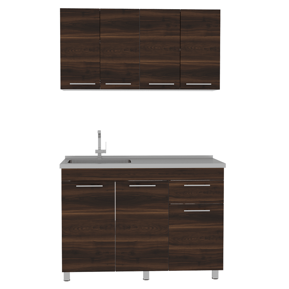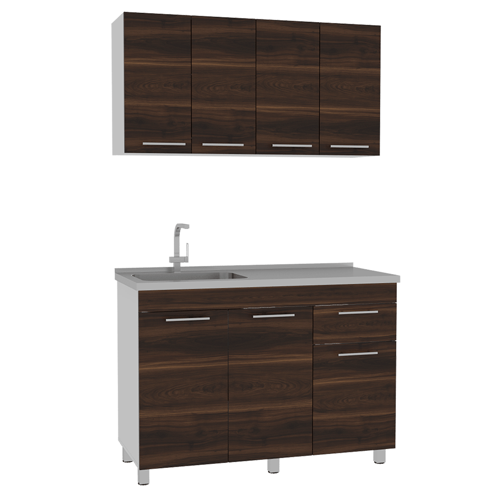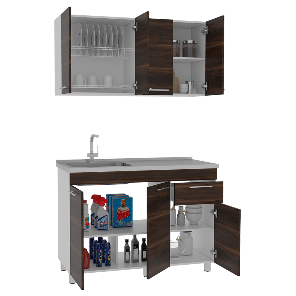 Módulo superior: Incluye locero, portavasos color blanco, cuatro puertas , sirve para mesón con pozuelo derecho o izquierdo. Manijas metálicas. Modulo inferior: Tres puertas batientes y un cajón, manijas metálicas. Incluye Meson lavaplatos, no incluye campana griferia ni elementos decorativos Posee unas medidas en CM de: Alto: Sup: 60 Inf: 87 Ancho:Sup: 120 Inf: 120 Fondo: Sup: 33,5 Inf: 52 y un peso en KG de: 26,9 y 41,4 NO INCLUYE ARMADO, Hecho de madera aglomerada, limpiar en seco, no productos abrasivos, ni humedad alta , La foto de este producto ha sido ambientada, por lo cual no incluye ningún adorno, ni accesorios, ni piezas adicionales ni ningún otro elemento que lo acompañan. El color presentado en la fotografía es una aproximación al color real.