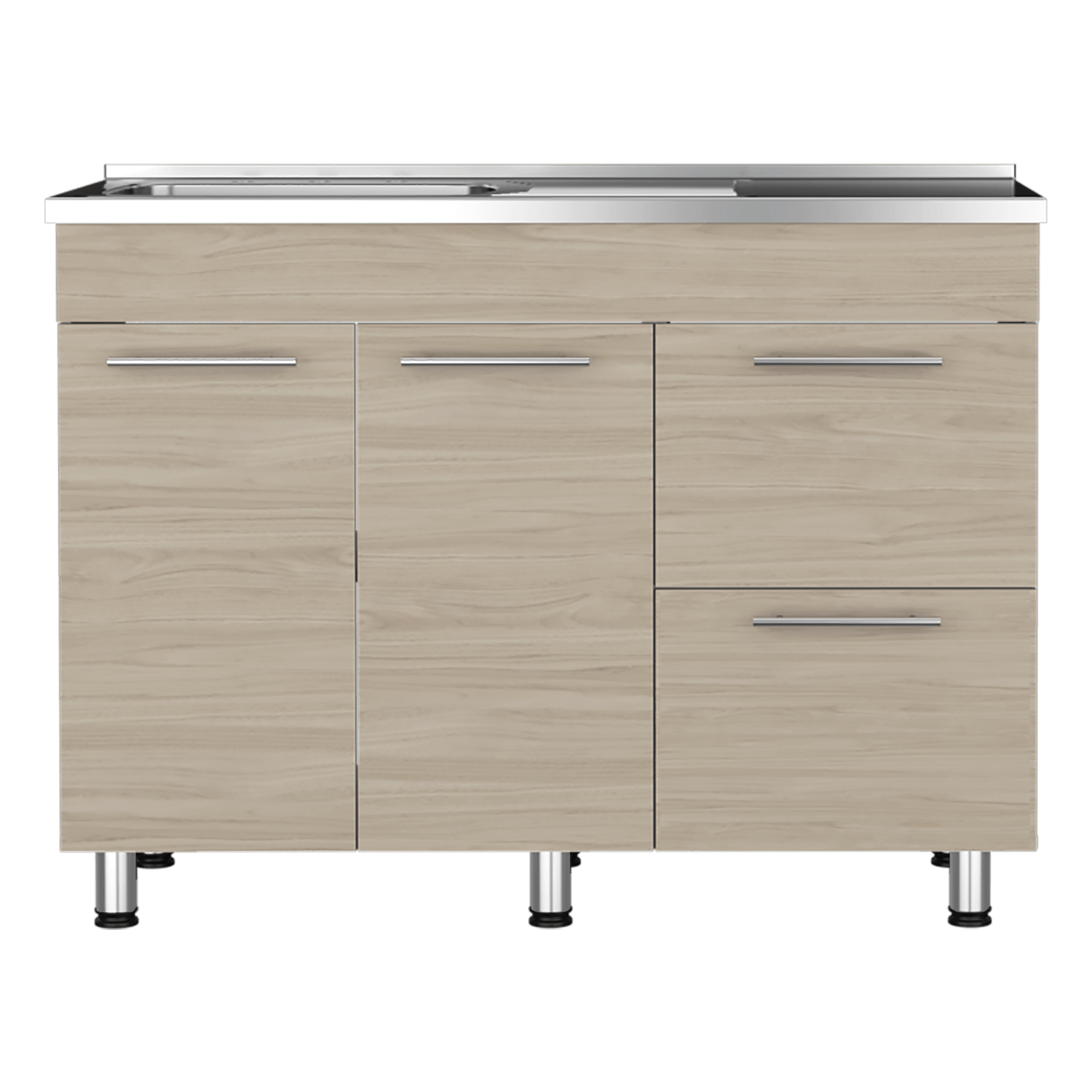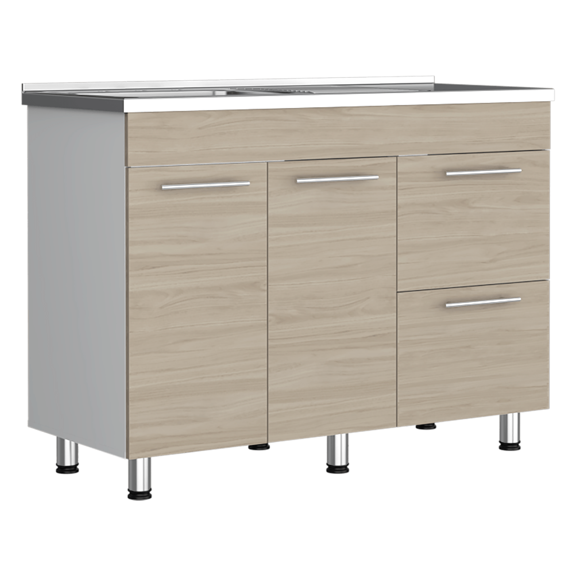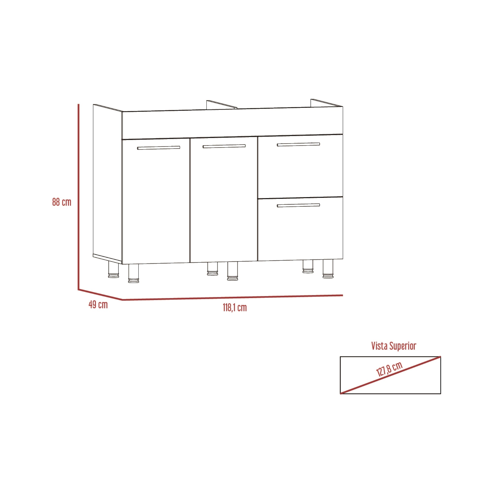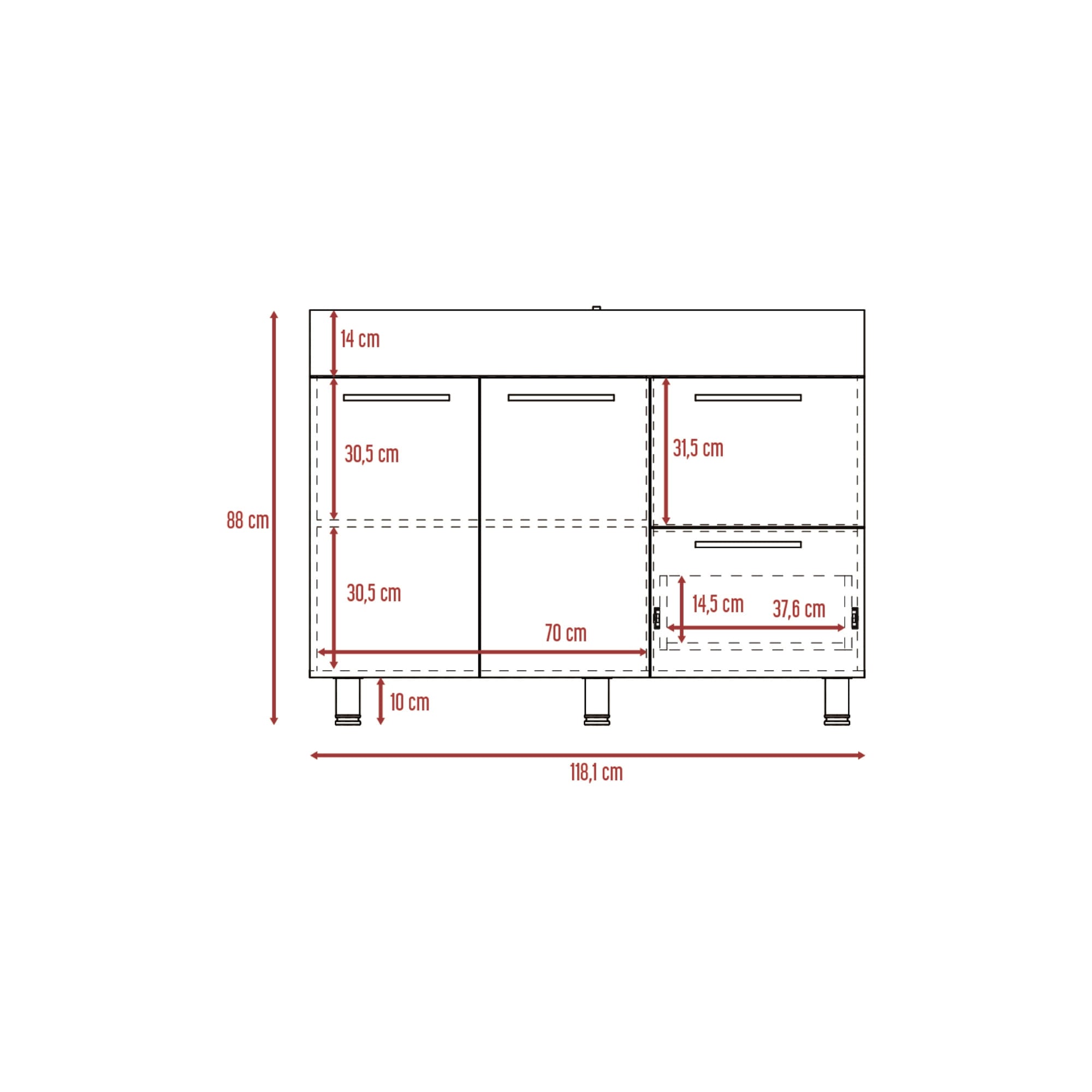 Mueble inferior de cocina no incluye meson, tres puertas batientes y un caon, manijas metalicas con medidas de: ANCHO 118,1 ALTO 88 PROFUNDO 49