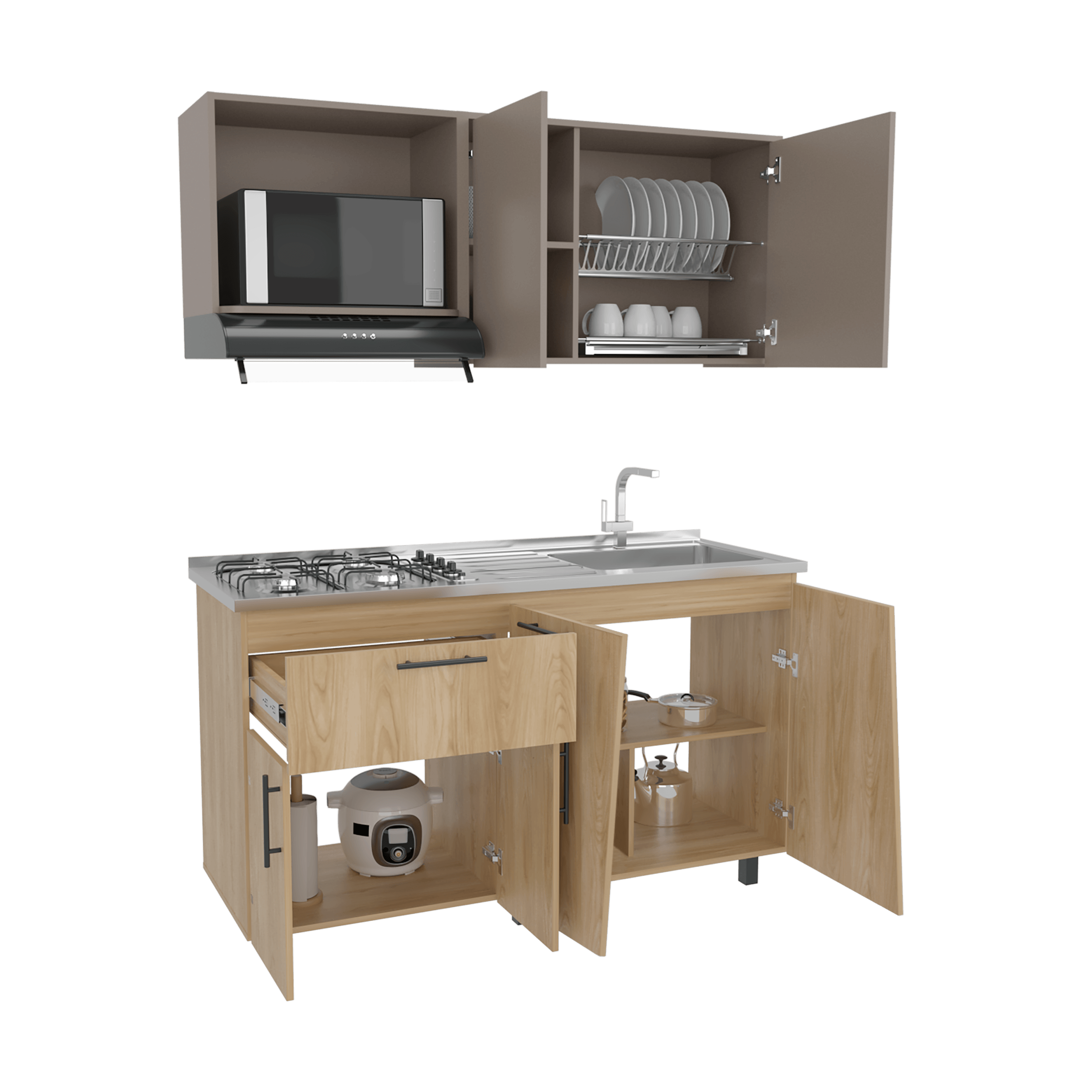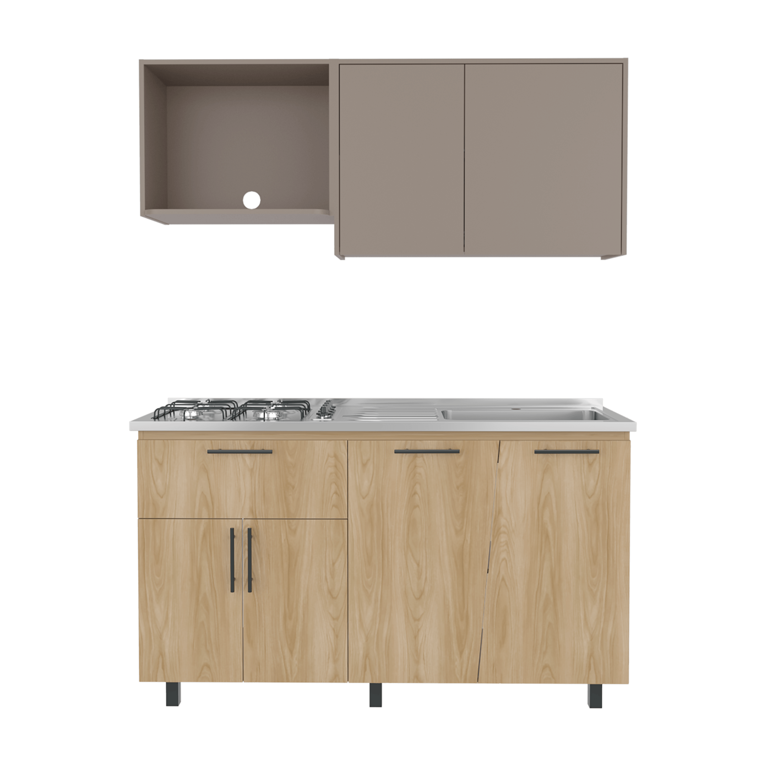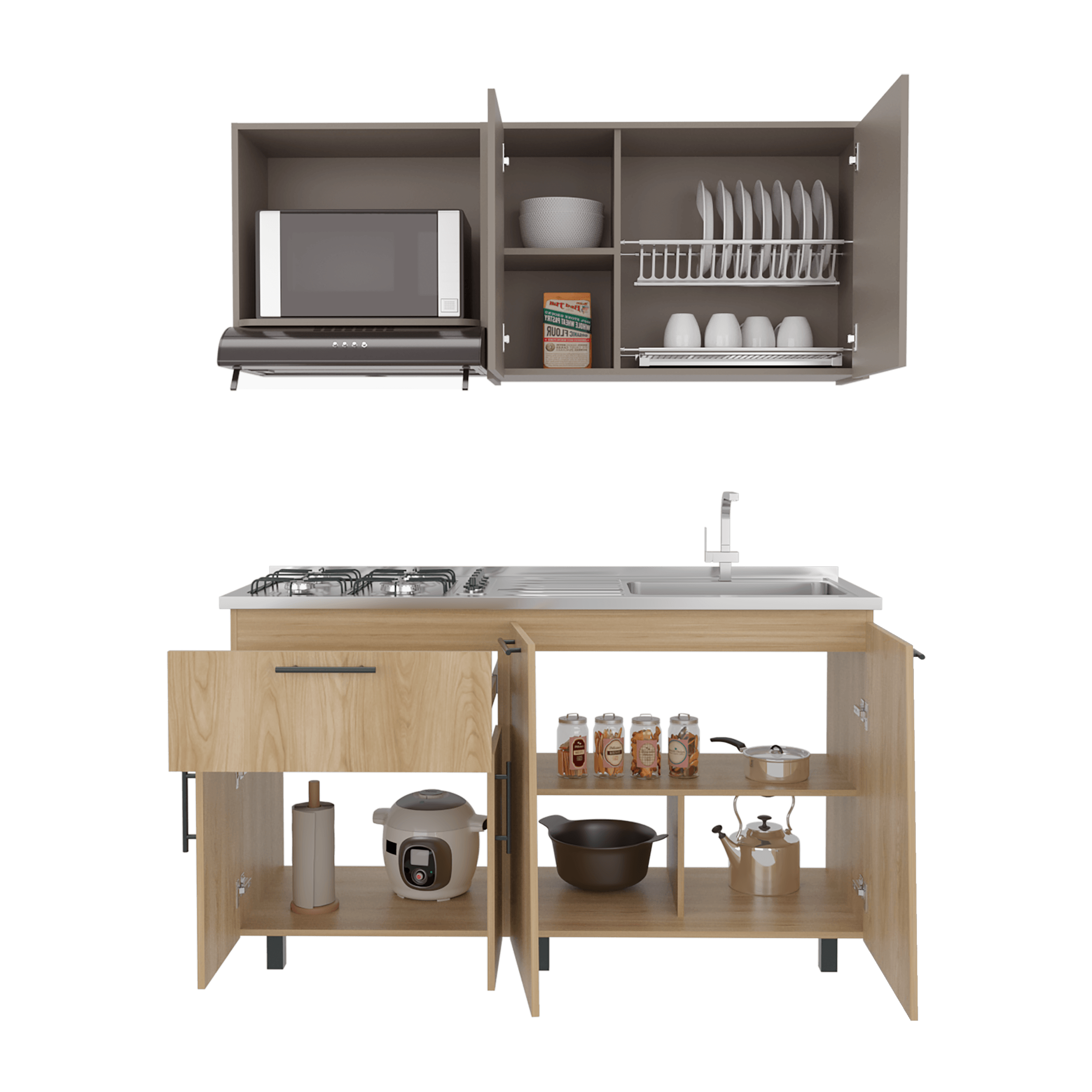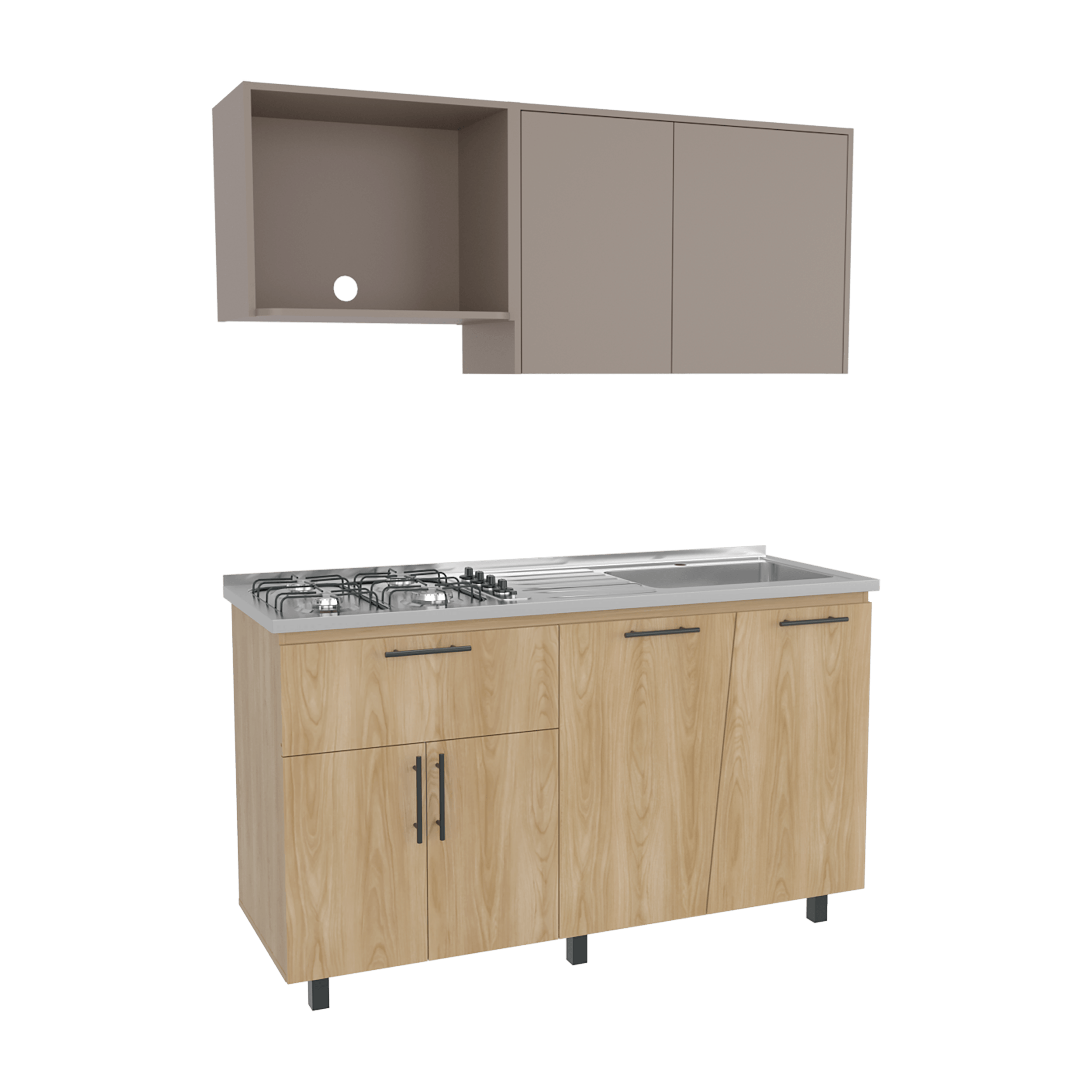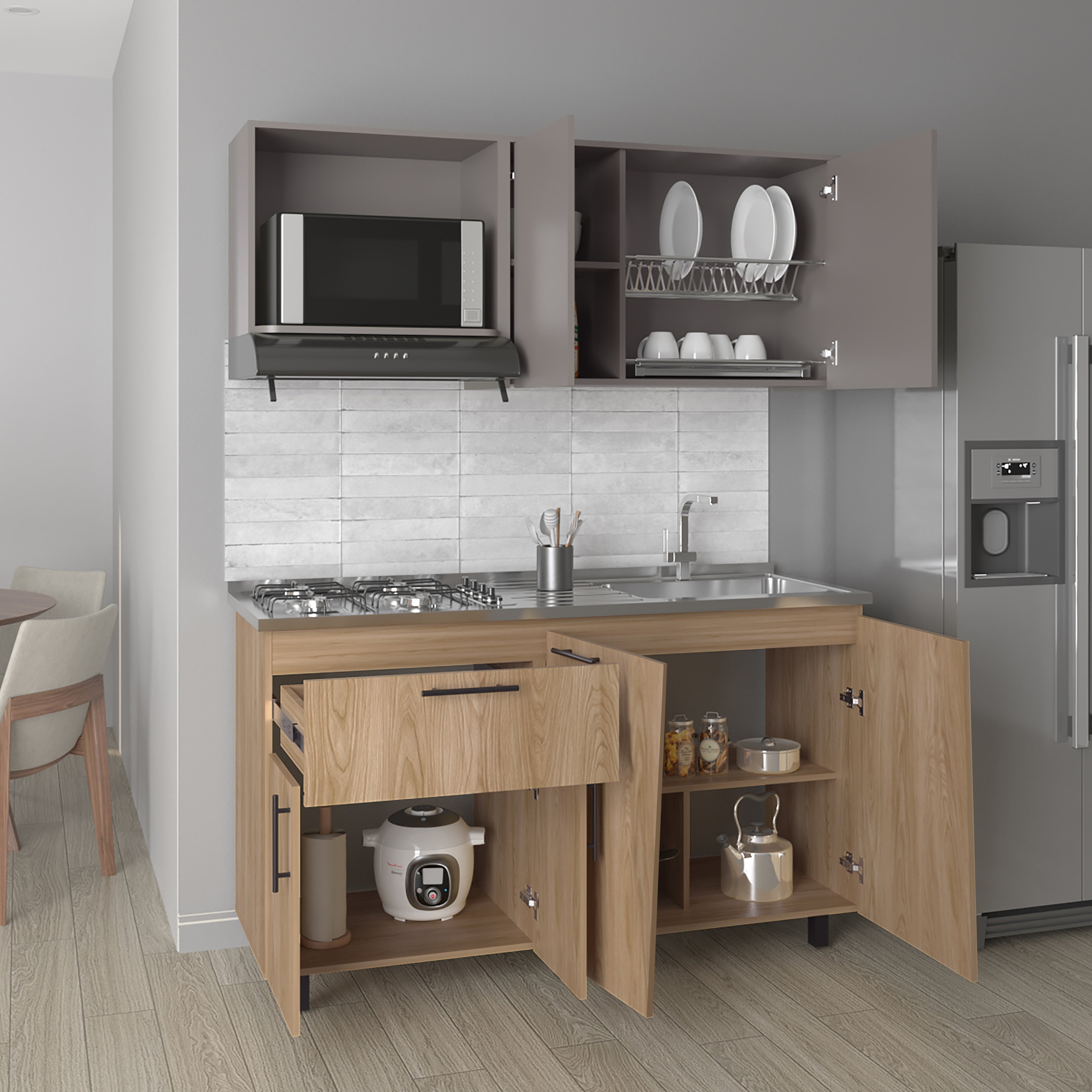 Cocina completa, el modulo superior incluye locero y portavasos, tiene espacio para campana extractora y microondas. El modulo inferior cuenta con 4 puertas batientes, 1 cajón, patas metalicas negras, amplio espacio para guardar alimentos, electrodomesticos u otros, incluye mesón.