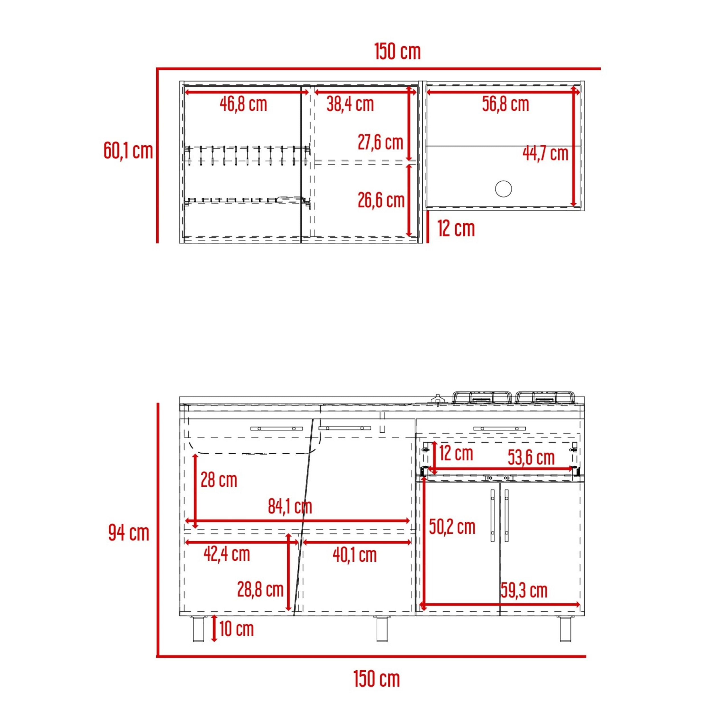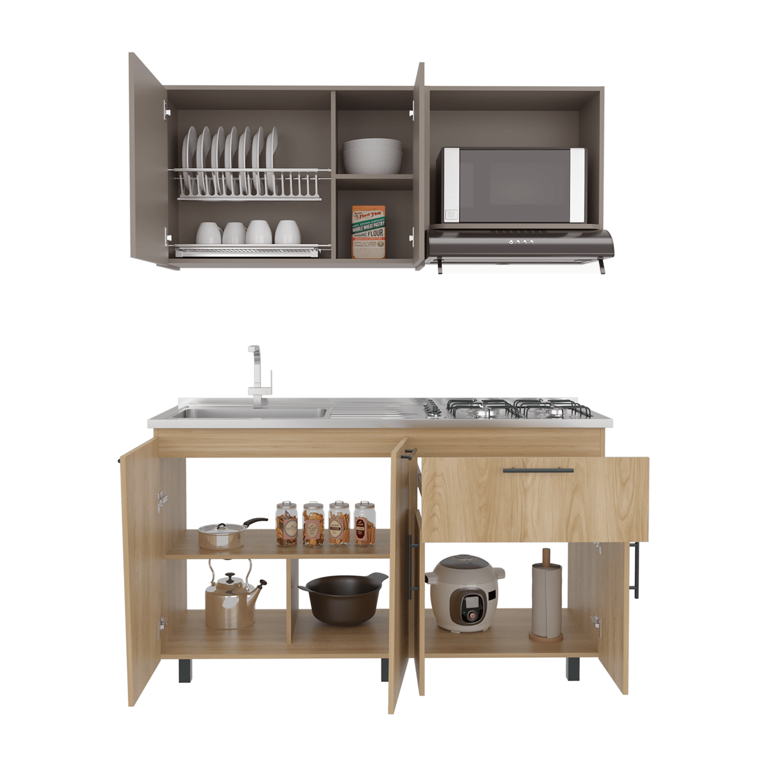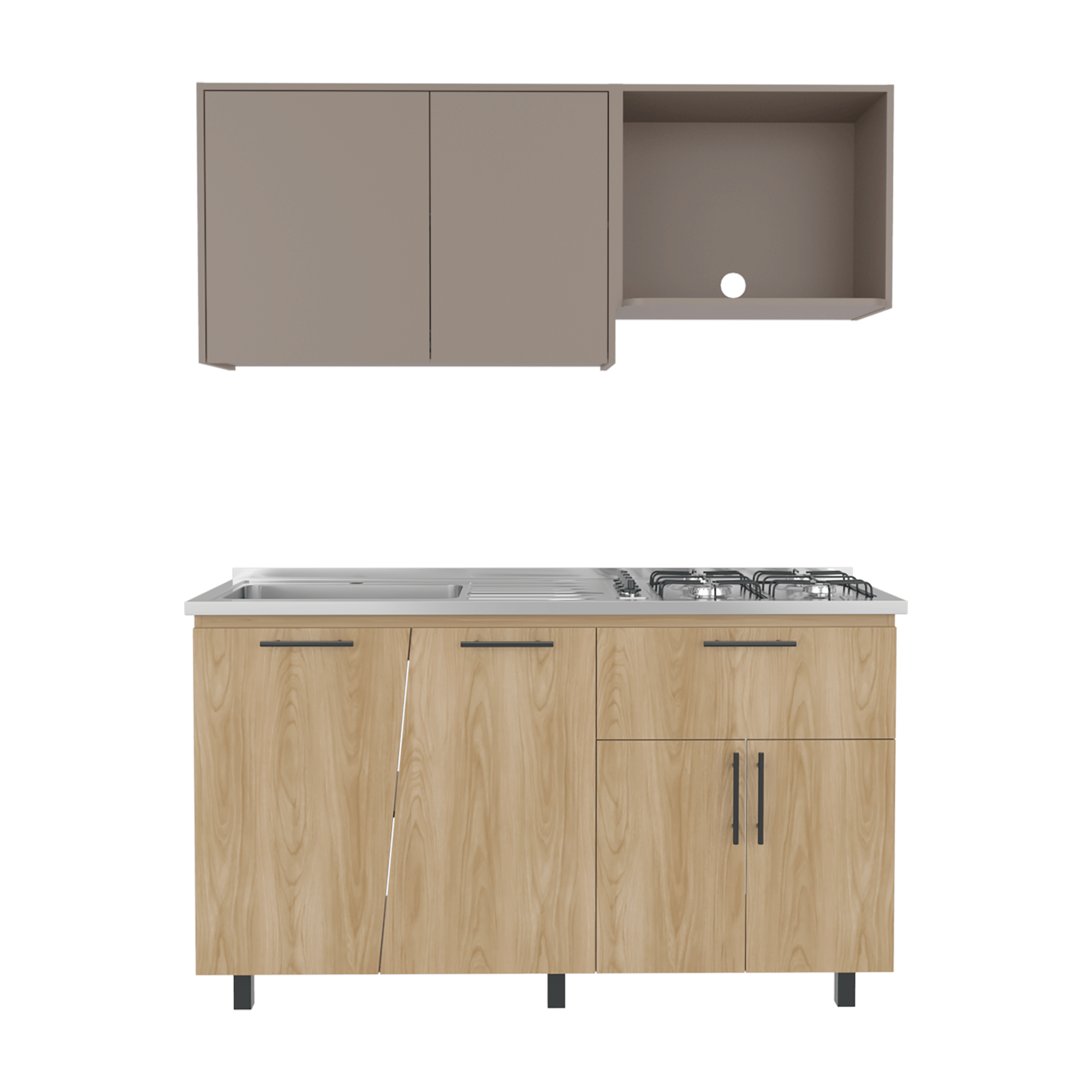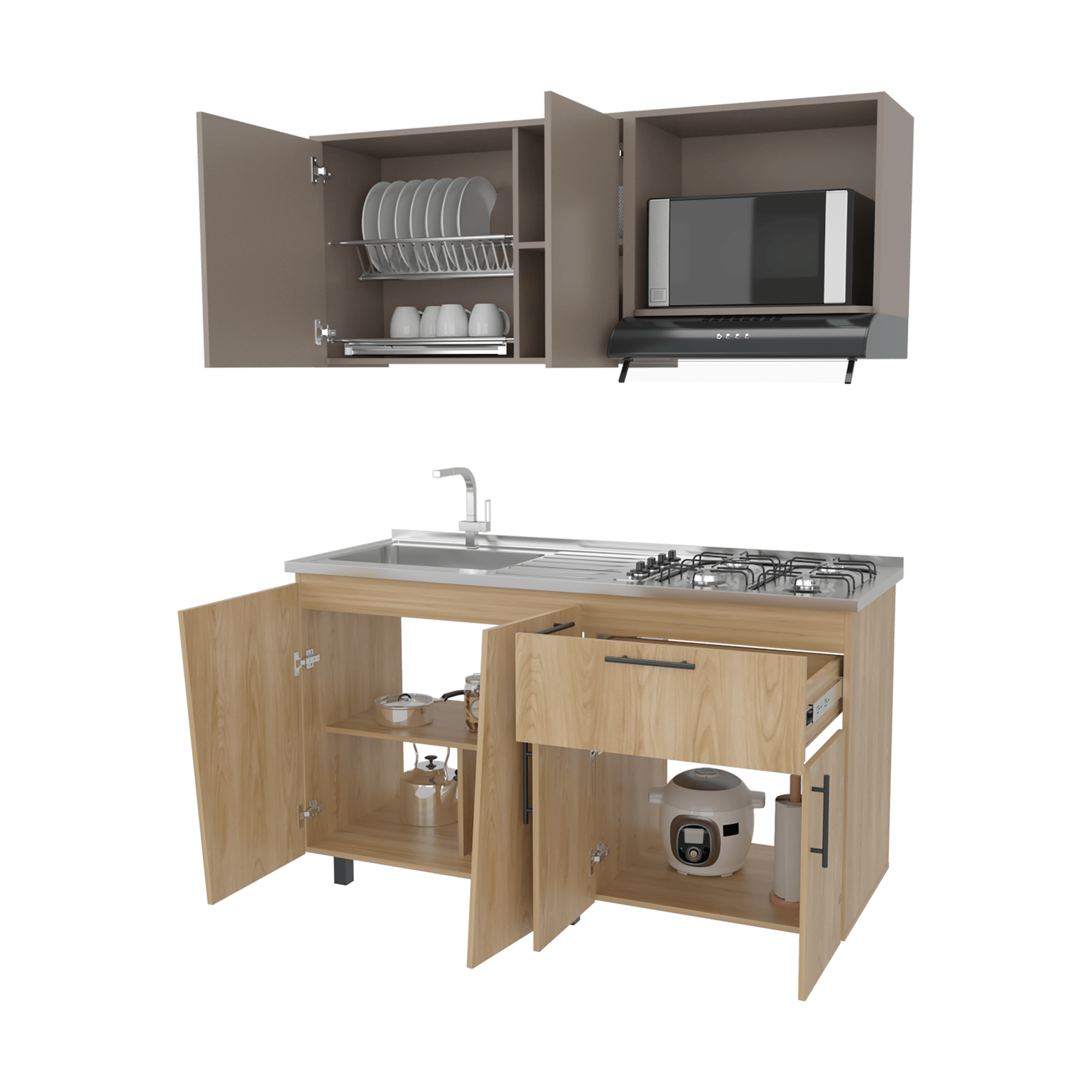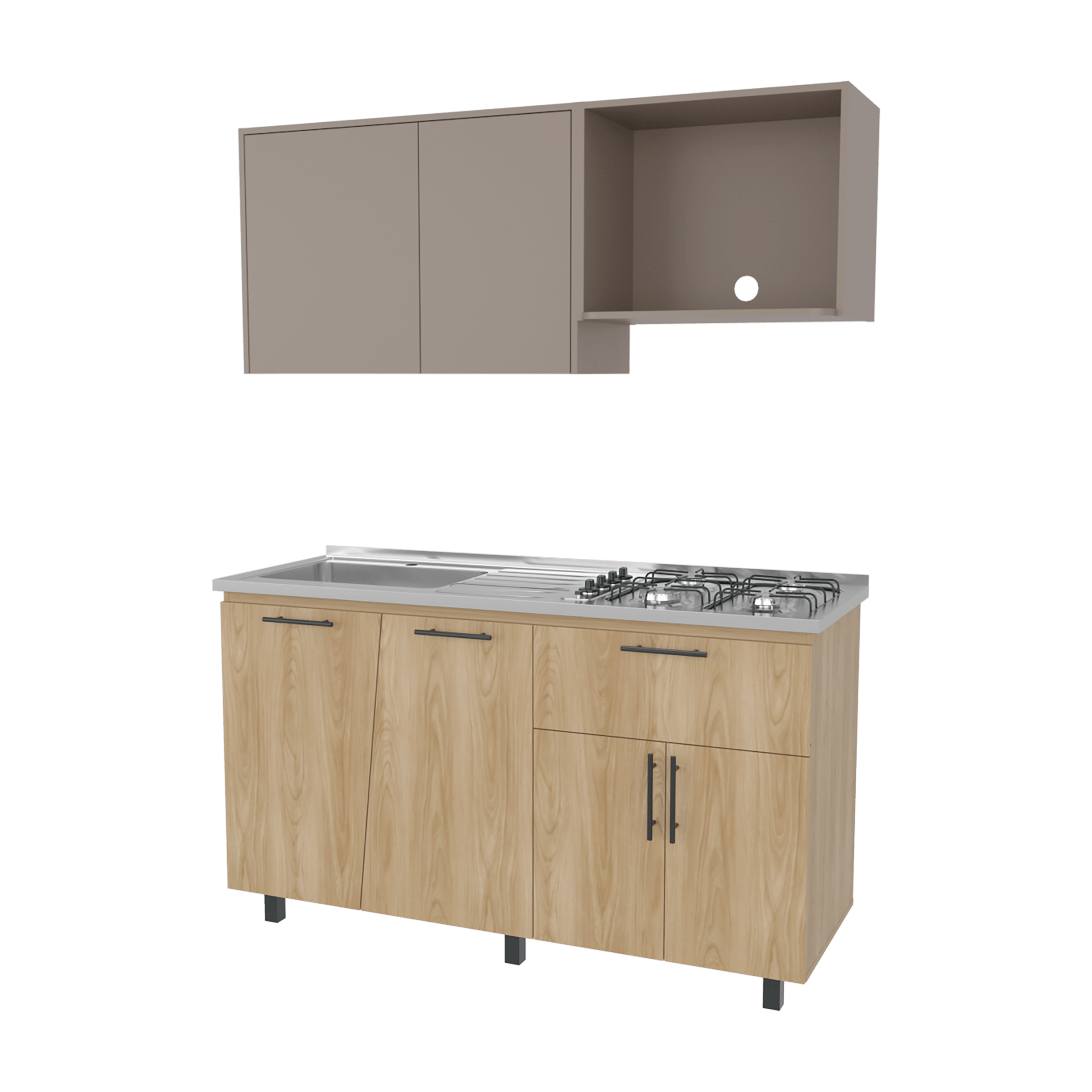 Cocina completa, el modulo superior incluye locero y portavasos, tiene espacio para campana extractora y microondas. El modulo inferior cuenta con 4 puertas batientes, 1 cajón, patas metalicas negras, amplio espacio para guardar alimentos, electrodomesticos u otros, incluye mesón.