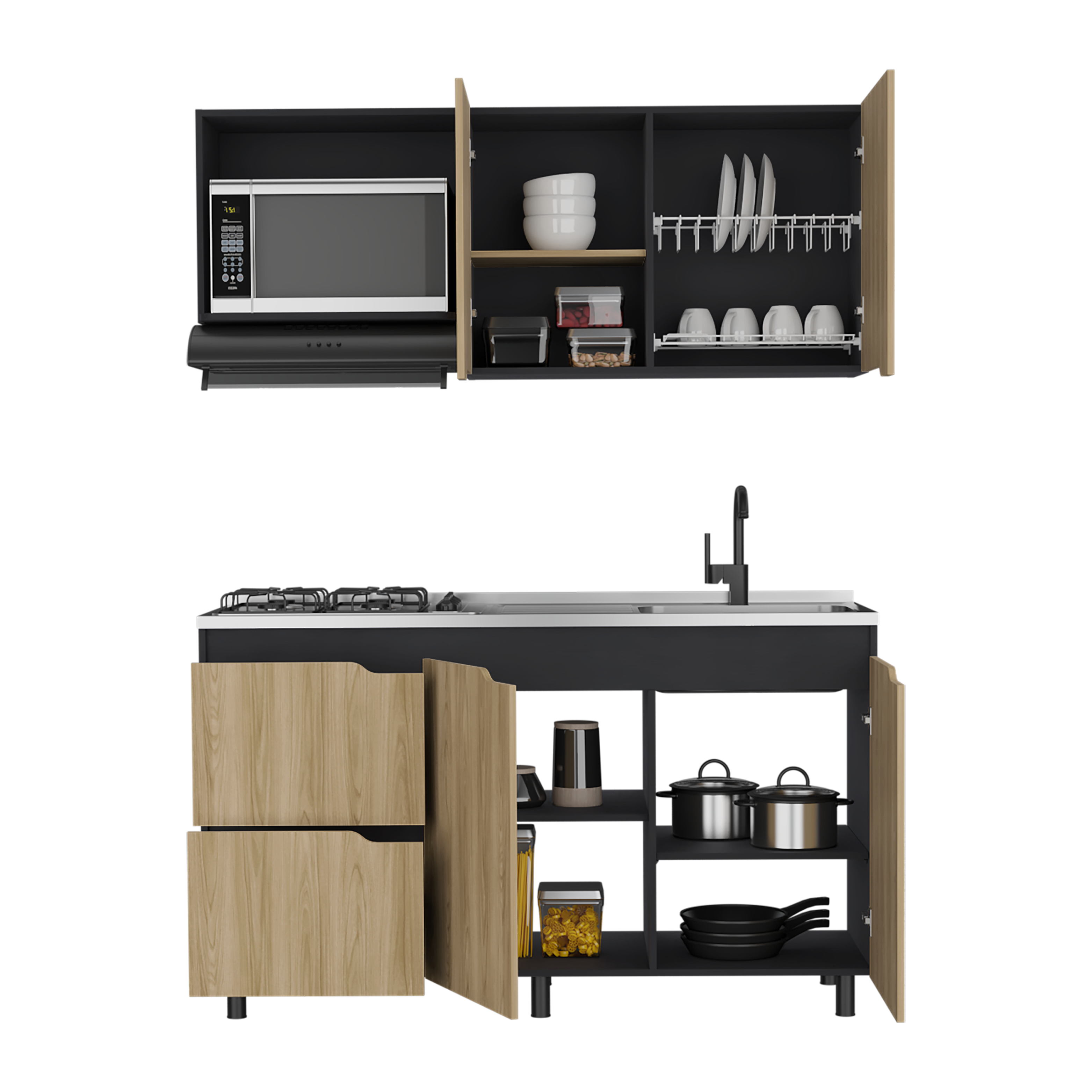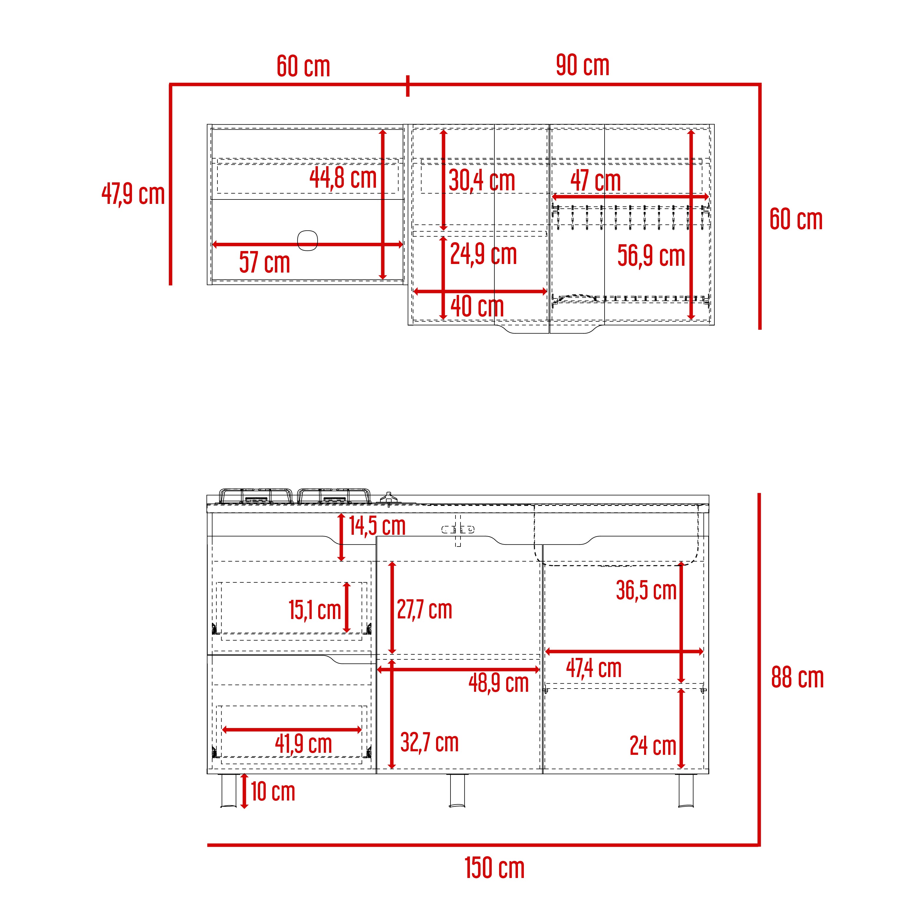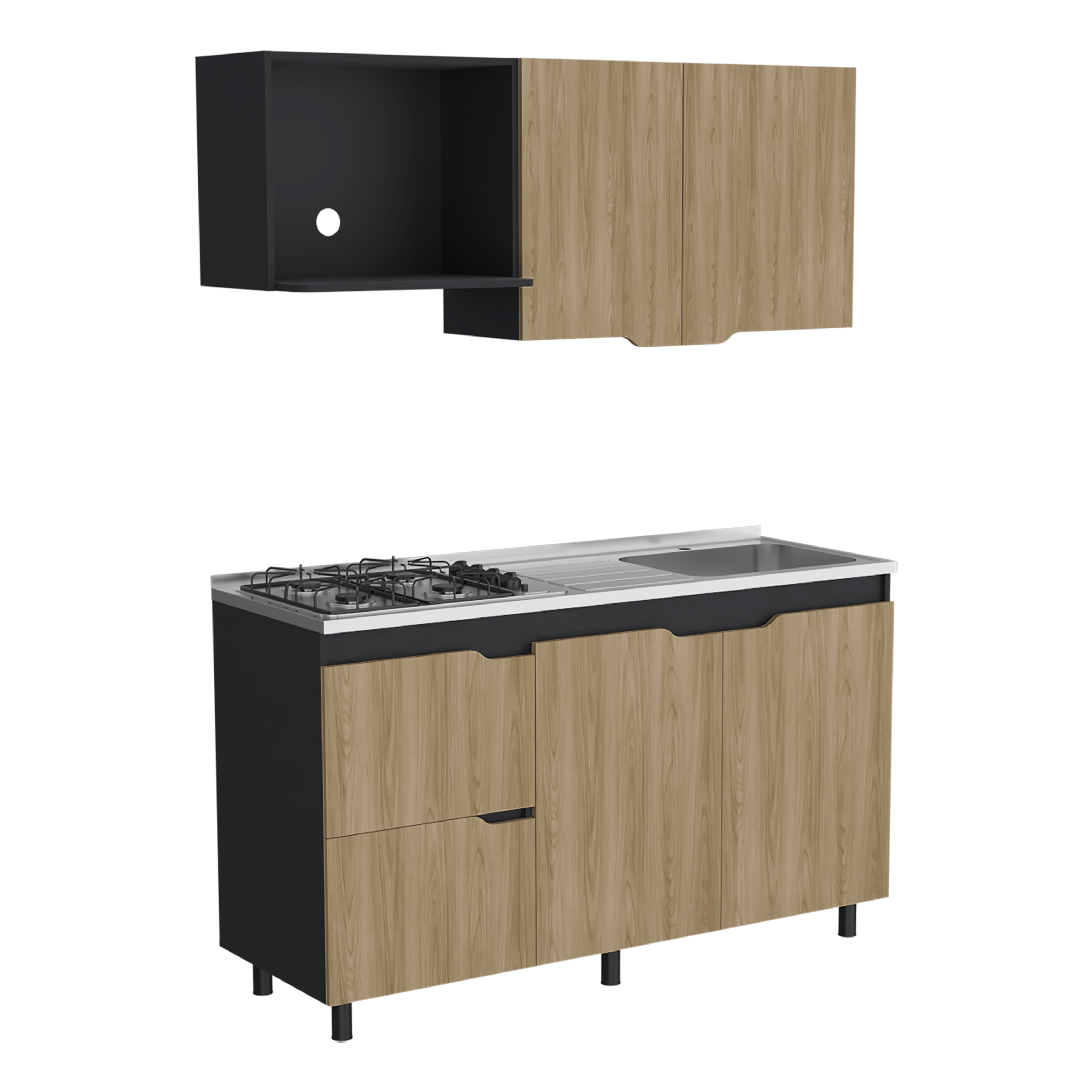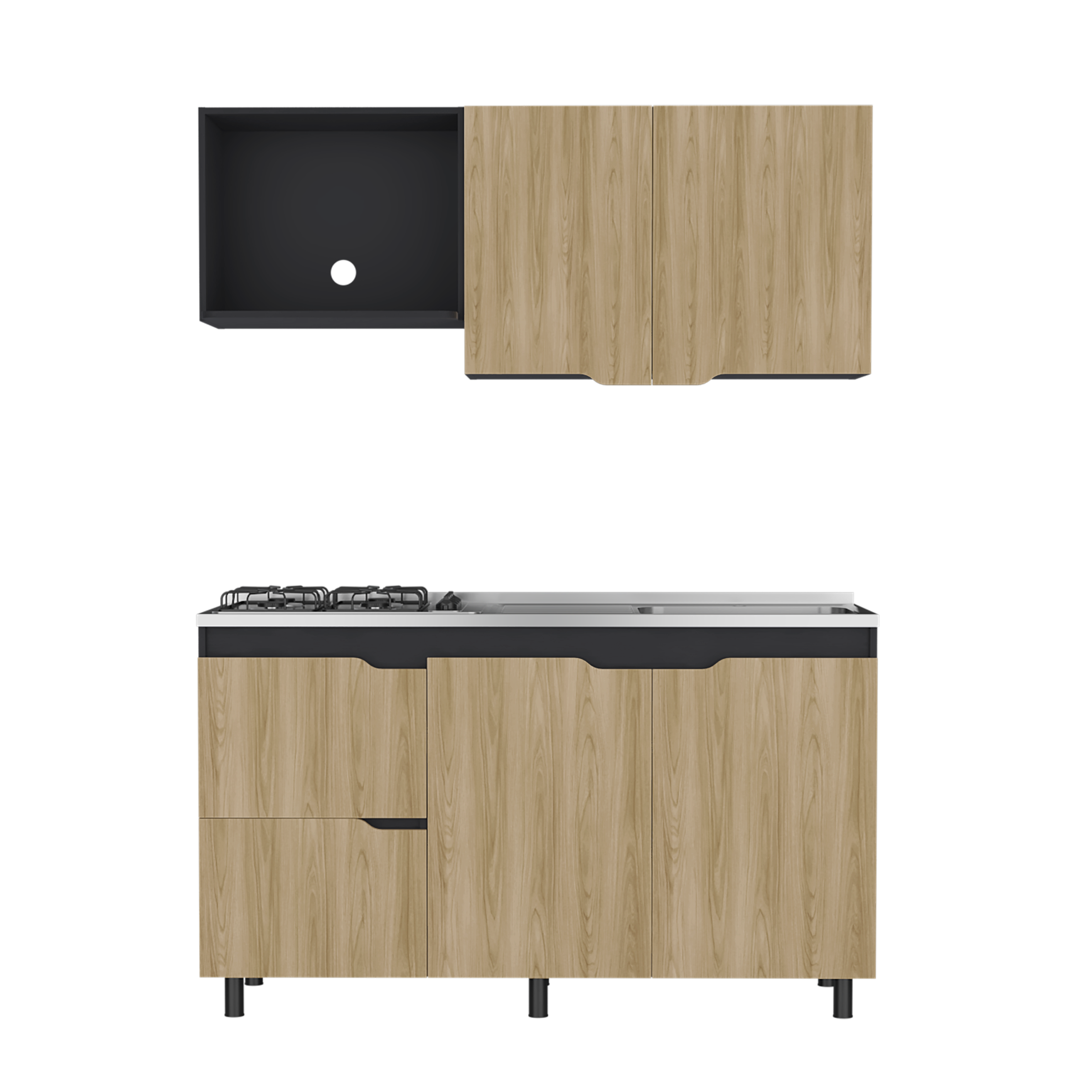 Cocina 150 con mueble superior con dos puertas batientes, incluye locero y portavasos, espacio para microondas, medidas de 60 alto ancho 150 fondo 33,7, mueble inferior con dos cajones, dos puertas abatibles, patas en acero con nivelador, incluye meson derecho, medidas de 88 alto 150 ancho 51,5 fondo con medidas de: ALTO 88 ANCHO 150 FONDO 51,5