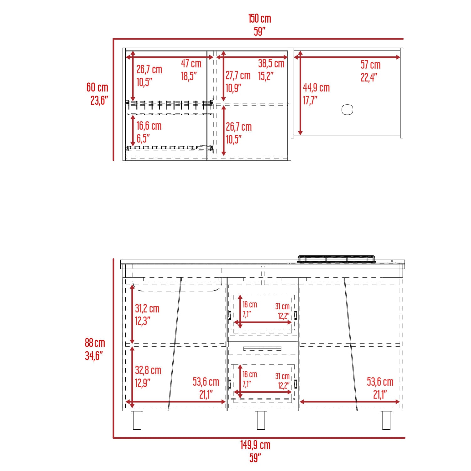Cocina 150 con mueble superior con dos puertas, incluye locero y portavasos blanco, modulo para camapana de 60cm, manijas metalicas, cuatro puertas, dos cajones, patas y manijas metalicas con medidas de: ALTO 94,5 ANCHO 154,1 FONDO 52