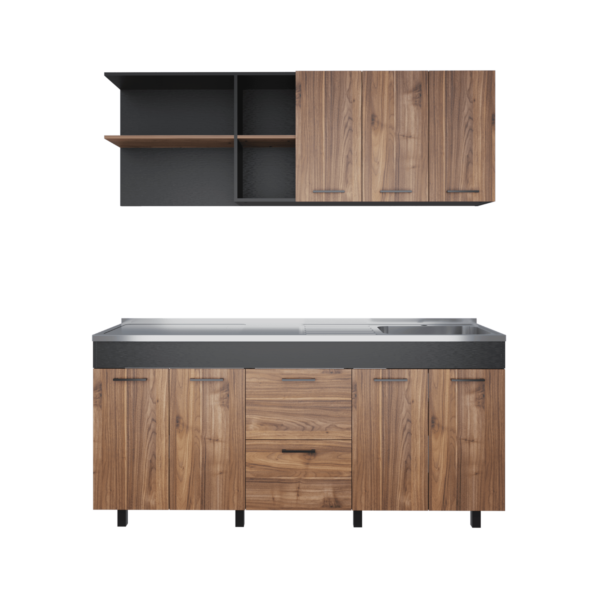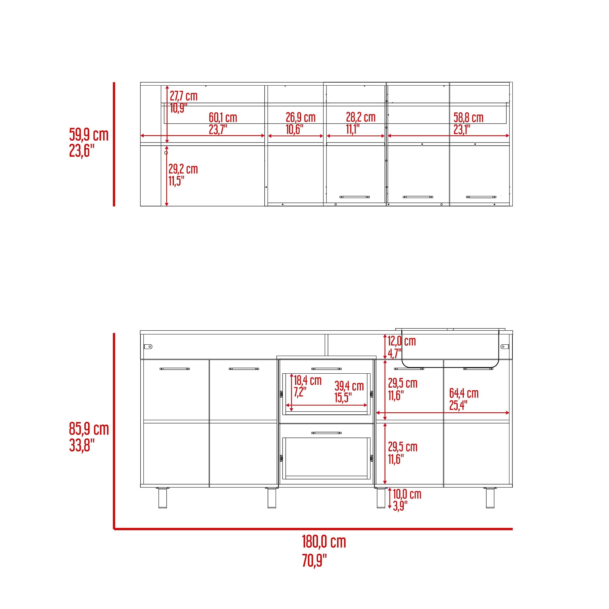 Cocina con mueble superior con tres puertas abatibles ,amplio espacio de almacenamiento, tres entrepaños para ubicar objetos de cocina, medidas de alto 60 cm, ancho 180 cm, fondo 33,6 cm, mueble inferior con dos cajones, cuatro puertas abatibles, patas con acero nivelador, manijas en acero medidas de alto 85 cm, ancho 180 cm, fondo 52 cm, incluye meson