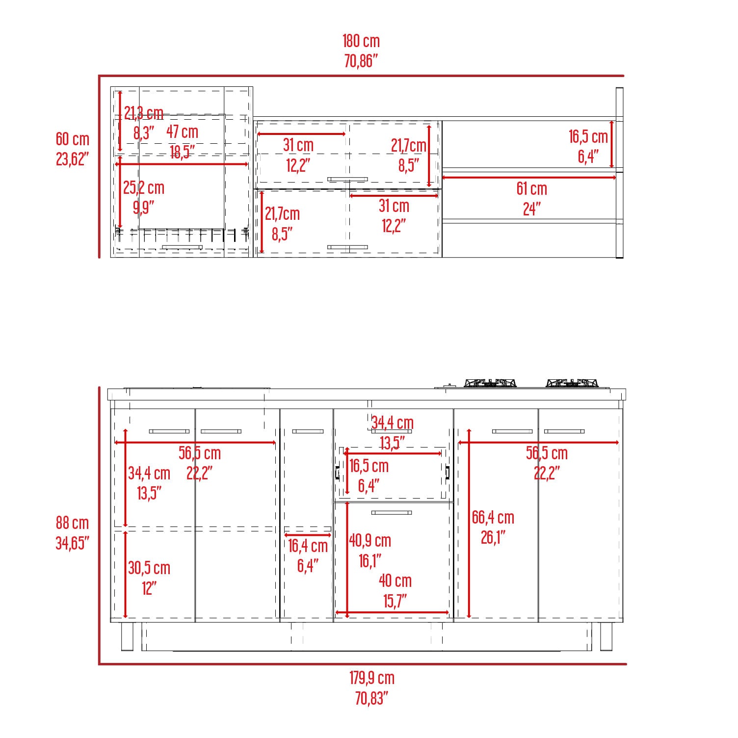 Cocina de 180 con mueble superior con una puerta baiente y dos abatibles, incluye locero color gris, espacio para campana de 60 cm, manijas metalicas, mueble inferior con seis puertas batientes, una cajon, patas y manijas metalicas, sirve para meson izquierdo con medidas de: ALTO 88 ANCHO 180 FONDO 56,6