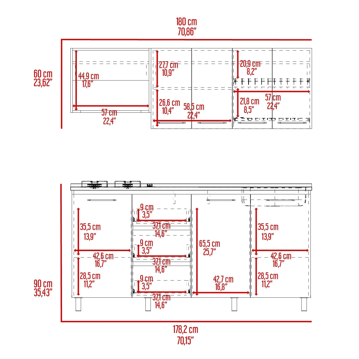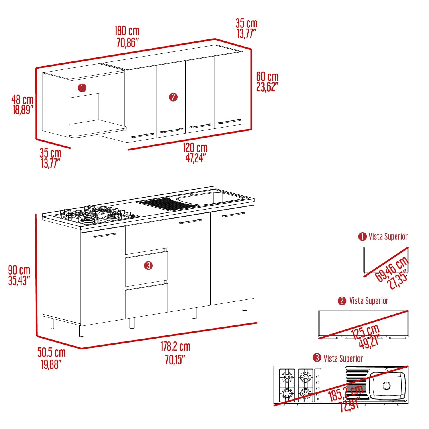 Cocina de 180 con mueble superiro con cuatro puertas batientes, incluye locero y portavasos, espacio para microondas, medidas de 60 alto ancho 180 fondo 35, mueble inferior con tres cajones, tres puertas abatibles, patas en acero con nivelador, medidaas de 90 alto, ancho 180, fondo 50,5 incluye meson derecho con medidas de: ALTO 90 ANCHO 180 FONDO 50,5