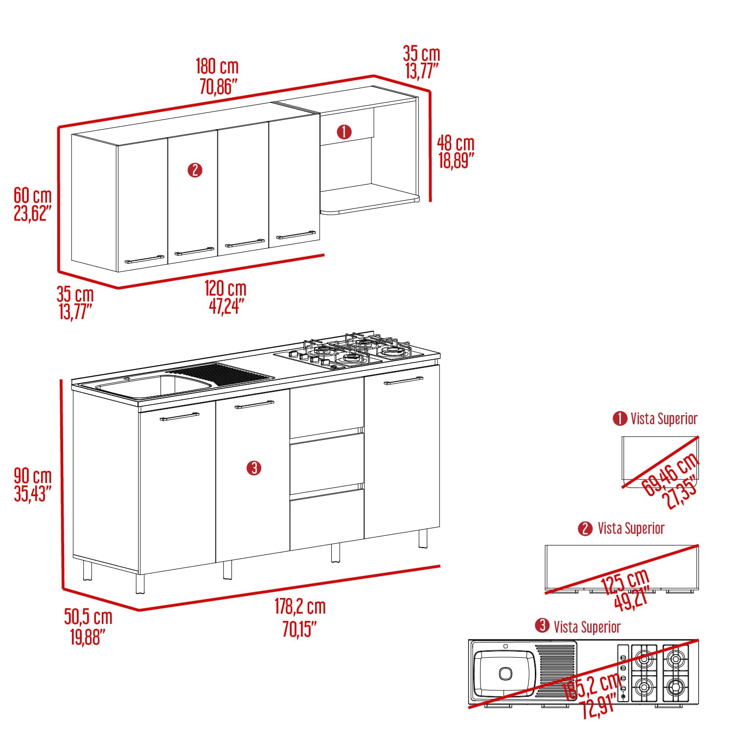 Cocina de 180 con mueble superiro con cuatro puertas batientes, incluye locero y portavasos, espacio para microondas, medidas de 60 alto ancho 180 fondo 35, mueble inferior con tres cajones, tres puertas abatibles, patas en acero con nivelador, medidaas de 90 alto, ancho 180, fondo 50,5 incluye meson izquierdo con medidas de: ALTO 90 ANCHO 180 FONDO 50,5