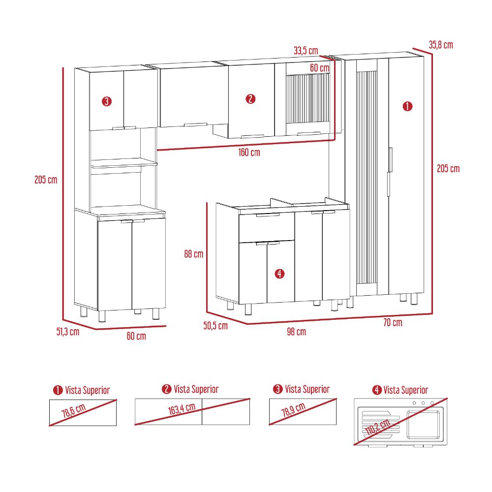 Modulo superior: Puerta con lamina de acrilico ranurado, incluye locero, manijas en aluminio. Espacio para campana, cuatro puertas abatibles, un cajón y patas metálicas. Manijas en aluminio. Mueble inferior: Cuatro puertas abatibles, un cajón, patas metálicas, manijas en aluminio.Incluye Meson derecho, no incluye campana estufa ni griferia, ni elementos decorativos. Posee unas medidas en CM de: Alto: 60 , Inf: 88 Ancho: Sup: 160 Inf: 98. Fondo: Sup: 33,5 Inf: 50,5 y un peso en KG de: 29,6 y 33,8 NO INCLUYE ARMADO, Hecho de madera aglomerada, limpiar en seco, no productos abrasivos, ni humedad alta , La foto de este producto ha sido ambientada, por lo cual no incluye ningún adorno, ni accesorios, ni piezas adicionales ni ningún otro elemento que lo acompañan. El color presentado en la fotografía es una aproximación al color real.