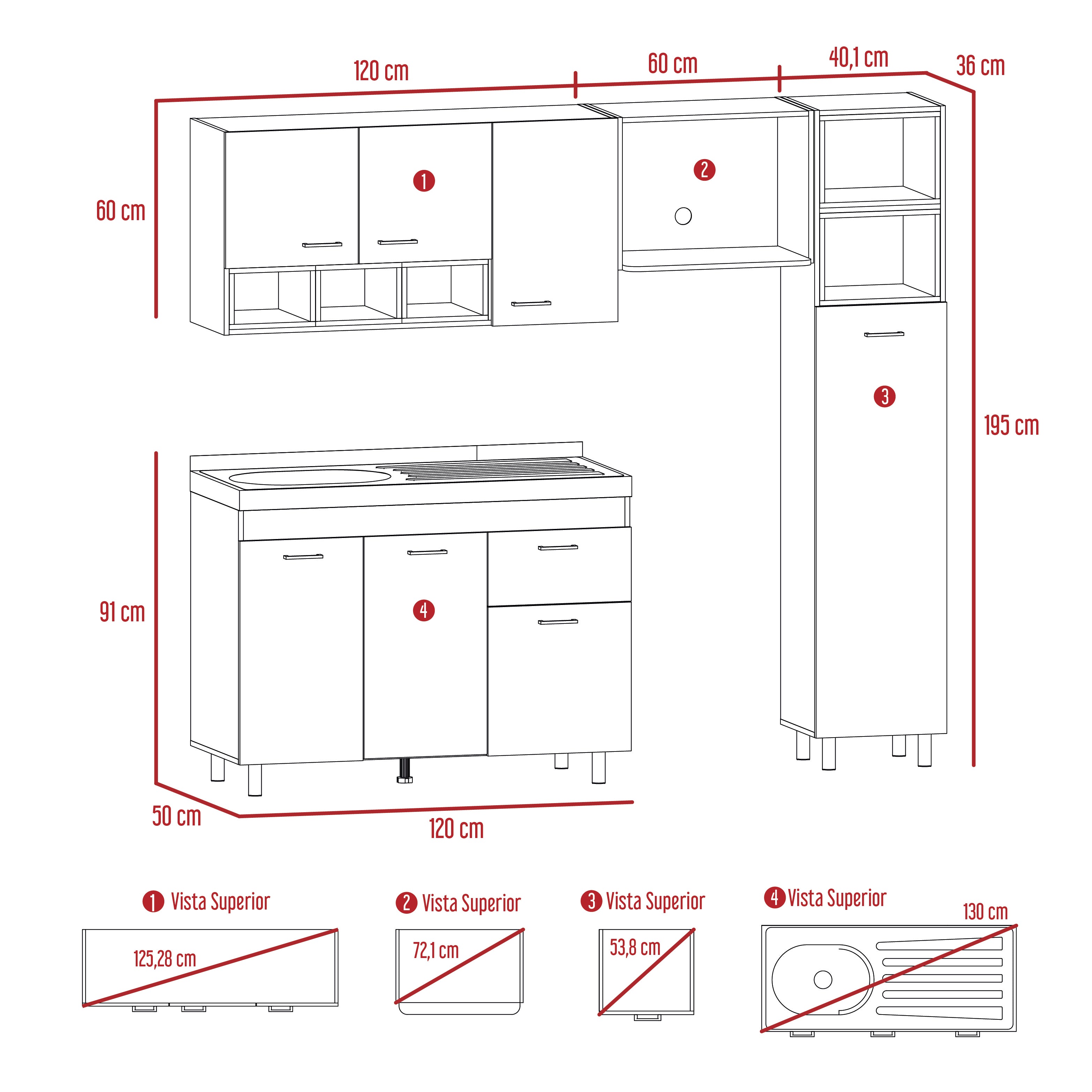 Cocina completa en la parte inferior con manijas metalicas, tres puertas abatibles, amplios espacios para guardar alimentos utensilios y otros, un cajon organizador, en la parte superior manijas metalicas, tres puertas abatibles, amplios espacios para uardar alimentos, modulo de microondas, de facil armado espacio para campana de 60cm,alacena para cocina, manijas metalicas, una puerta amplios espacio para colocar objetos utensilios guardar alimentos, No incluye campana, ni griferia ni elementos decorativos con medidas de: ANCHO 220 ALTO 195 PROFUNDO 50
