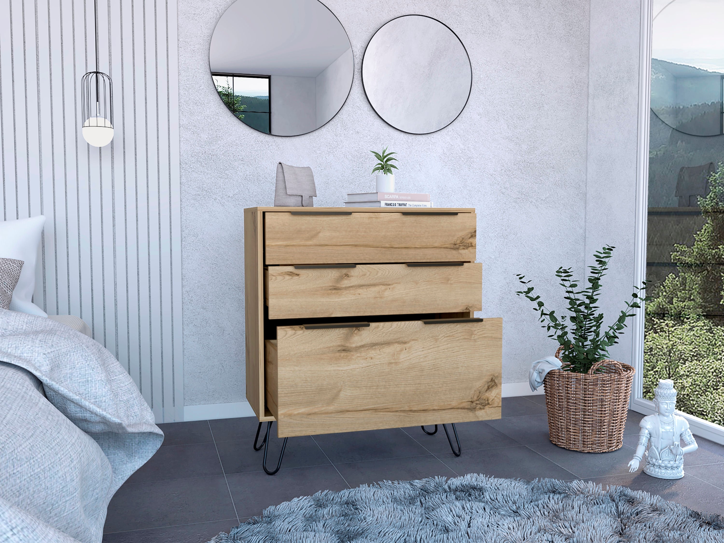 Comoda con tres cajones, patas metalicas, seis manijas soporta 45 kg con medidas de: ANCHO 76,5 ALTO 90,3 PROFUNDO 35