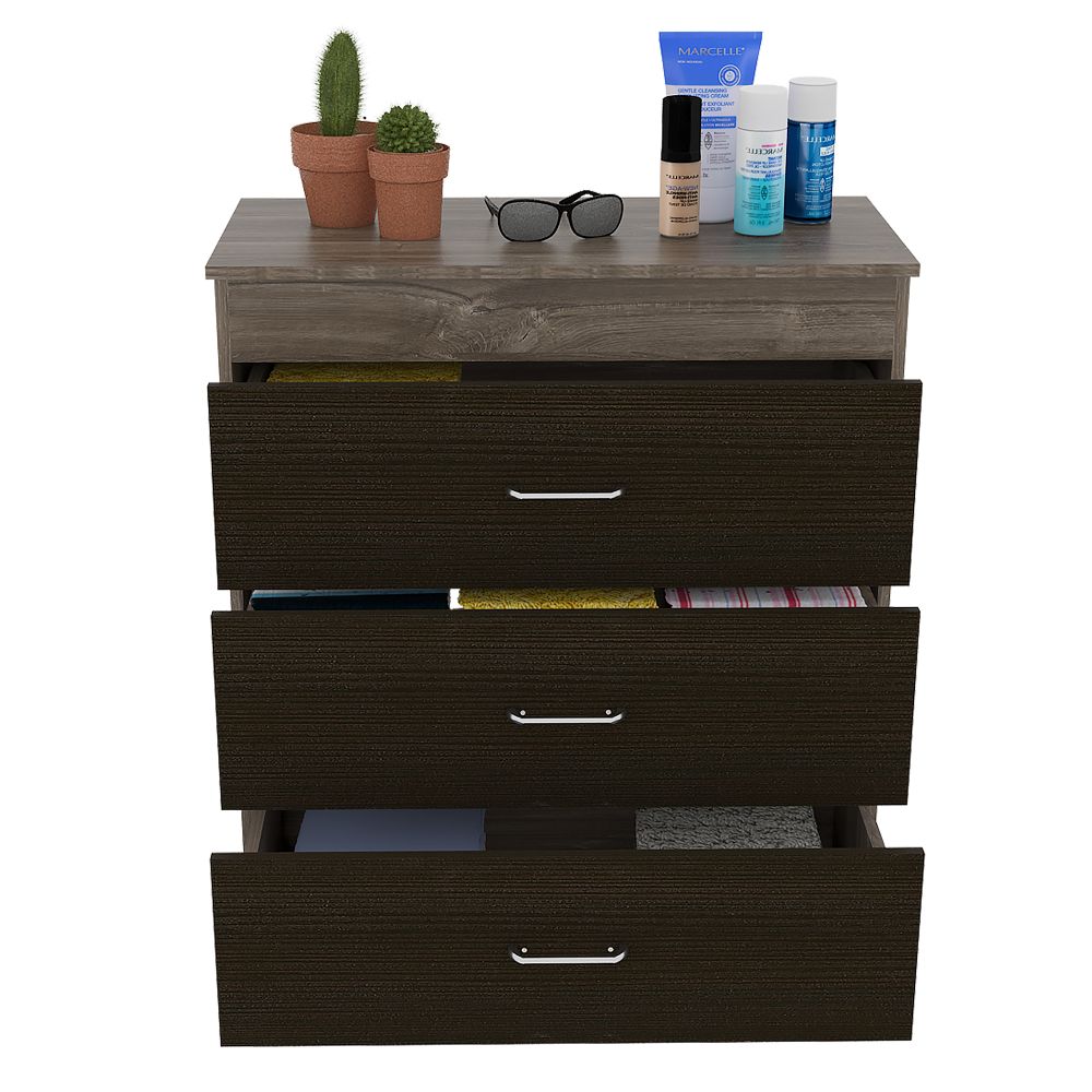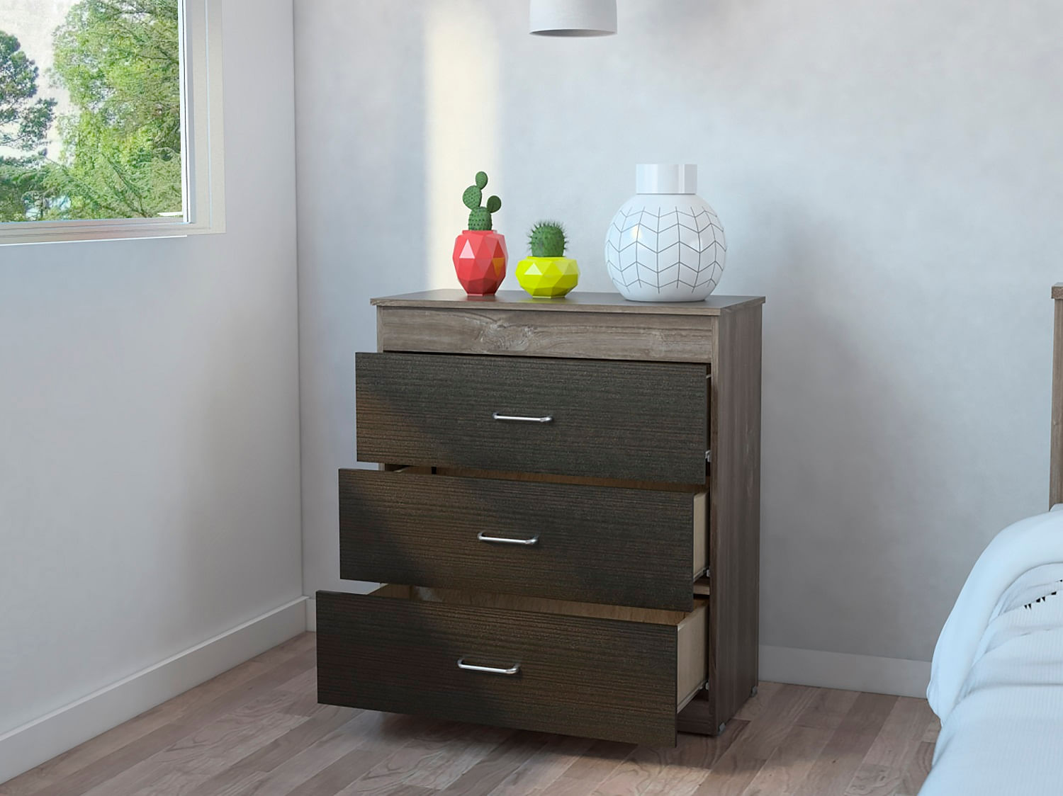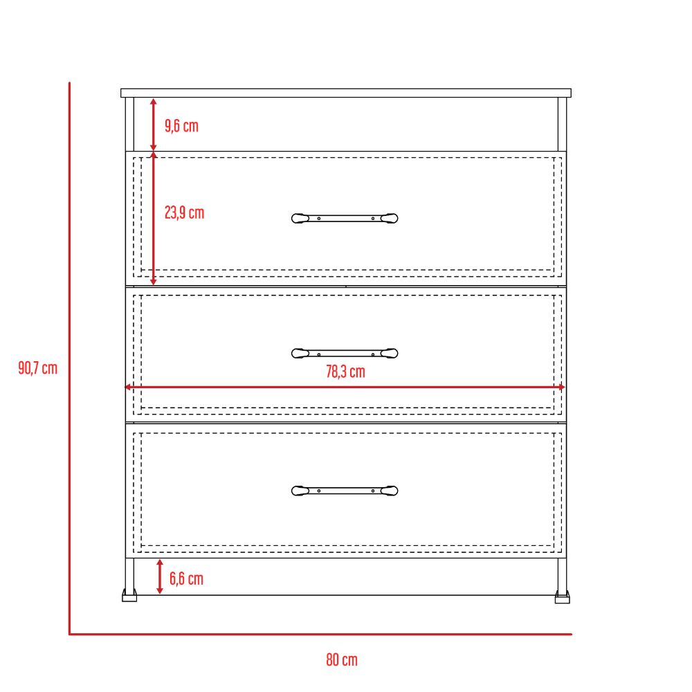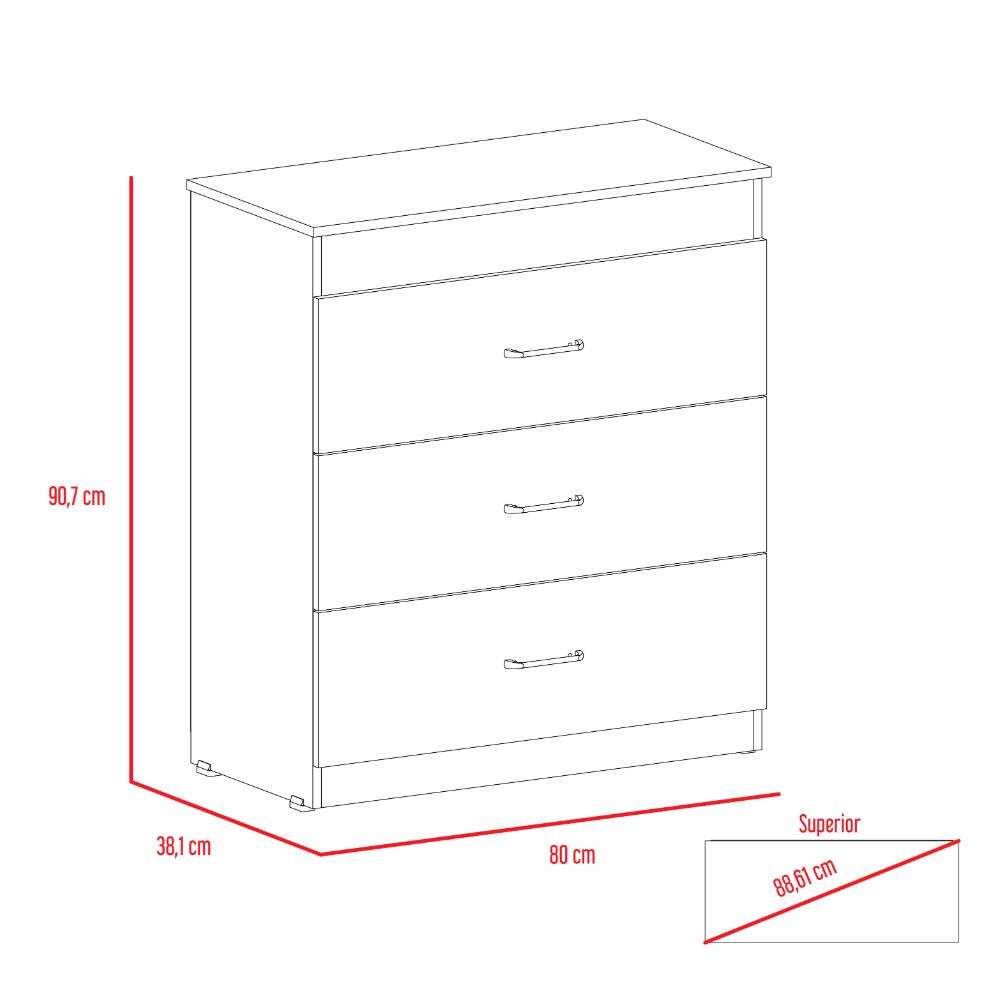 Diseño funcional, Espacio superior para colocar objetos decorativos o equipos de audio y video, tres cajones delizables con correderas metálicas, Manija metálica semi-arco. Posee unas medidas en CM de: Alto: 90,7 Ancho: 80 Fondo: 38,1 y un peso en KG de: 33 NO INCLUYE ARMADO, Hecho de madera aglomerada, limpiar en seco, no productos abrasivos, ni humedad alta , La foto de este producto ha sido ambientada, por lo cual no incluye ningún adorno, ni accesorios, ni piezas adicionales ni ningún otro elemento que lo acompañan. El color presentado en la fotografía es una aproximación al color real.