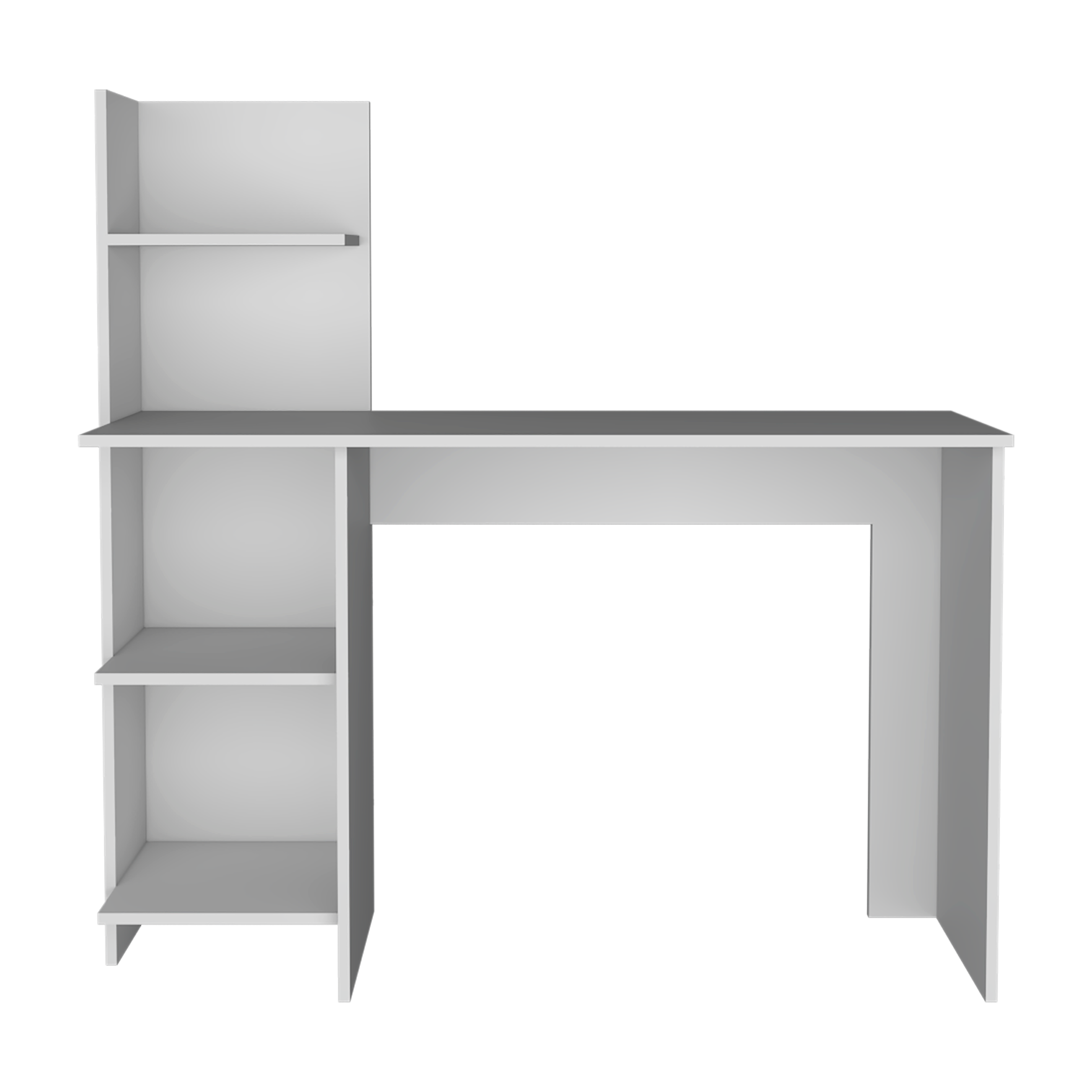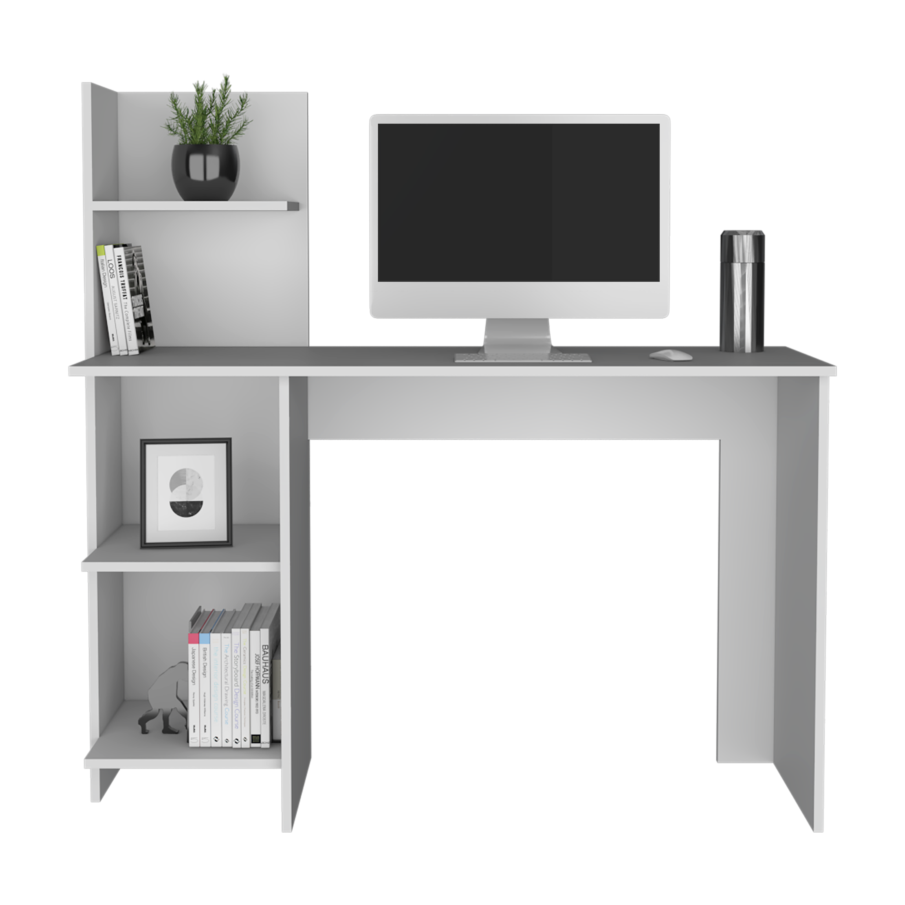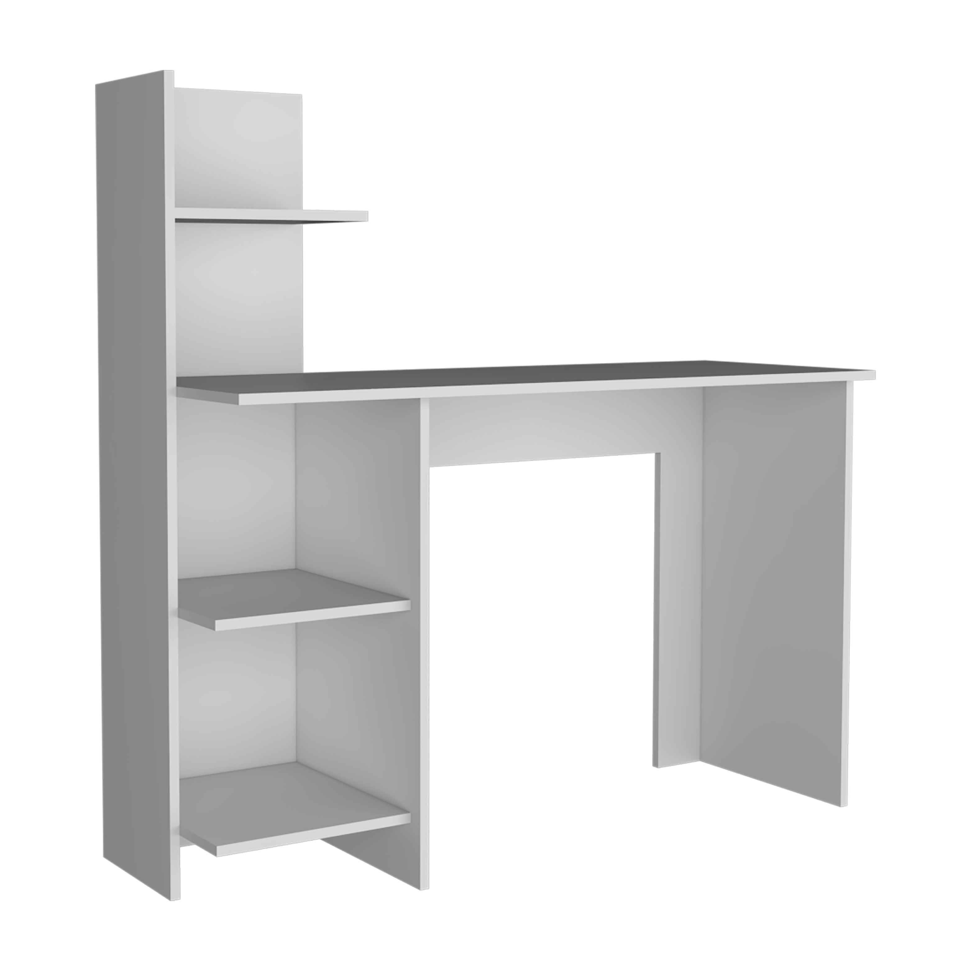 Escritorio 120 con amplia superficie de trabajo, entrepaños para ubicar libros y/o elementos decorativos, combinacion de colores con medidas de: ALTO 120,6 ANCHO 120 FONDO 45