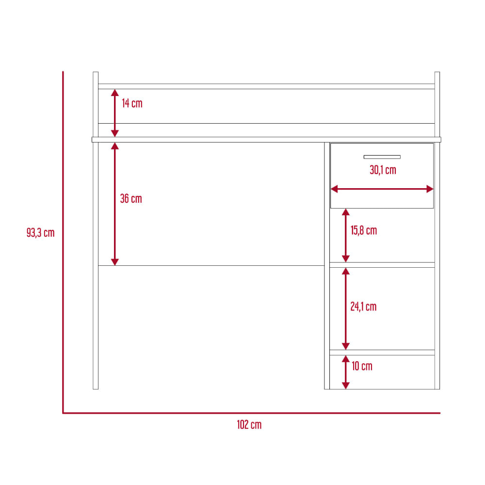 Escritorio para oficina hecho de madera aglomerada de 15mm. Cuenta con una amplia superficie de trabajo, entrepaños para ubicar libros y/o elementos decorativos, un cajón y manija metálica. Medidas: 93,3cm alto, 102cm ancho, 50cm fondo y un peso de 28,6 kg NO INCLUYE ARMADO, Hecho de madera aglomerada, limpiar en seco, no productos abrasivos, ni humedad alta , La foto de este producto ha sido ambientada, por lo cual no incluye ningún adorno, ni accesorios, ni piezas adicionales ni ningún otro elemento que lo acompañan. El color presentado en la fotografía es una aproximación al color real.