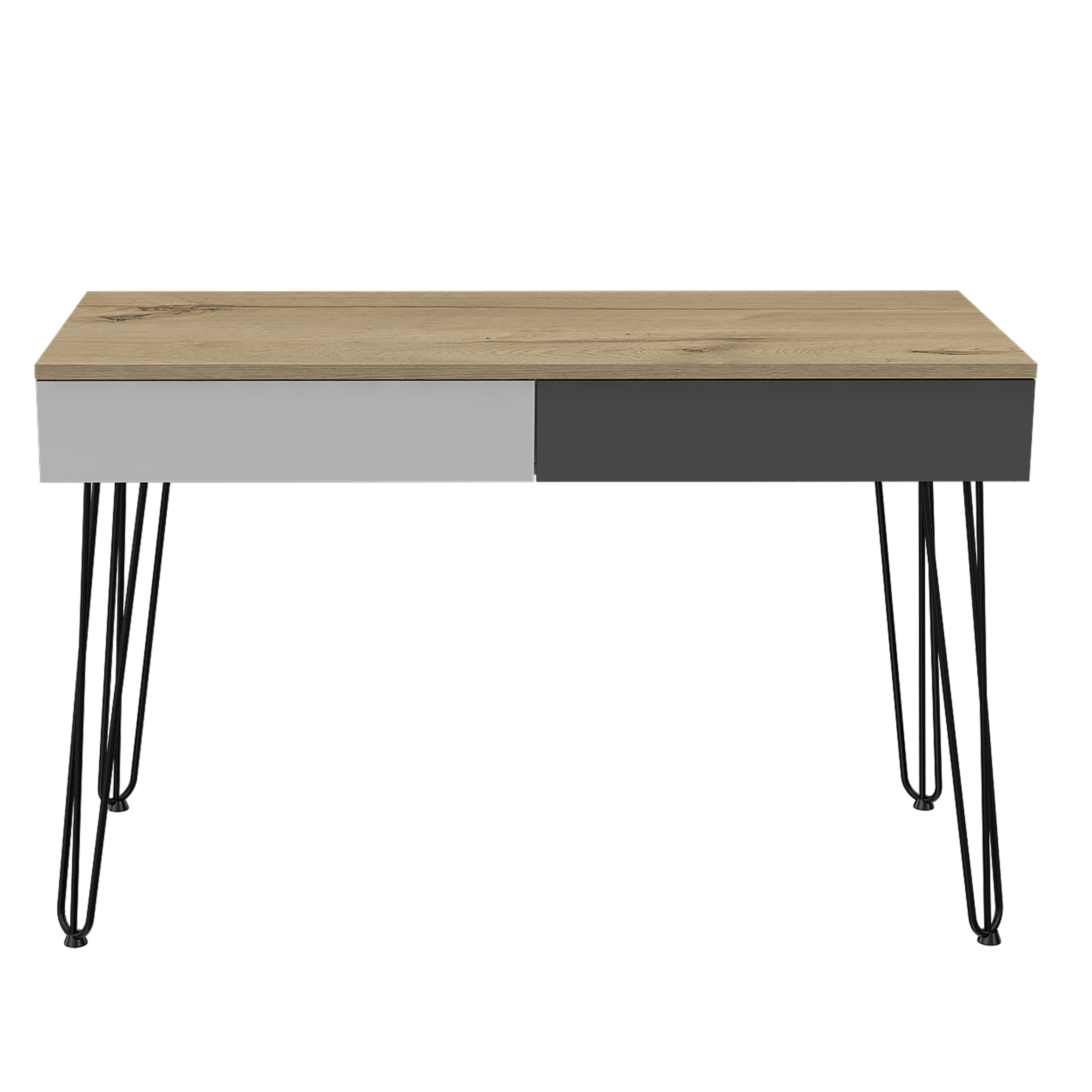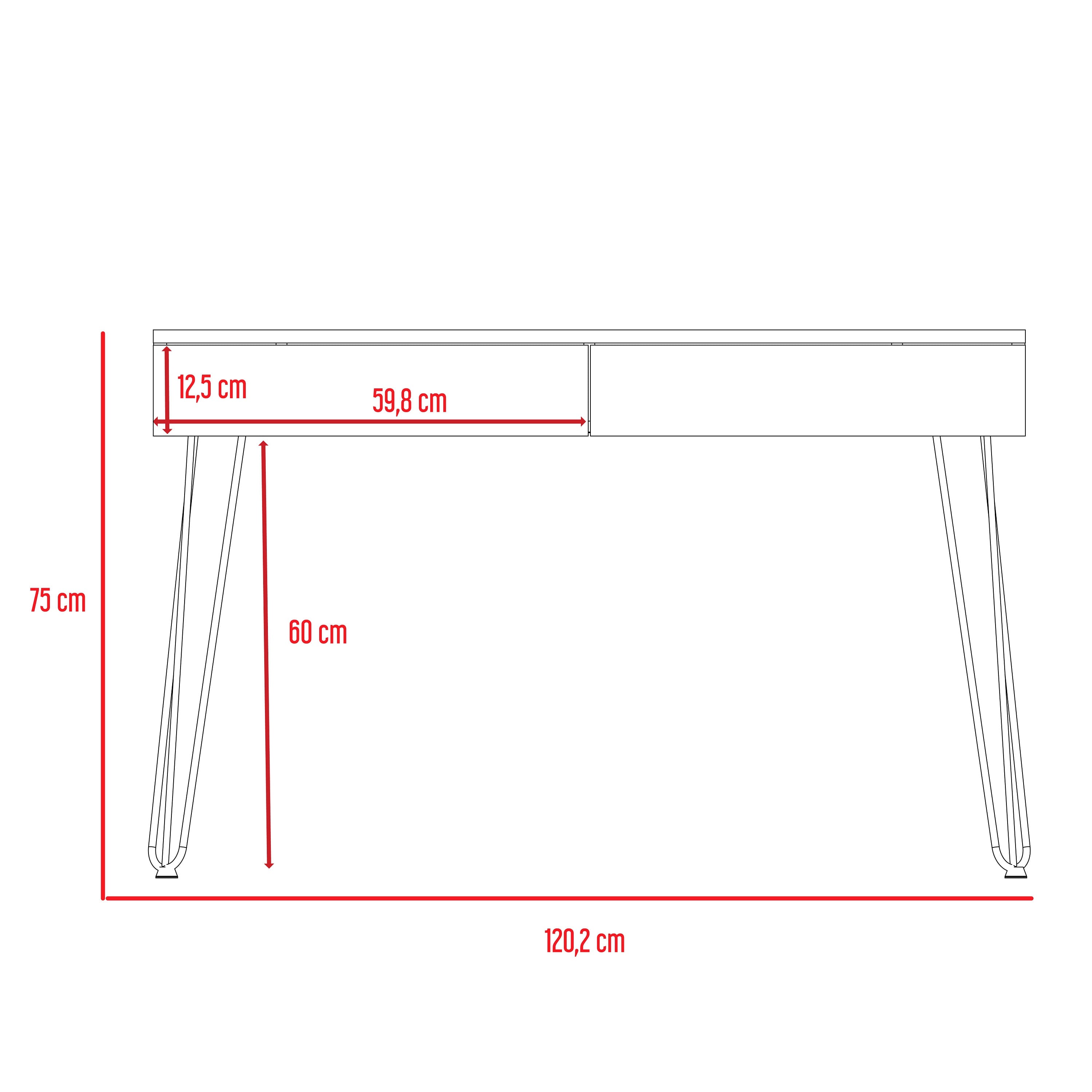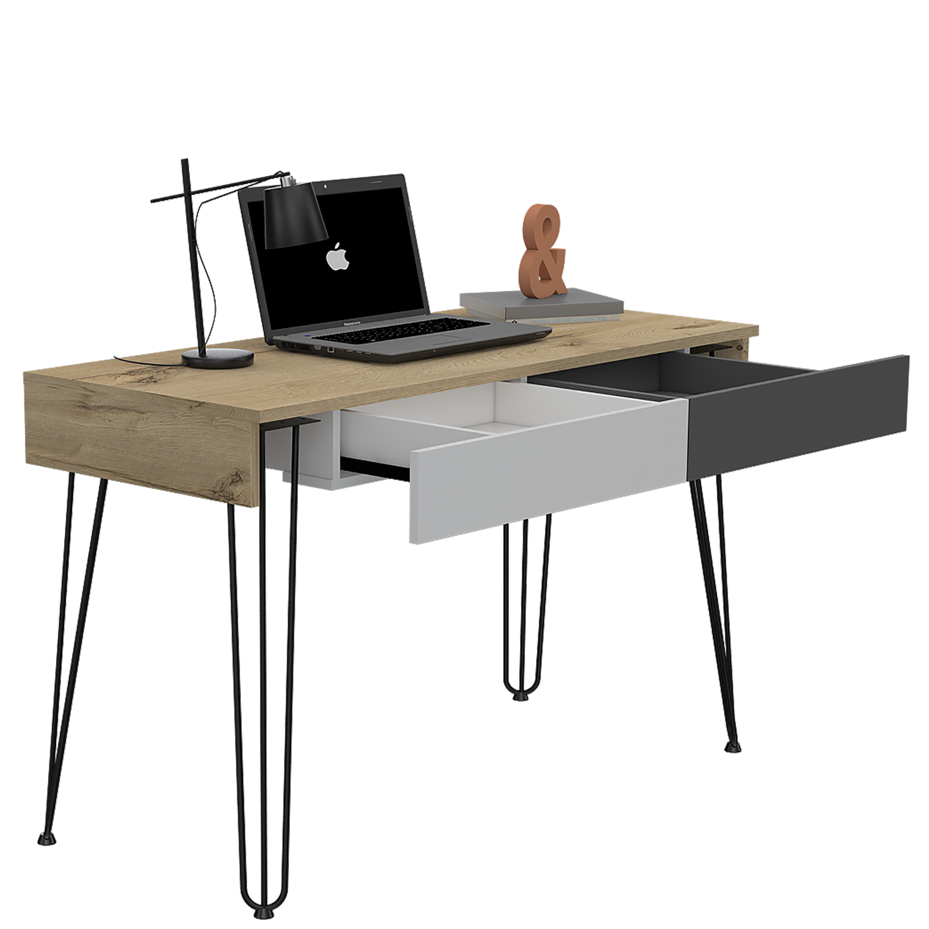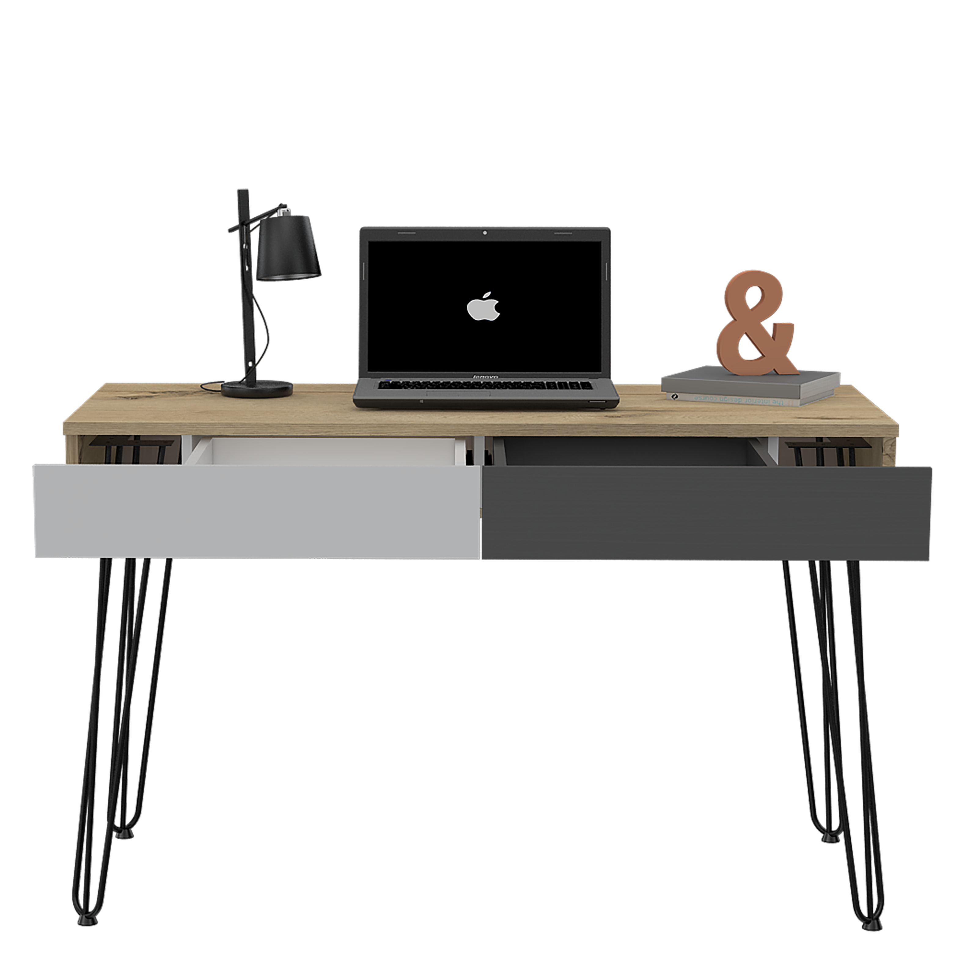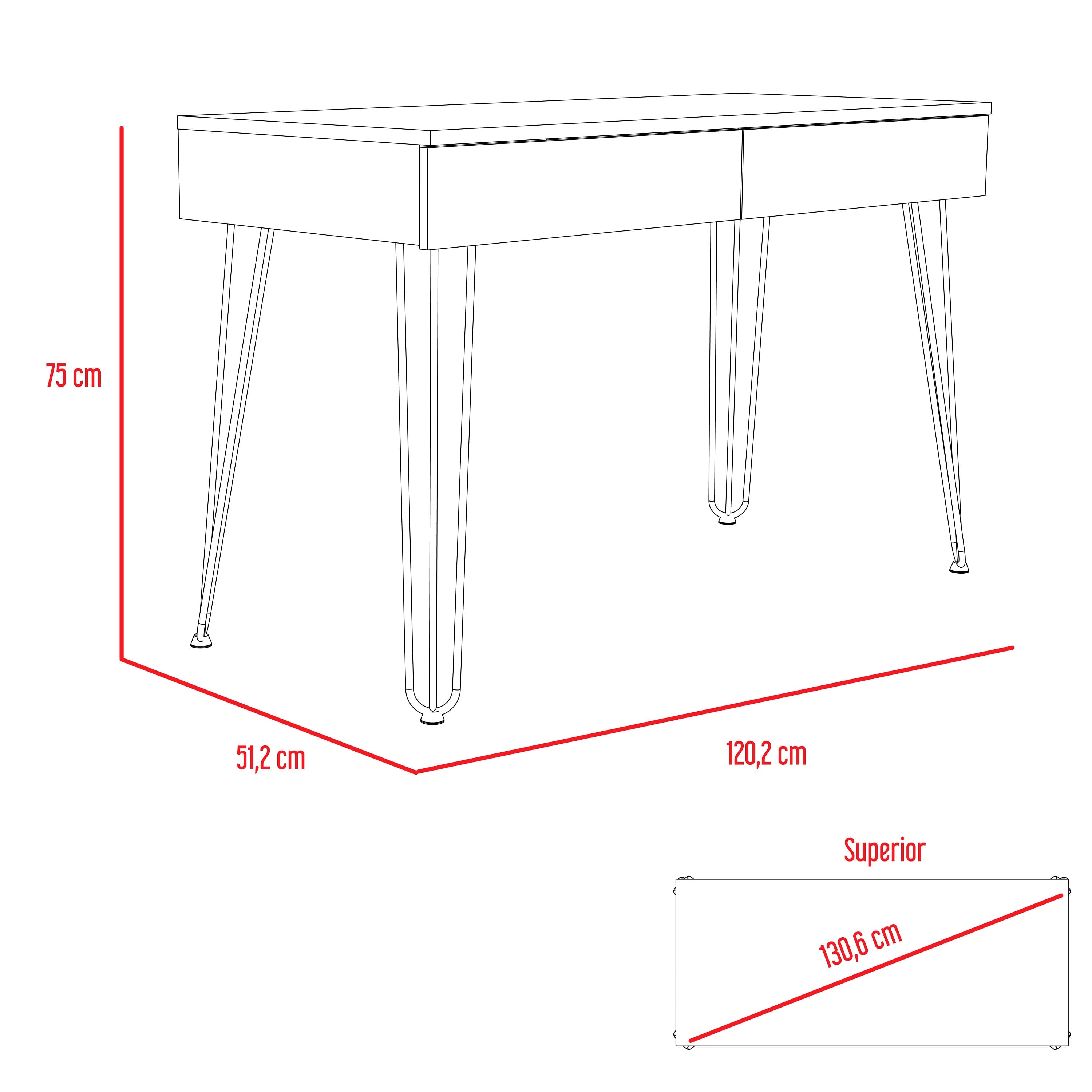 Amplia superficie de trabajo,combinación de colores, patas metálicas negras y dos cajones NO INCLUYE ARMADO, Hecho de madera aglomerada, limpiar en seco, no productos abrasivos, ni humedad alta , La foto de este producto ha sido ambientada, por lo cual no incluye ningún adorno, ni accesorios, ni piezas adicionales ni ningún otro elemento que lo acompañan. El color presentado en la fotografía es una aproximación al color real.