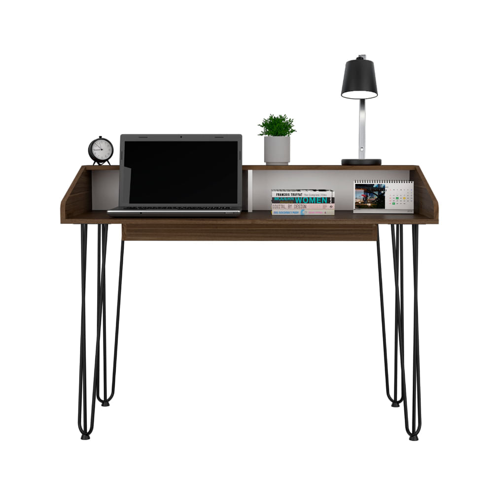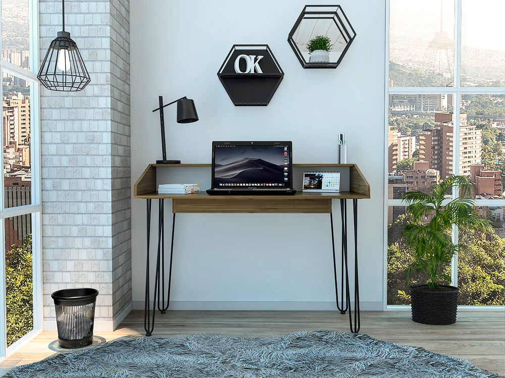 Escritorio para oficina hecho de madera aglomerada de 15mm. Cuenta con una amplia superficie de trabajo, combinación de colores y patas metálicas negras. Medidas: 90cm alto, 120,1cm ancho, 55,2cm fondo y un peso de 18,8 kg NO INCLUYE ARMADO, Hecho de madera aglomerada, limpiar en seco, no productos abrasivos, ni humedad alta , La foto de este producto ha sido ambientada, por lo cual no incluye ningún adorno, ni accesorios, ni piezas adicionales ni ningún otro elemento que lo acompañan. El color presentado en la fotografía es una aproximación al color real.