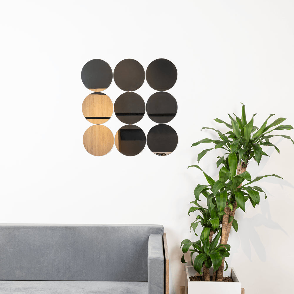 Set de 9 espejos circulares en Cal 4mm; incluye 2 tiras de cinta doble faz por cada espejo para facilitar su instalación.
