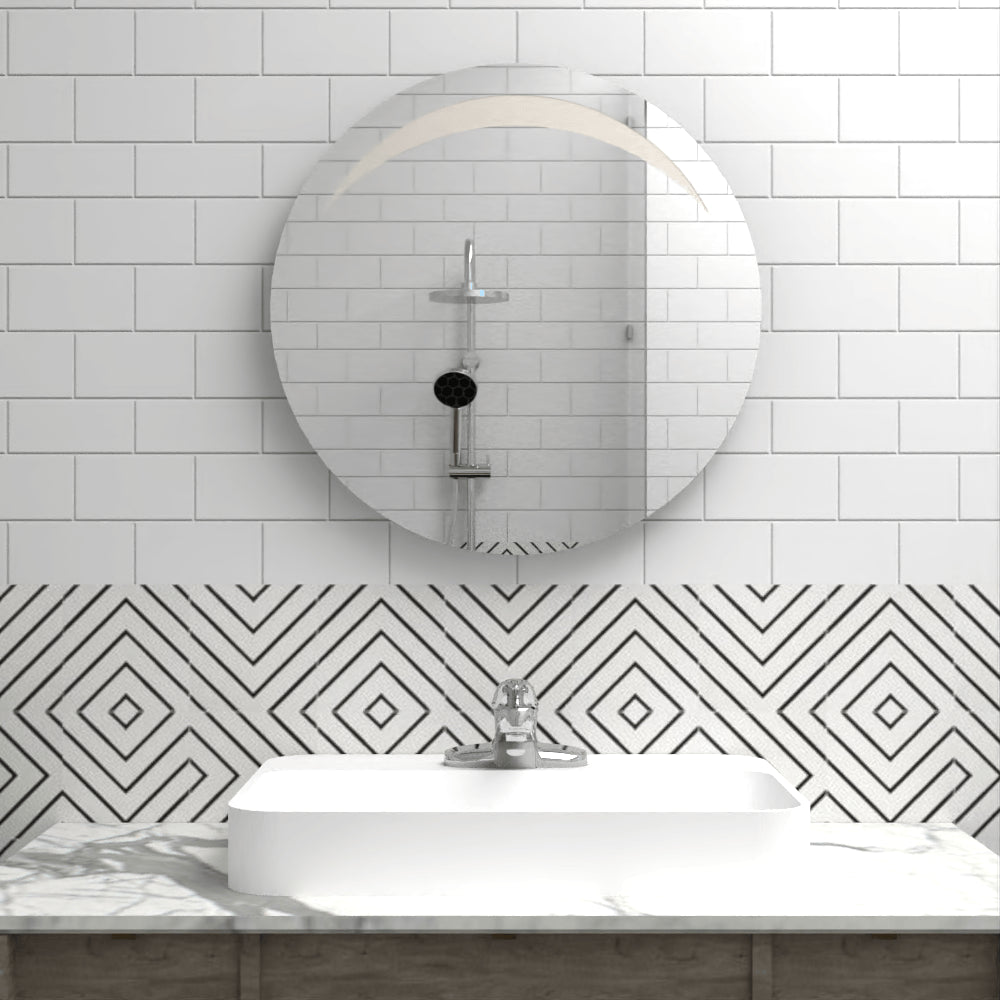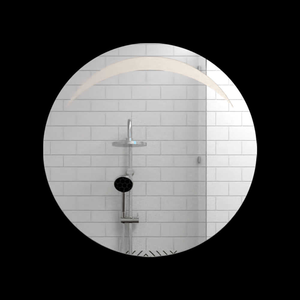 Espejo redondo con diseño en sandblasting en la parte superior, ensamble a la pared con chaflan