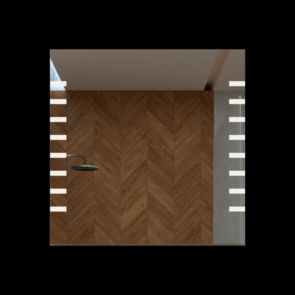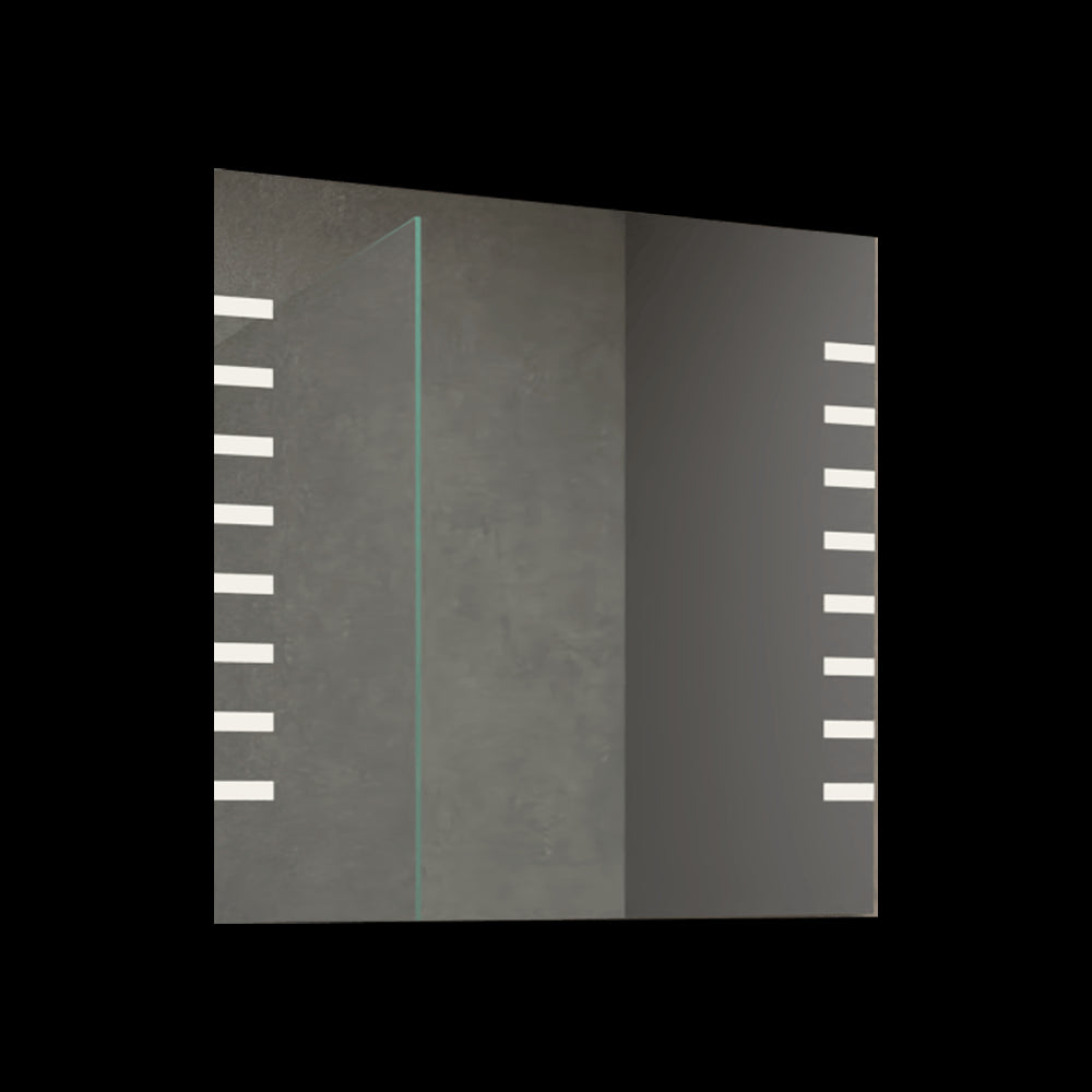Espejo cuadrado con franjas laterales en sandblastin, con luz led, y ensamble a pared con chaflan