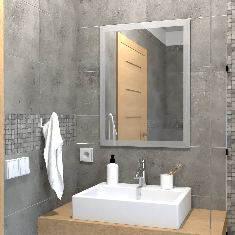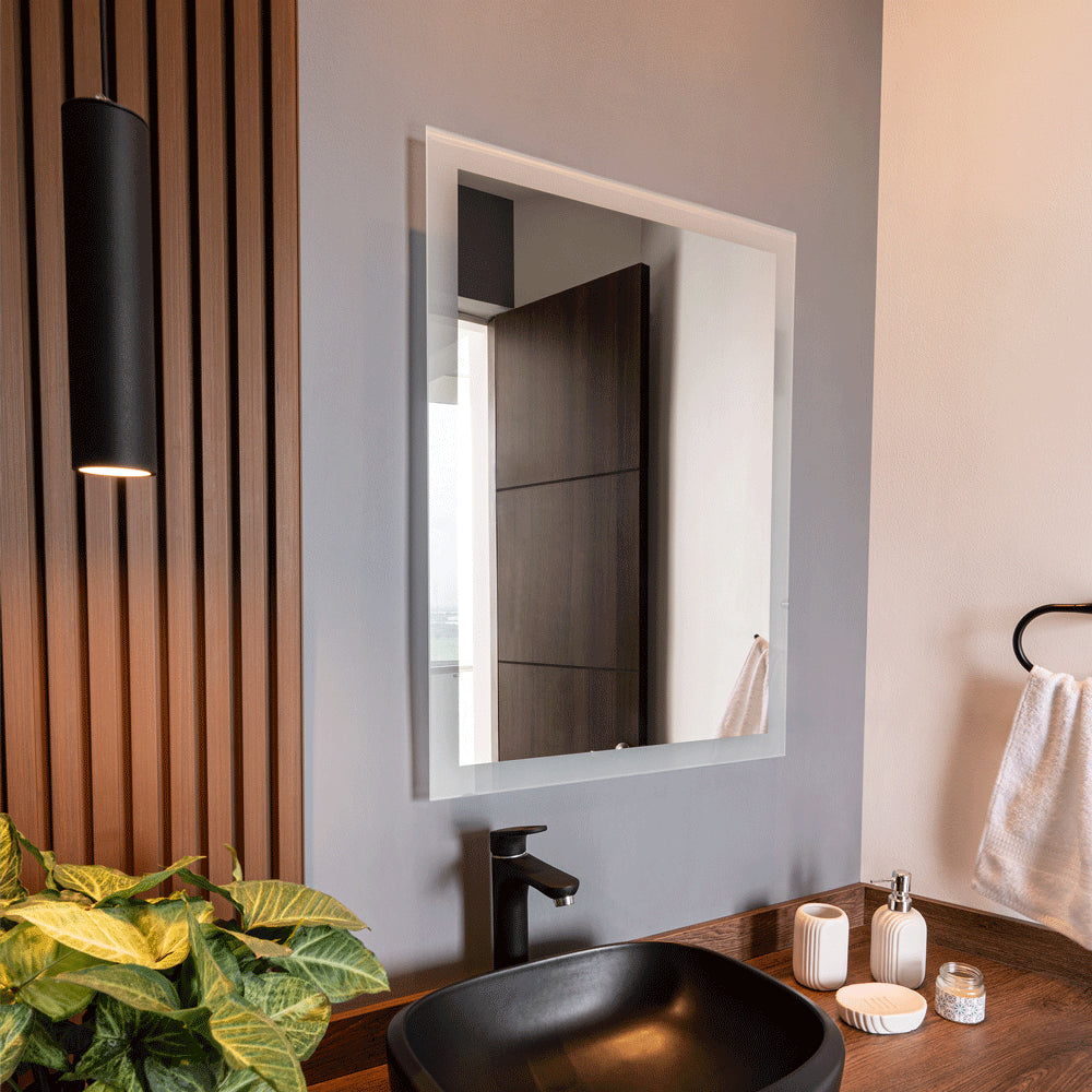 Espejo rectangular con sandblasting lateral, y ensamble a pared con chaflan