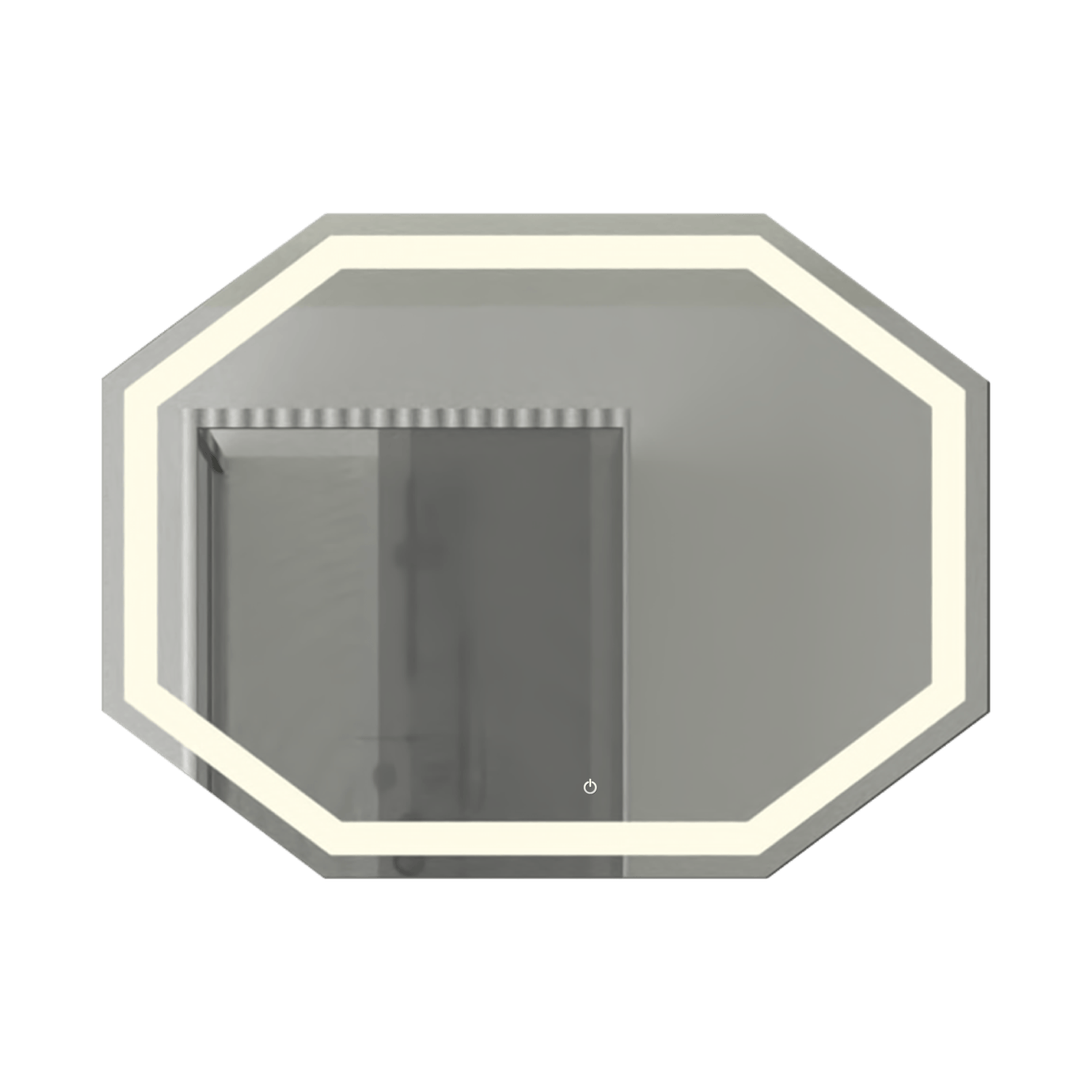 Espejo con forma hexagonal, con diseño sandblasting, con luz led+touch y ensamble a la pared con chaflan