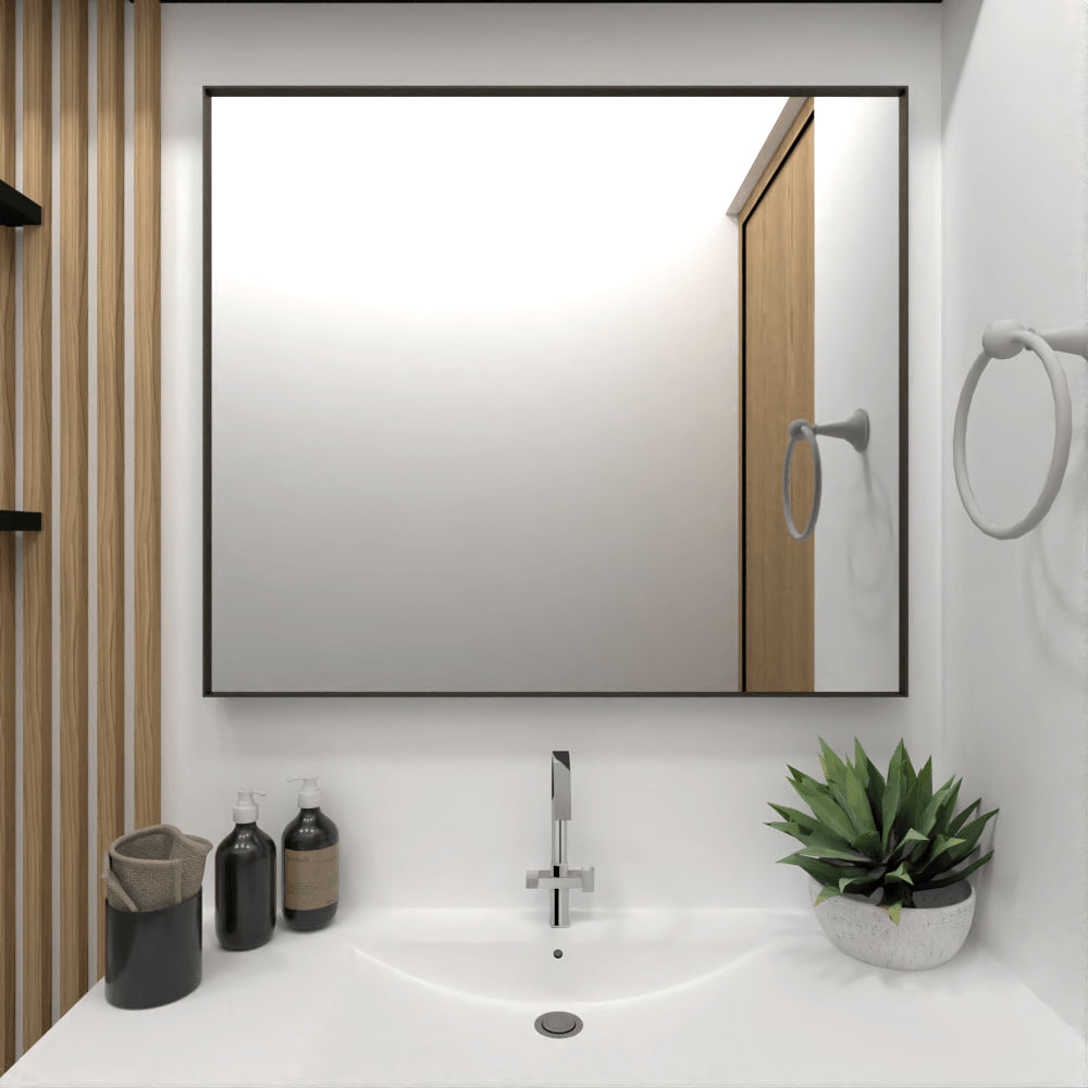 Espejo rectangular con estructura metalica en aluminio negro, ensamble a la pared con chaflan.