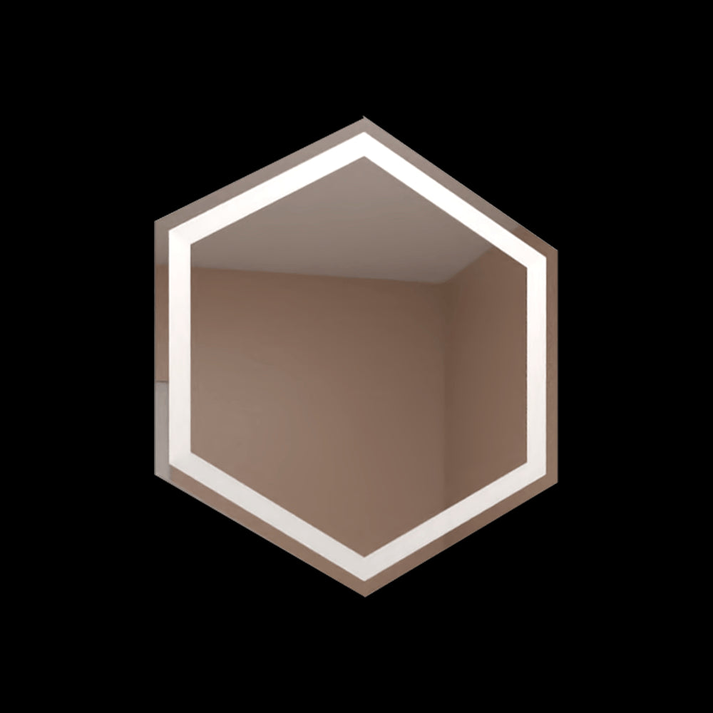 Espejo con forma hexagonal, con diseño sandblasting, con luz led y ensamble a la pared con chaflan