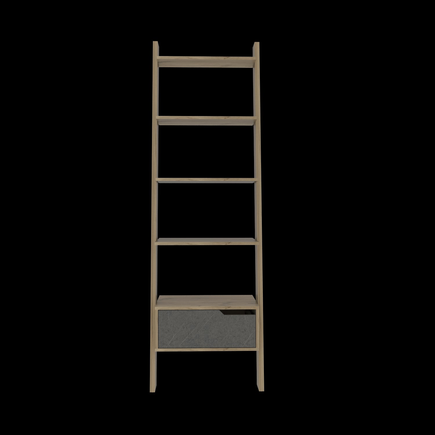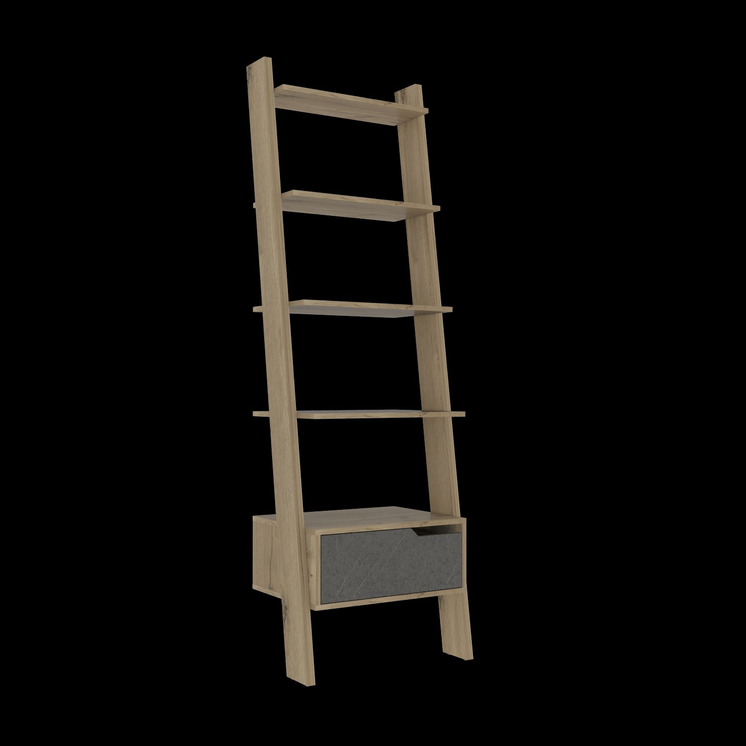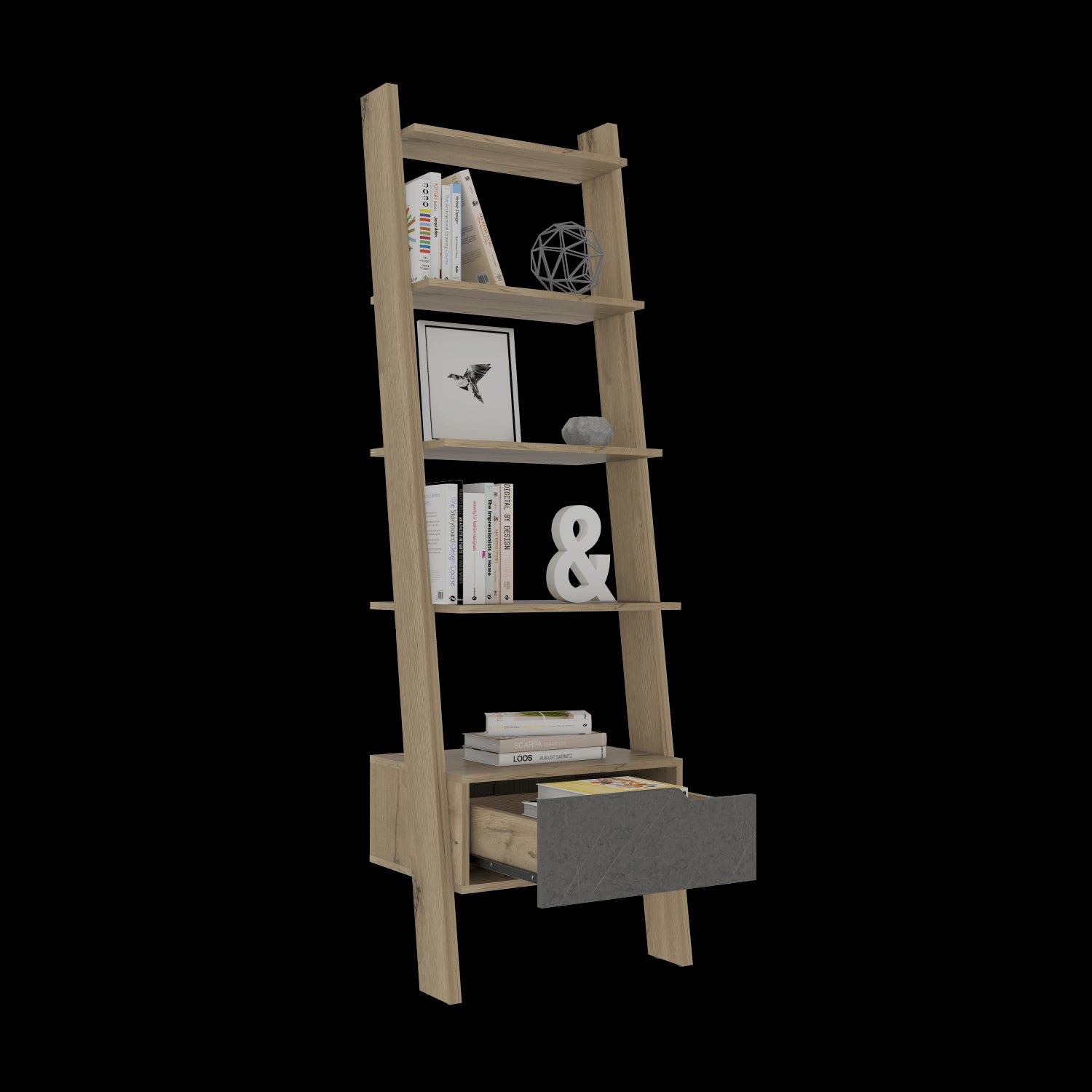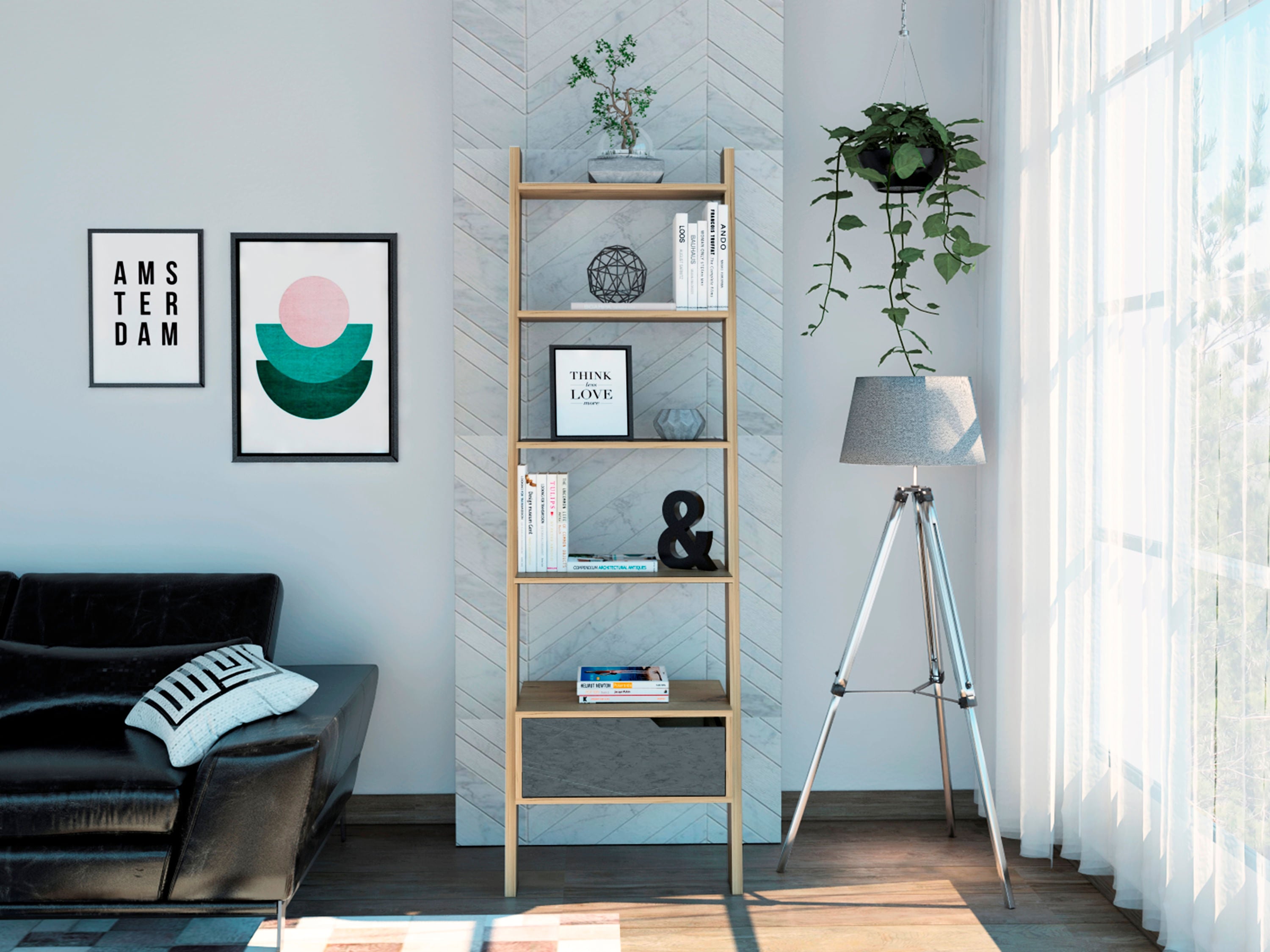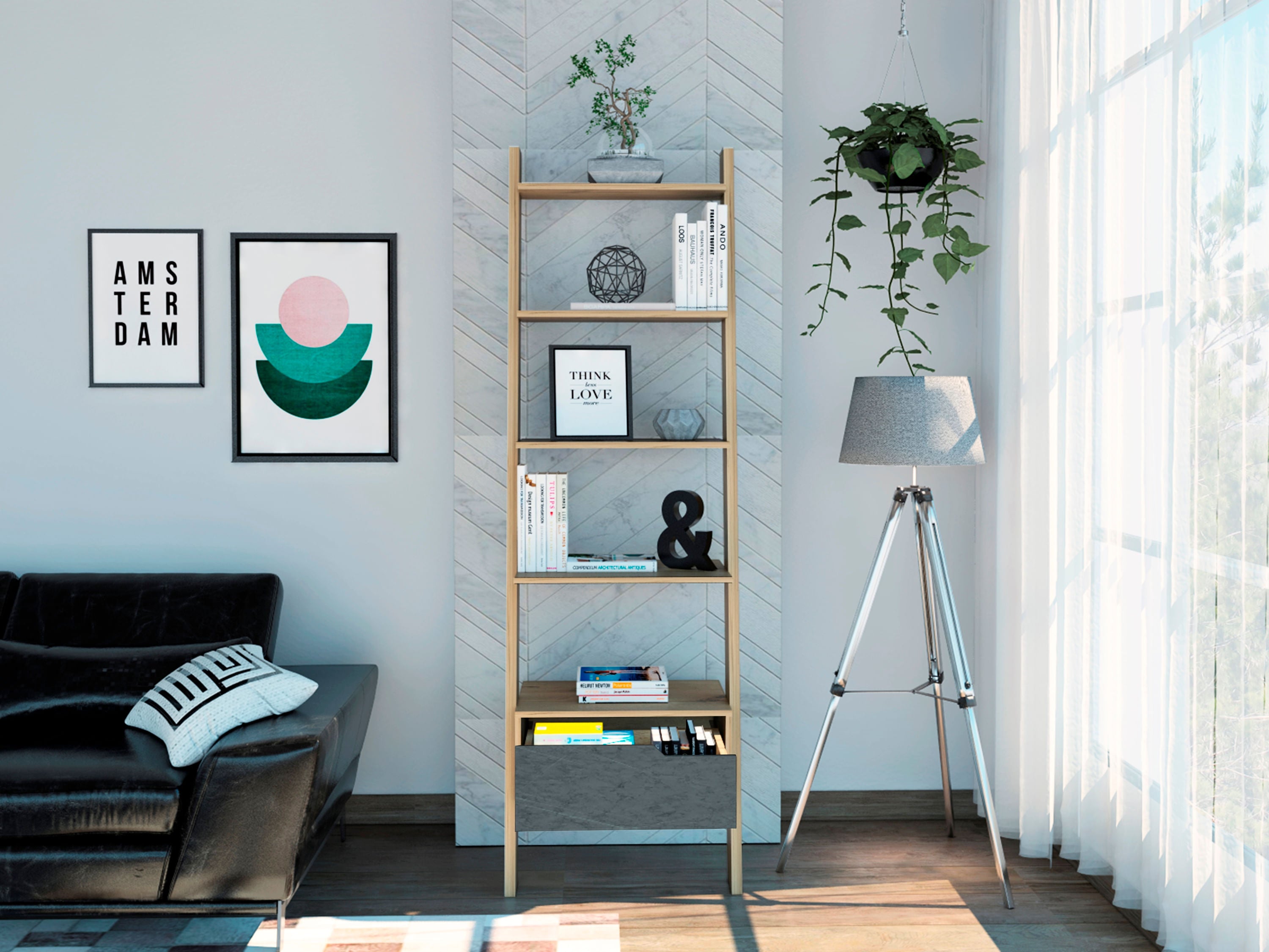 Estanteria con cajon para almacenamiento, entrepaños para ubicar libros y/o elementos decorativos, diseño moderno con combinacion de colores con medidas de: ANCHO 56 ALTO 178,6 PROFUNDO 39